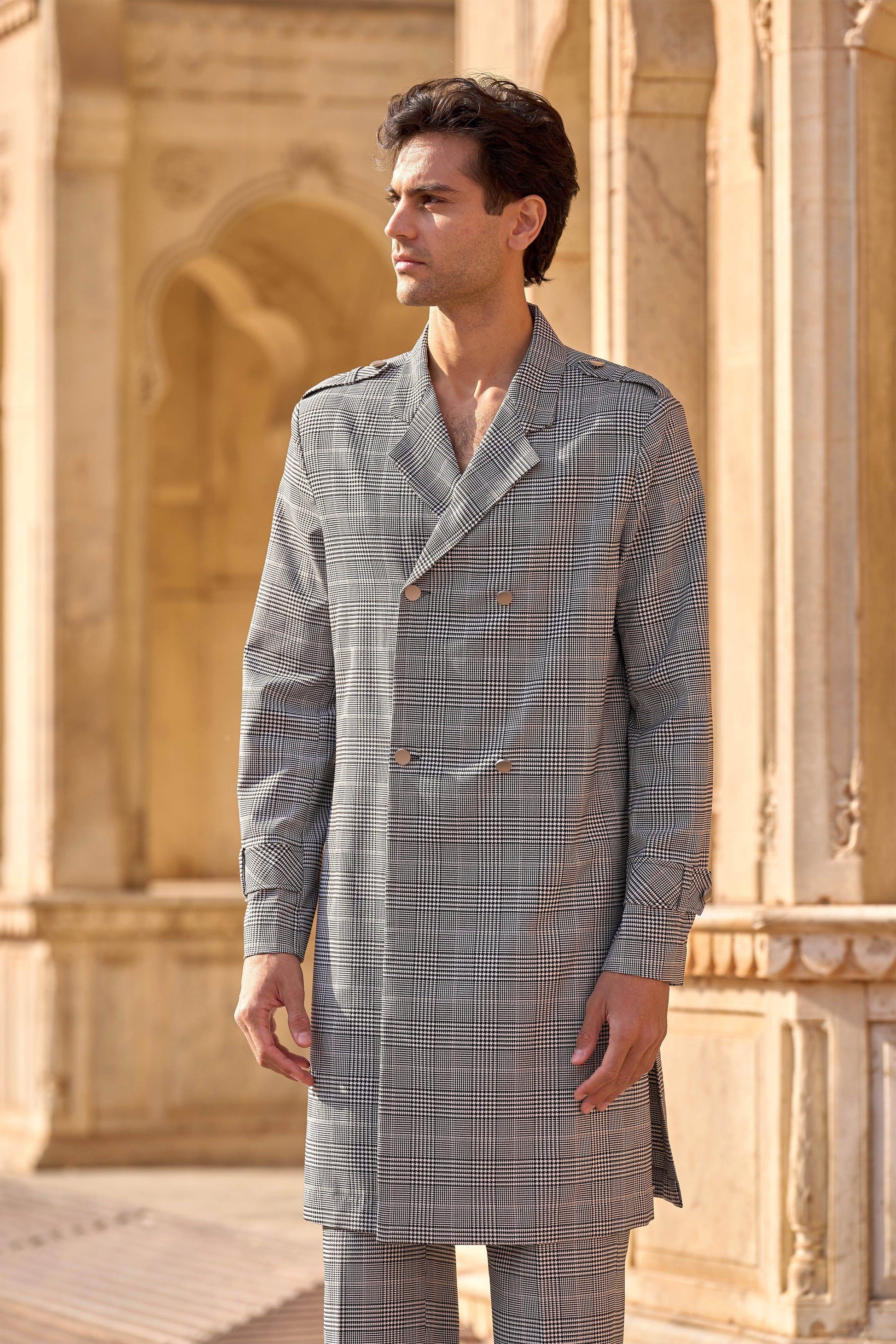 Grey, black and white houndstooth check patterned all weather suiting material straight fit trouser. Flat-front waist with hook and eye for closure. Belt loops at waist, pockets in the side and back.