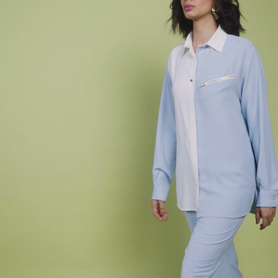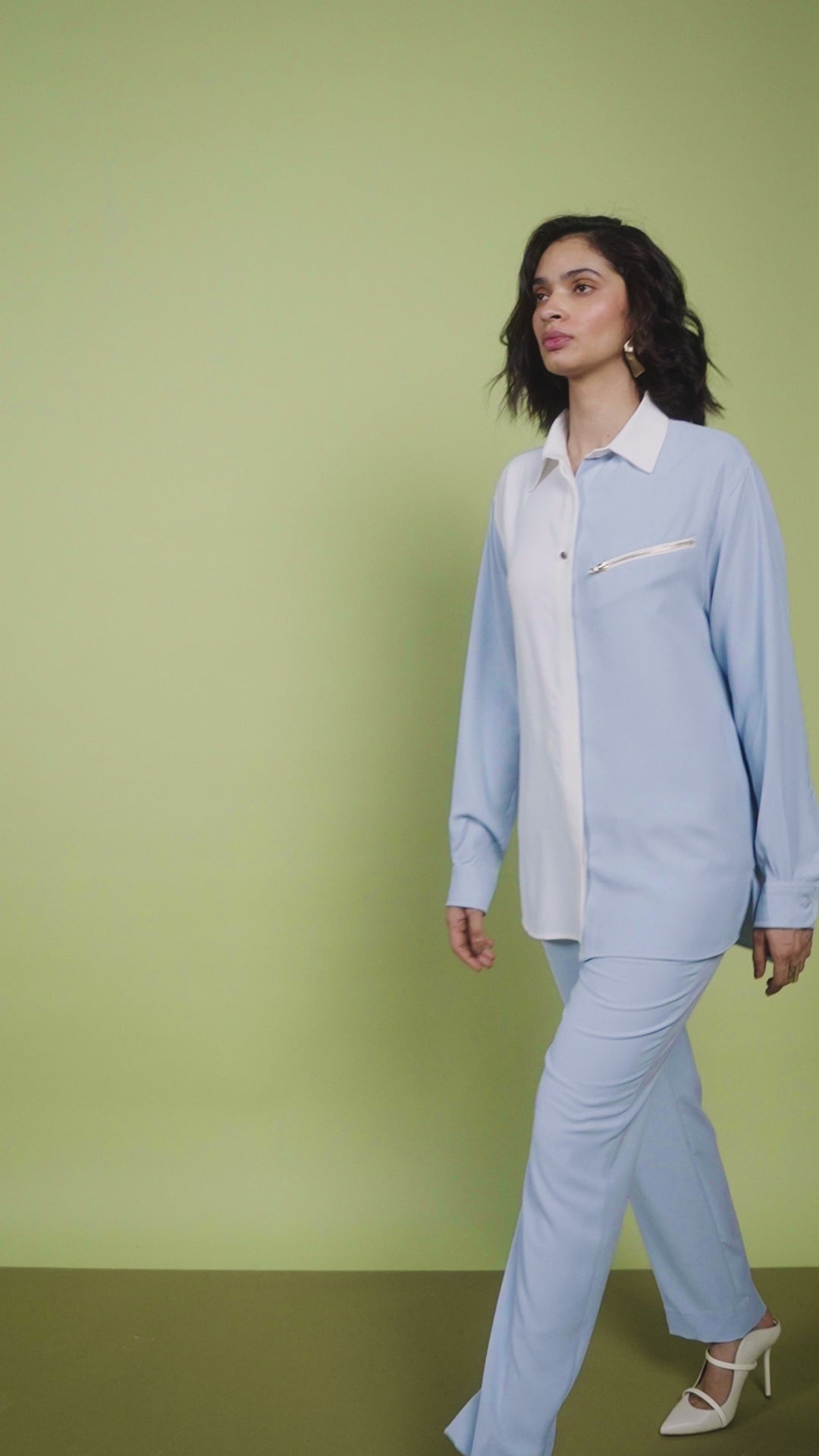 Pastel blue and white color-blocked shirt with a single gold button and zip detail on the front. Full sleeves, concealed placket, and shirt collar. High-low hem with side seam slits. Concealed pocket with gold zipper detail. Soft pleating on the back yoke for added shape.