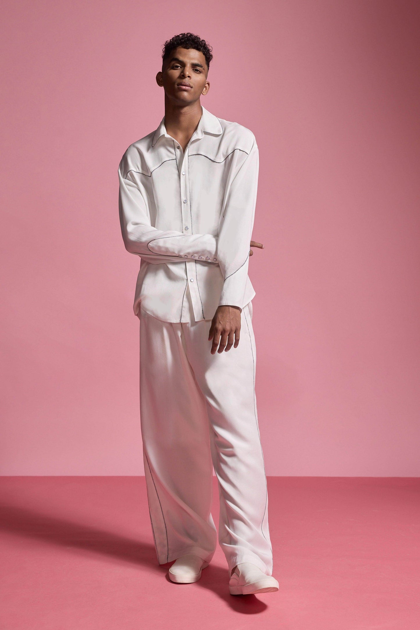 Off-white shirt with decorative piping inserts on the collar, placket, front yoke, back yoke, and sleeve cuffs, inspired by old Western style. Features snap pearl buttons on the front placket and exaggerated sleeve cuffs. Made from sustainable, breathable Tencel.