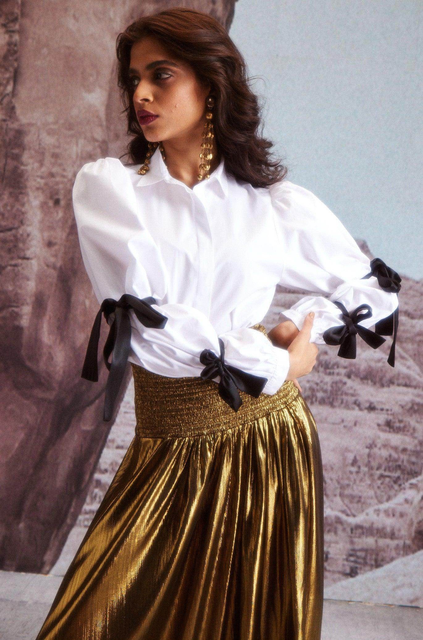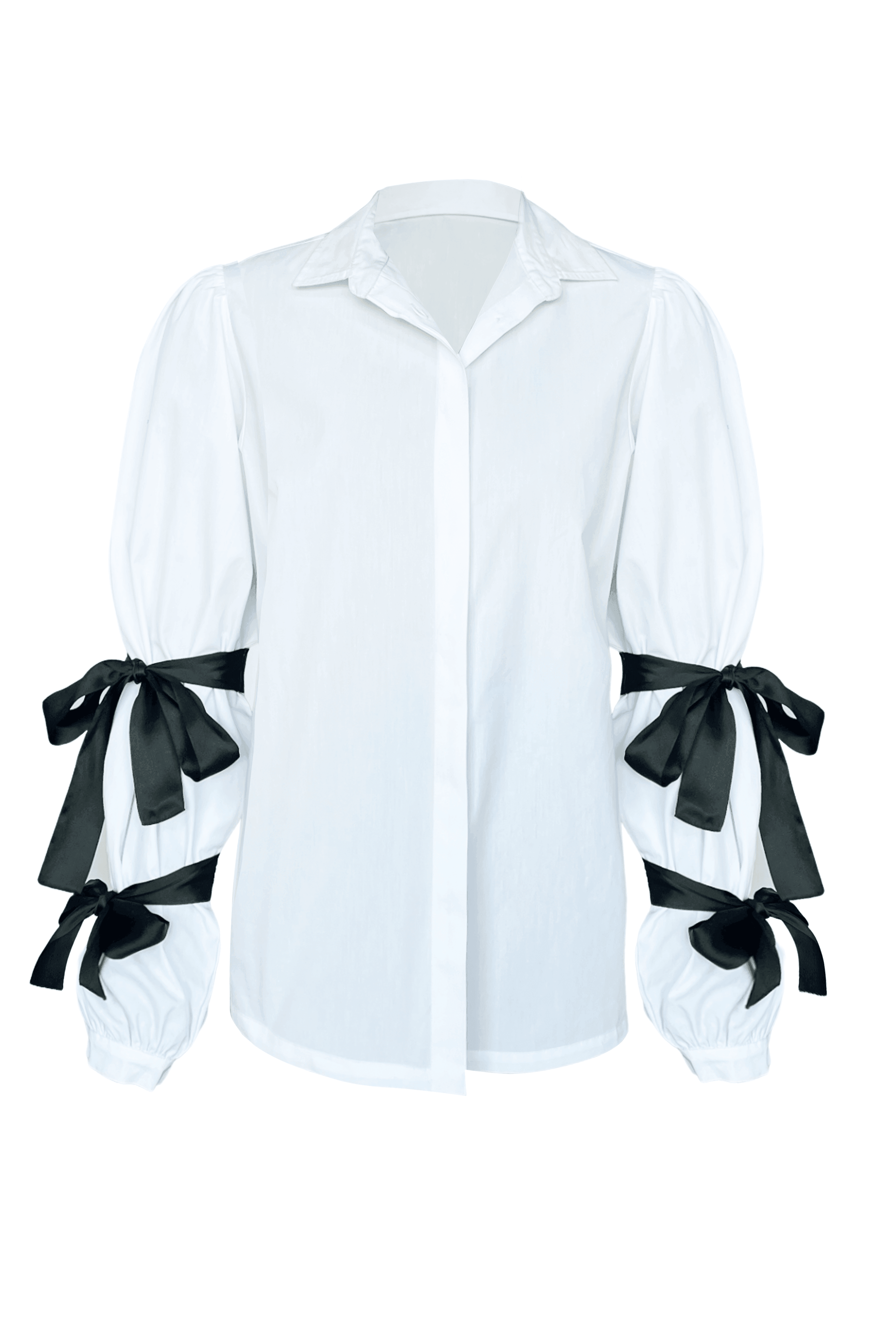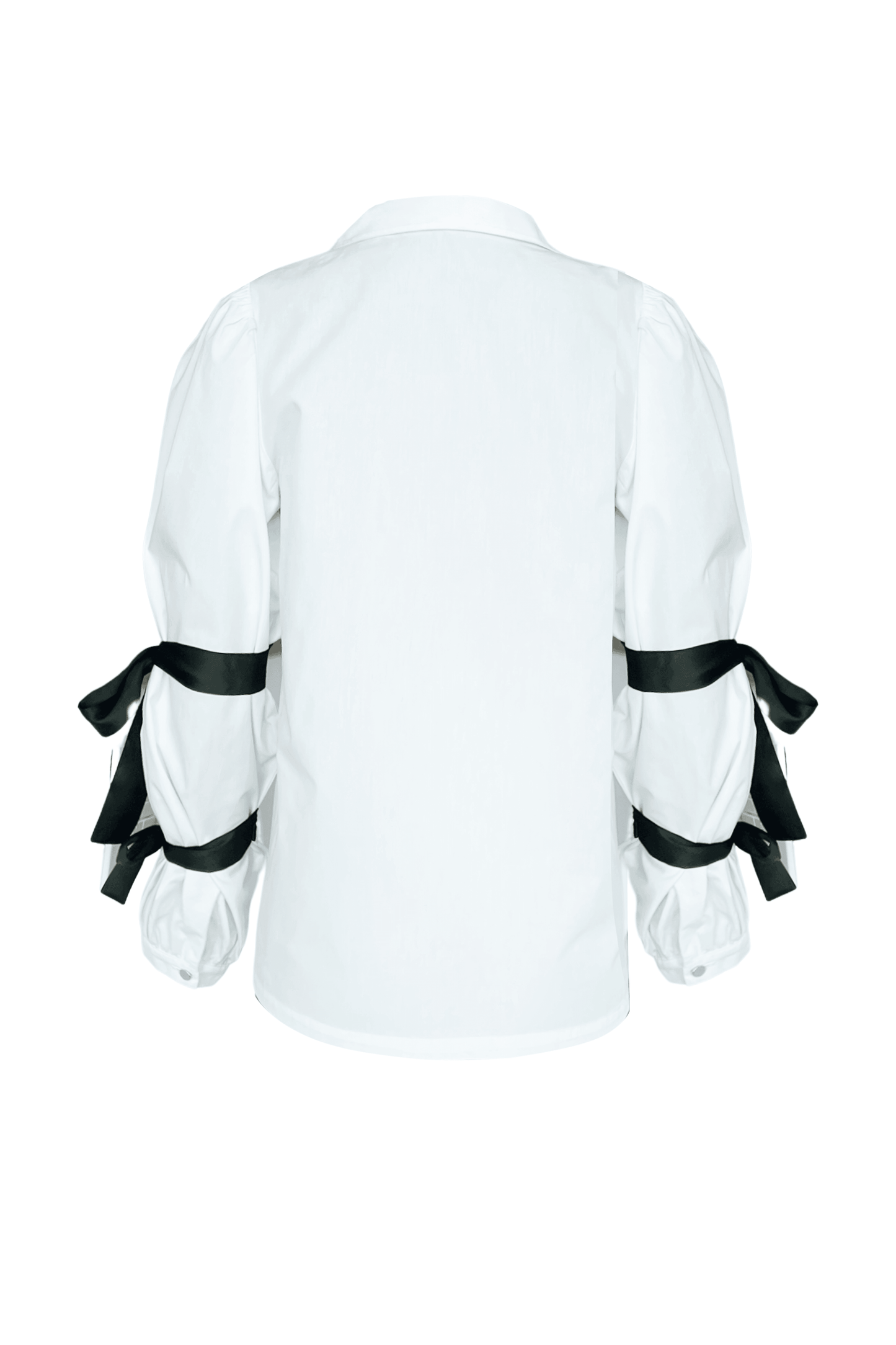 White cotton poplin shirt with matador-inspired sleeves. Black satin bow tie-up detailing on the sleeves to create shape. Concealed button placket, metal button closure at the cuff. Regular fit.