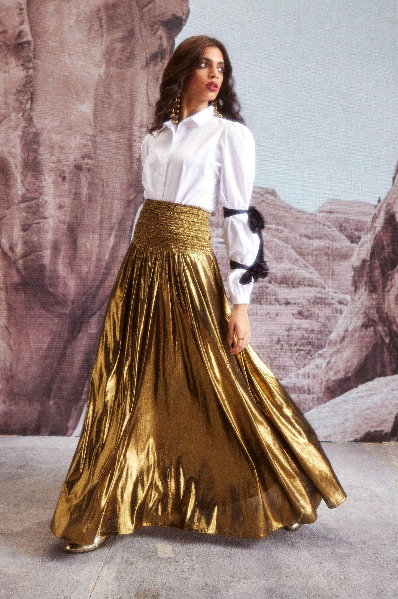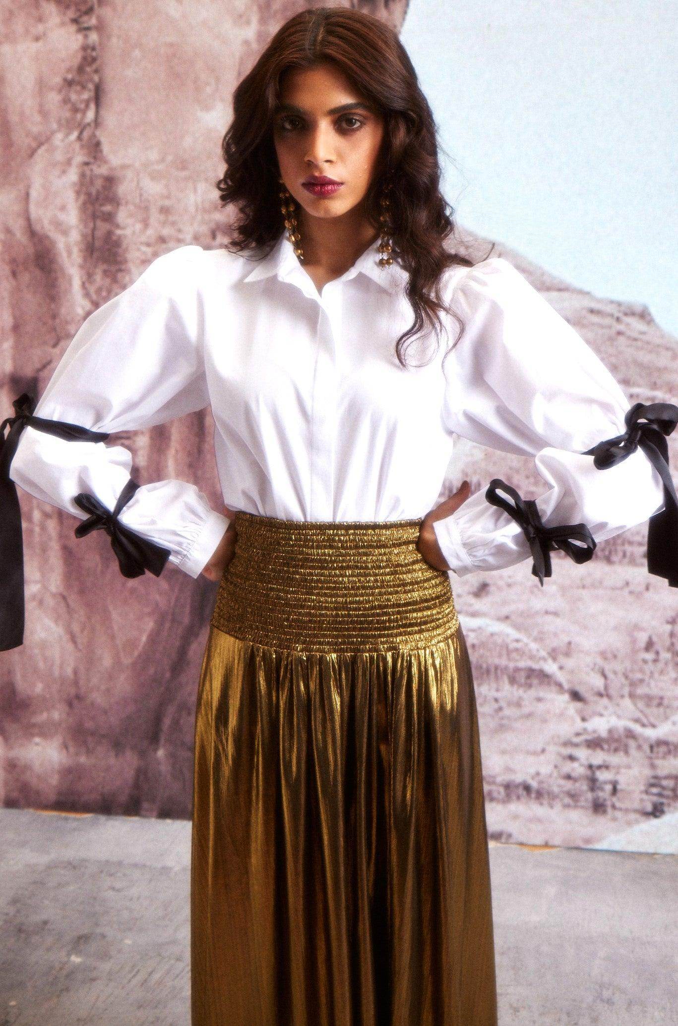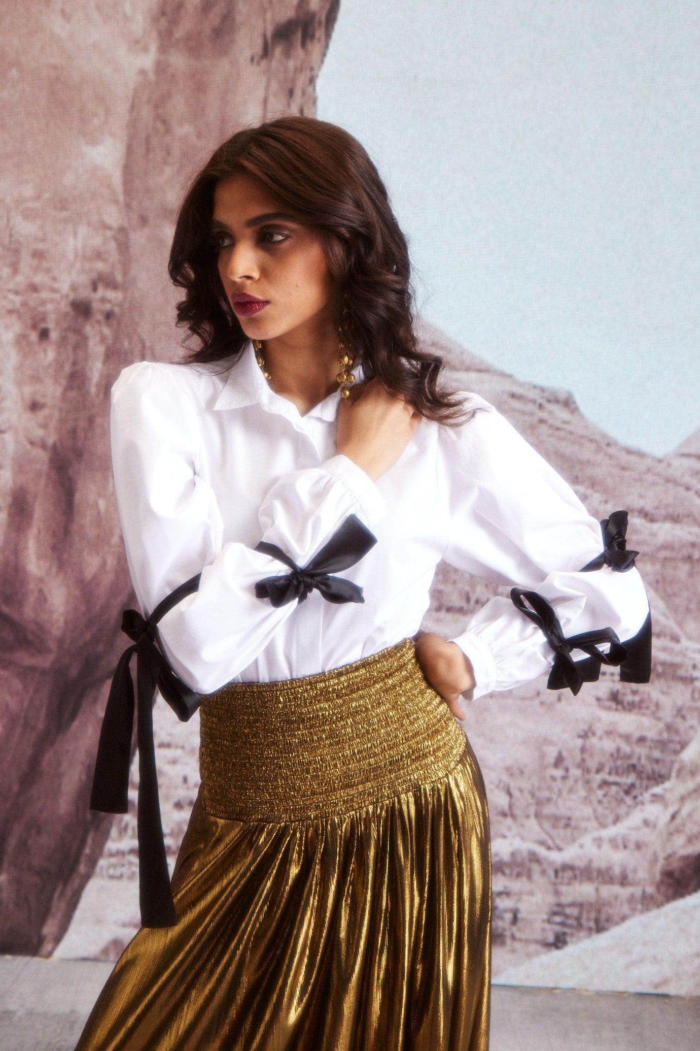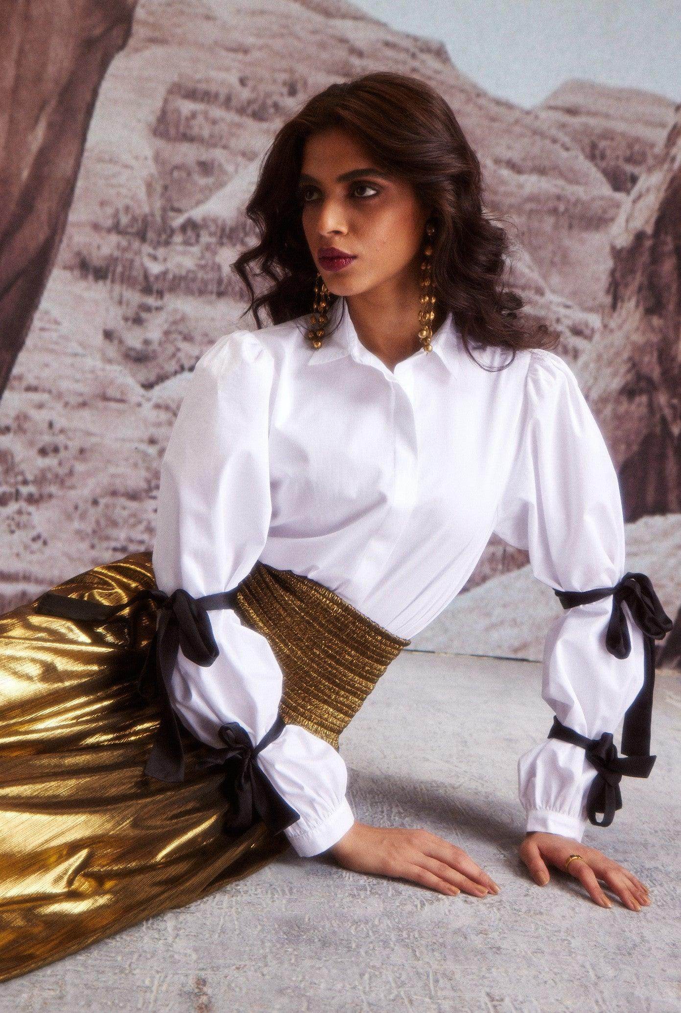 White cotton poplin shirt with matador-inspired sleeves. Black satin bow tie-up detailing on the sleeves to create shape. Concealed button placket, metal button closure at the cuff. Regular fit.