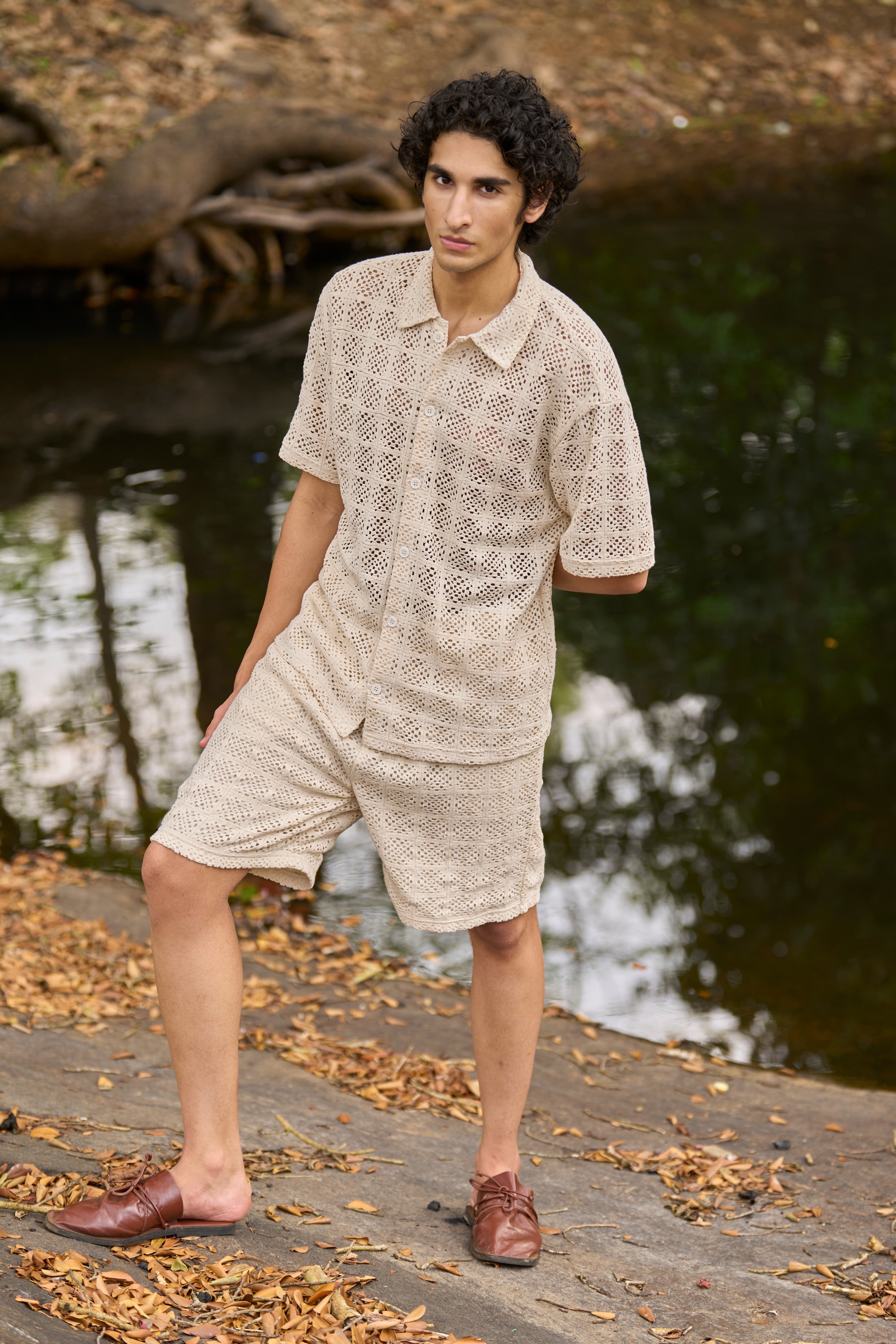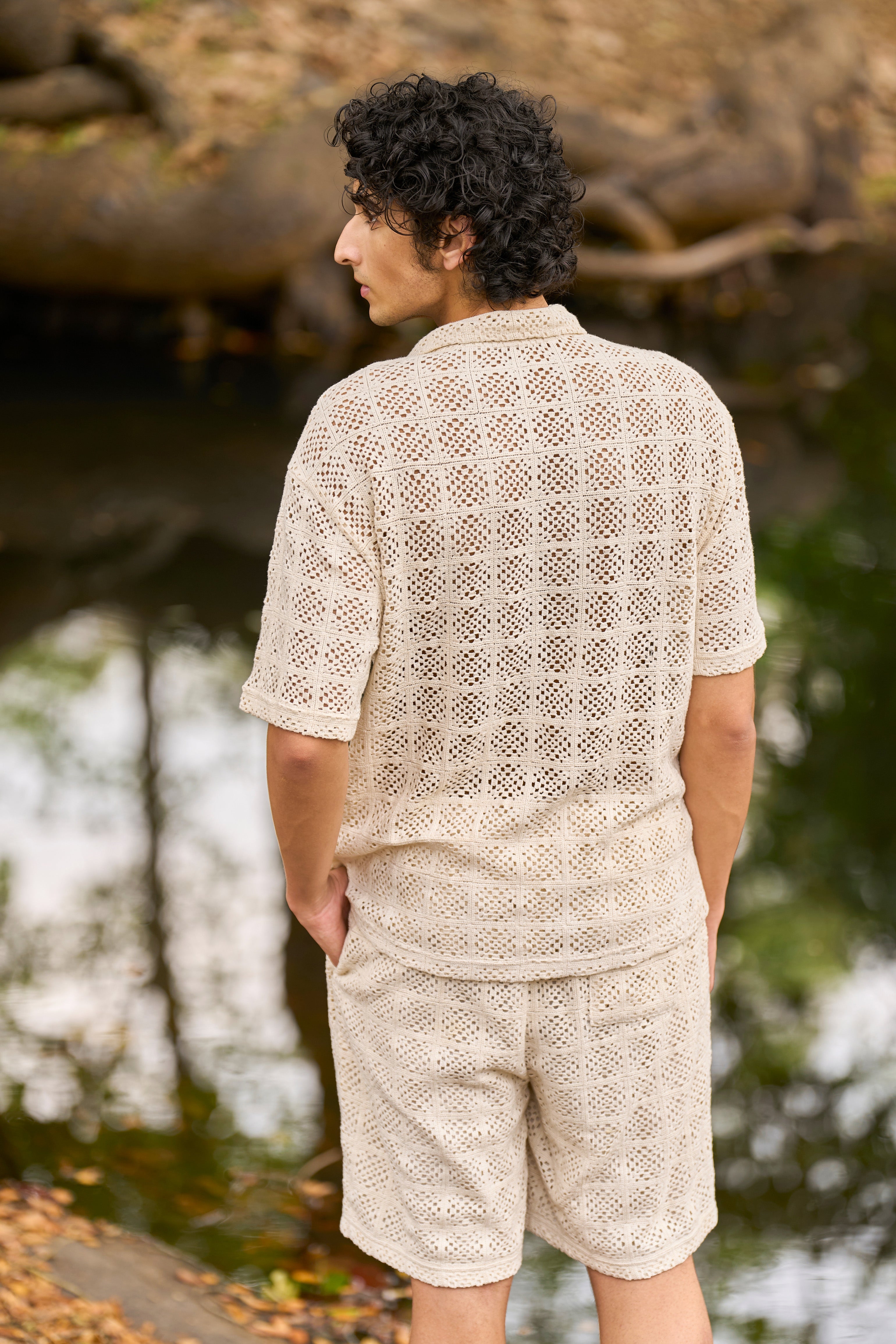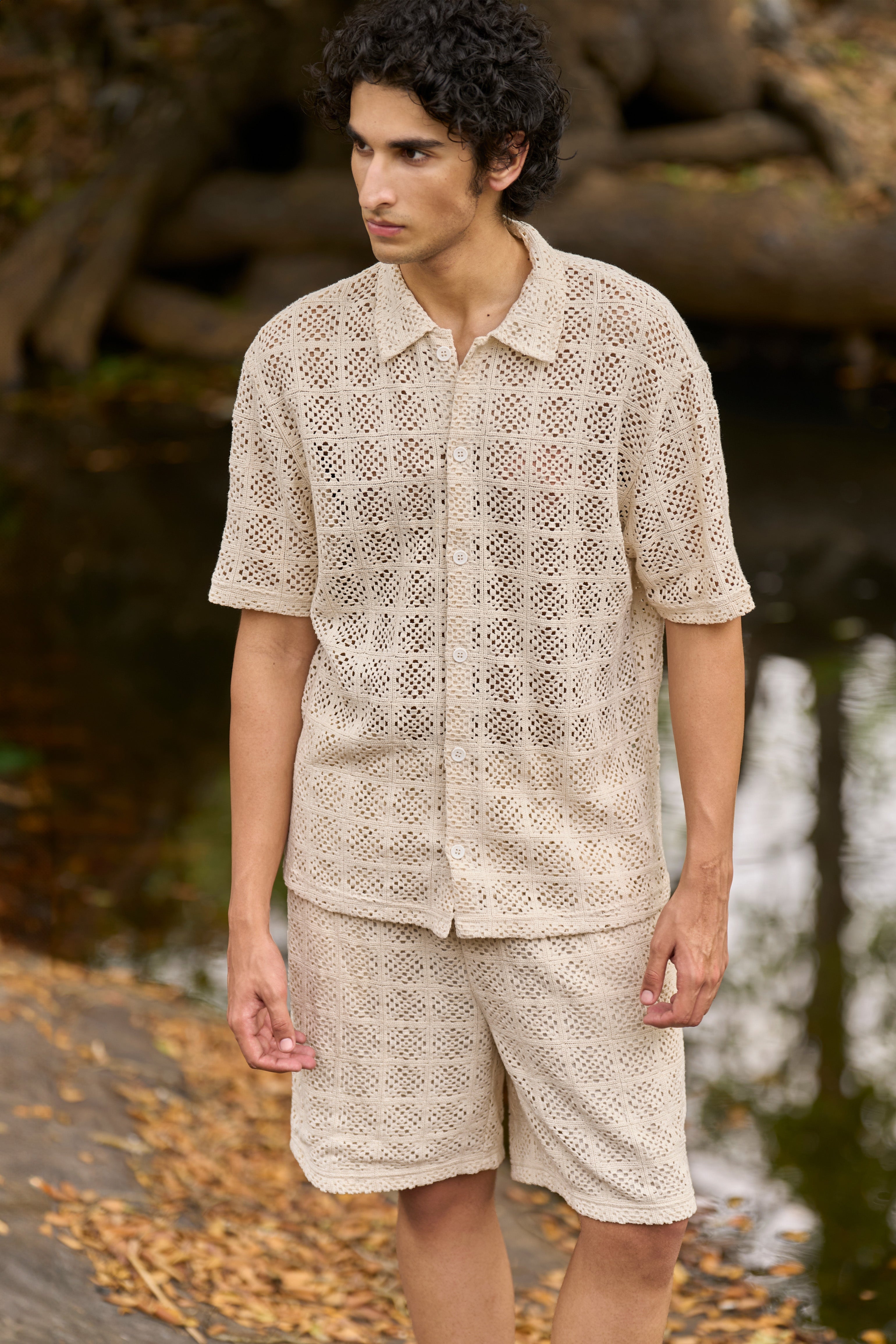 Natural crochet knit shirt in a geometric pattern. Button down front, half sleeves. Paired with matching knit shorts with an elasticated waistband with a drawstring. Includes side pockets and a back patch pocket. Shorts are fully lined.