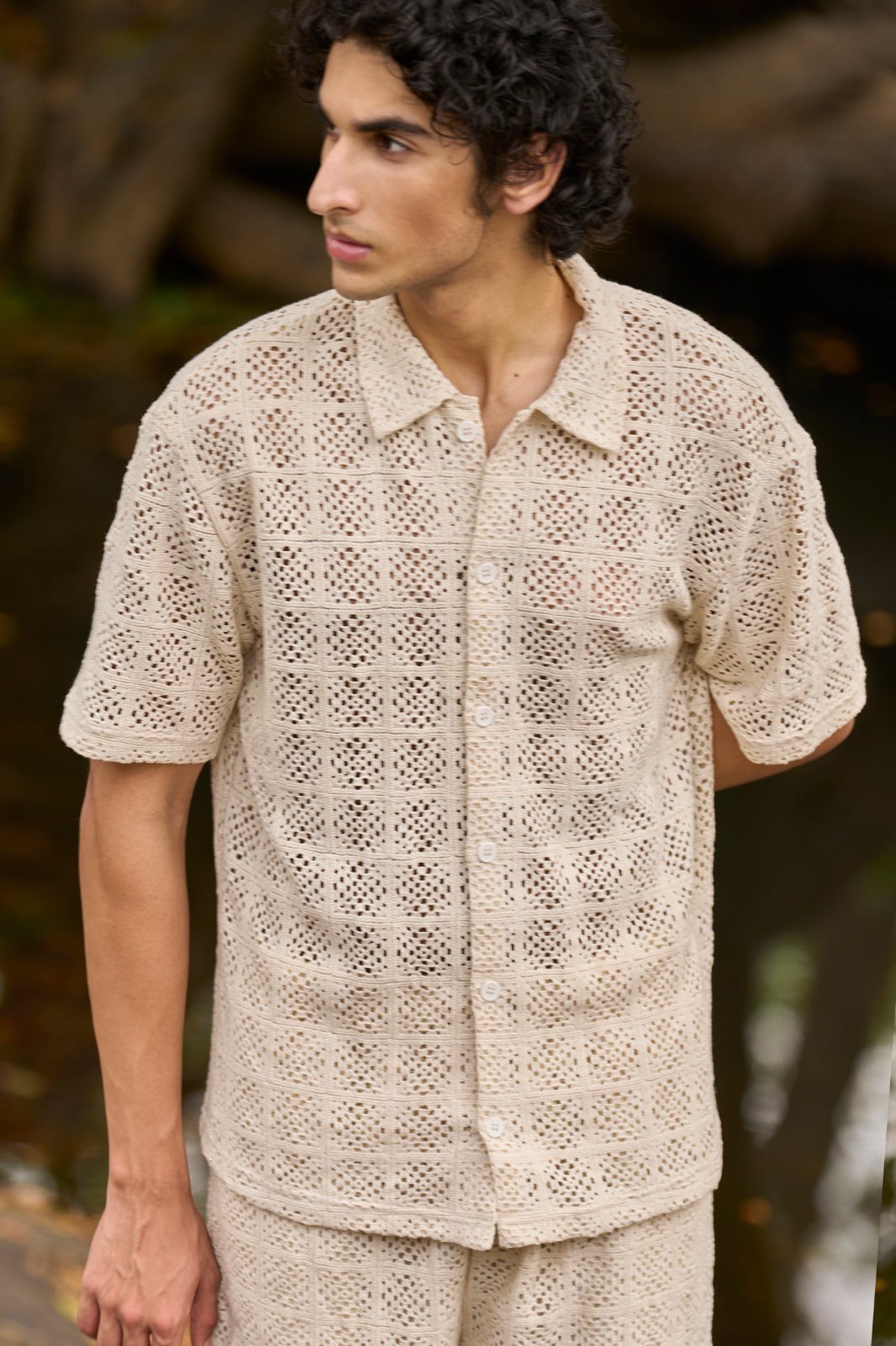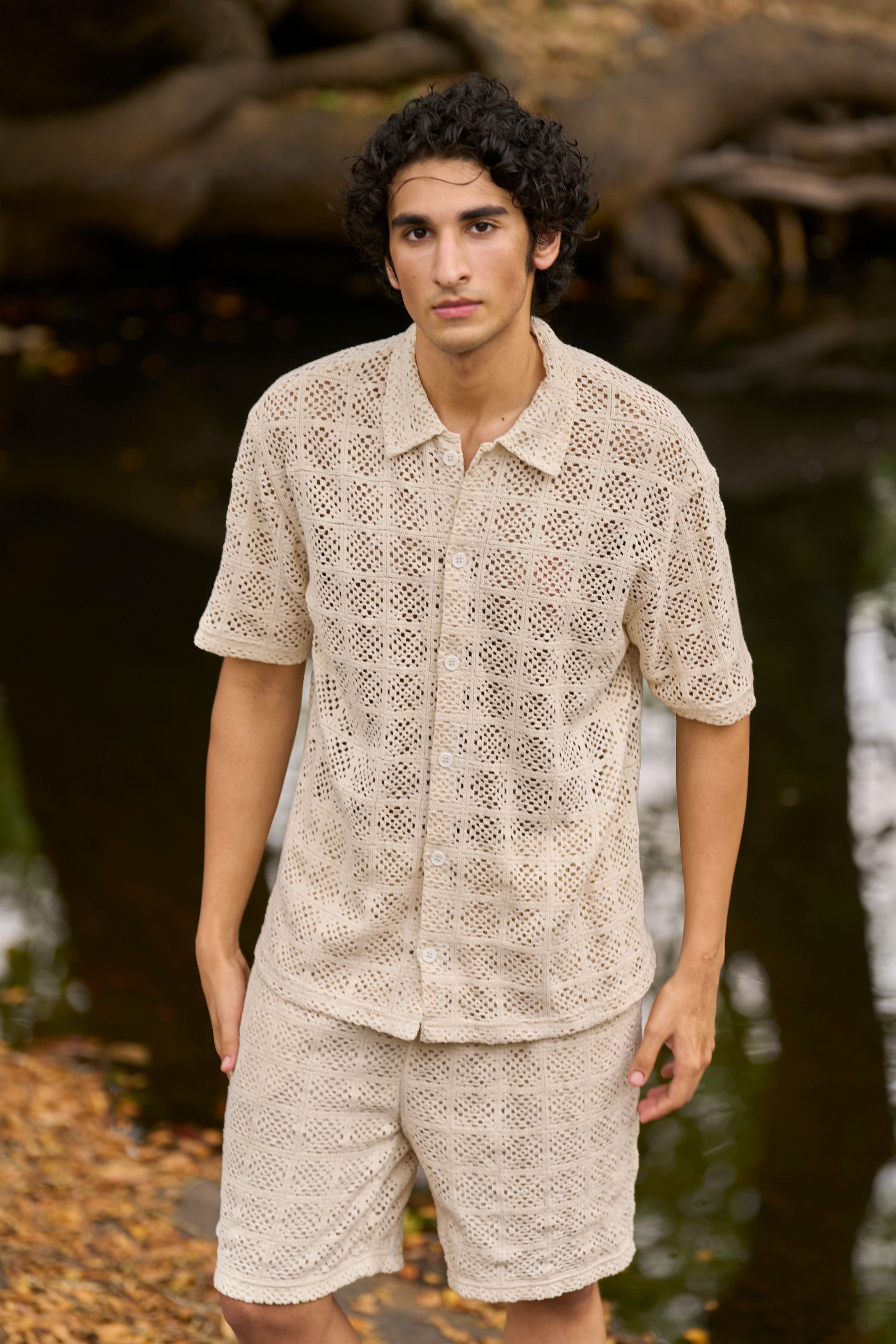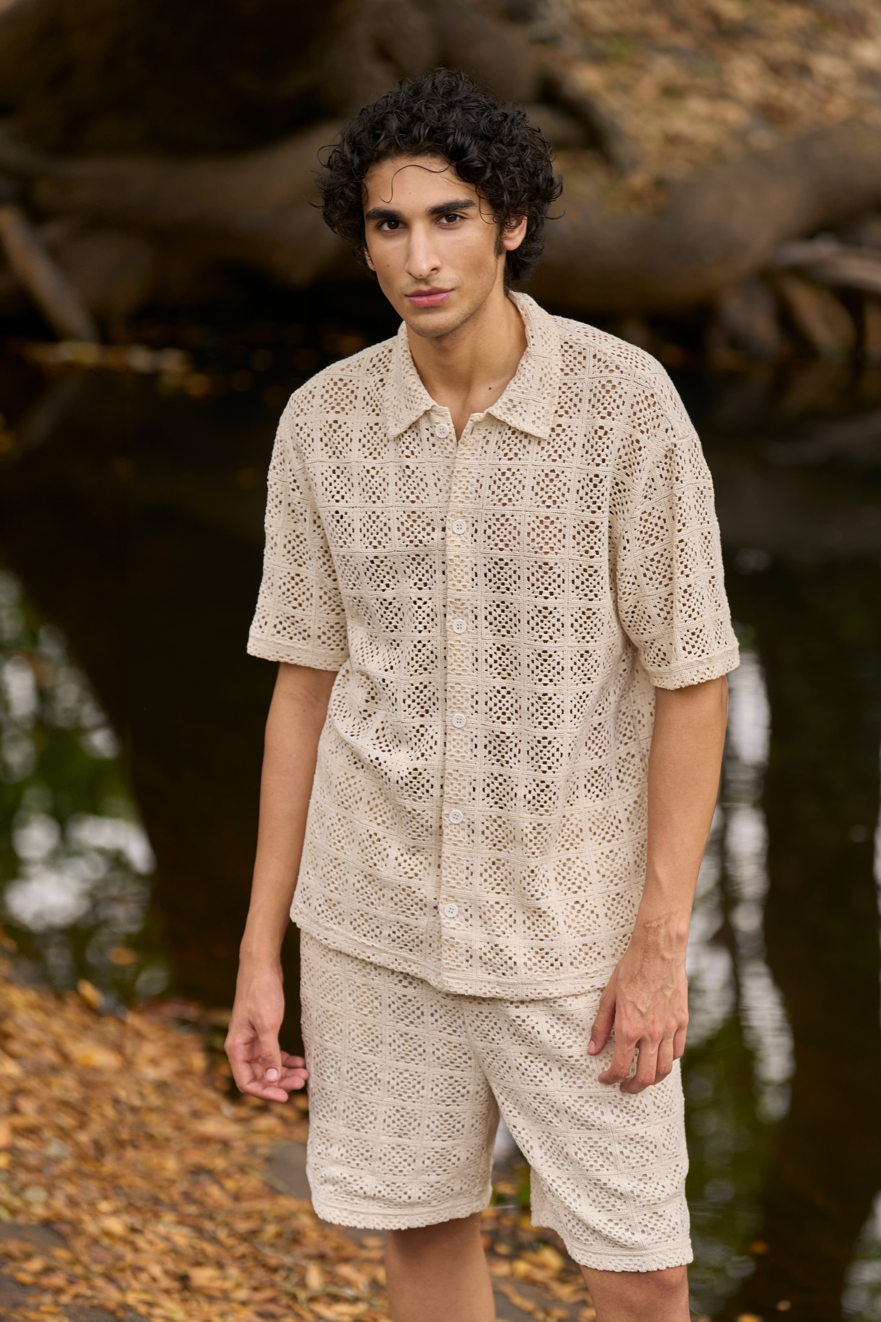 Natural crochet knit shirt in a geometric pattern. Button down front, half sleeves. Paired with matching knit shorts with an elasticated waistband with a drawstring. Includes side pockets and a back patch pocket. Shorts are fully lined.