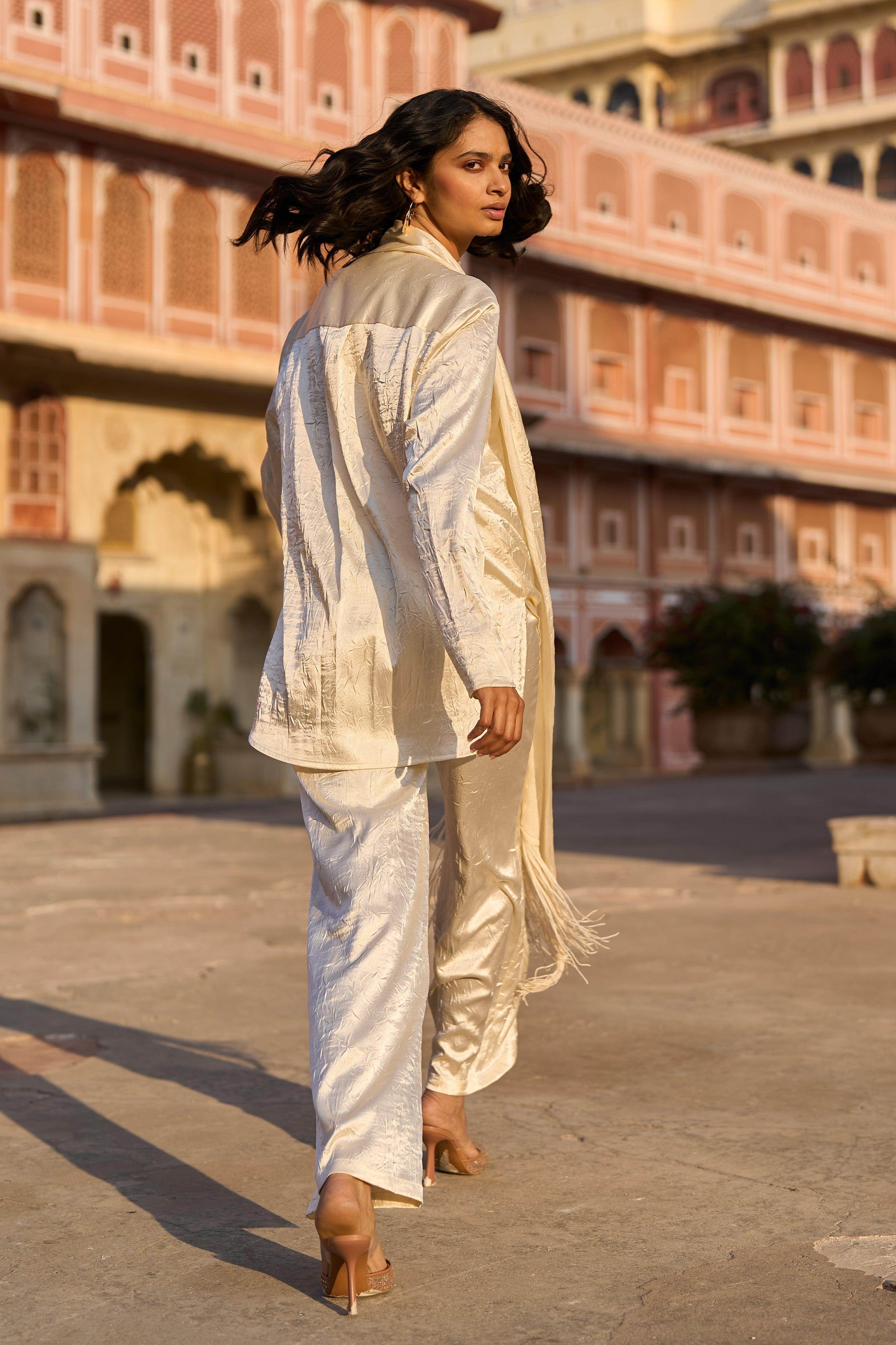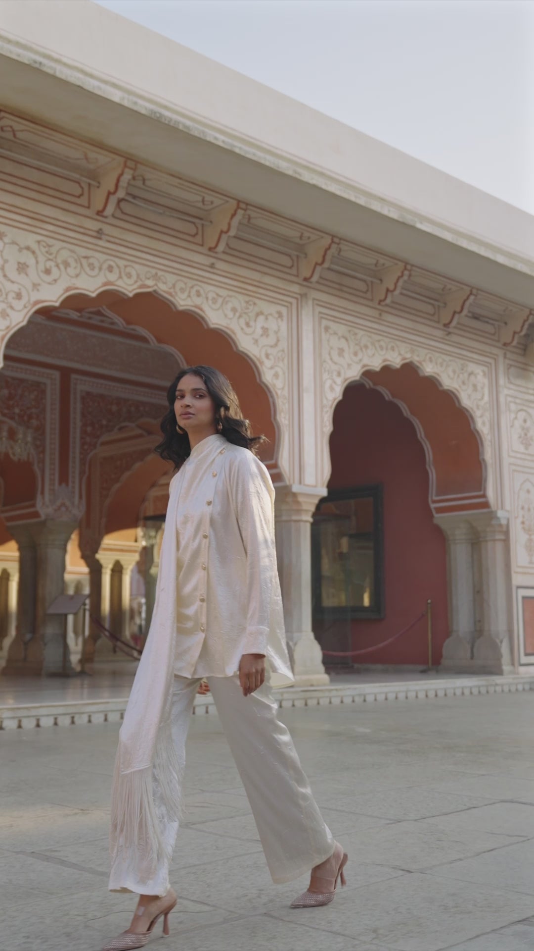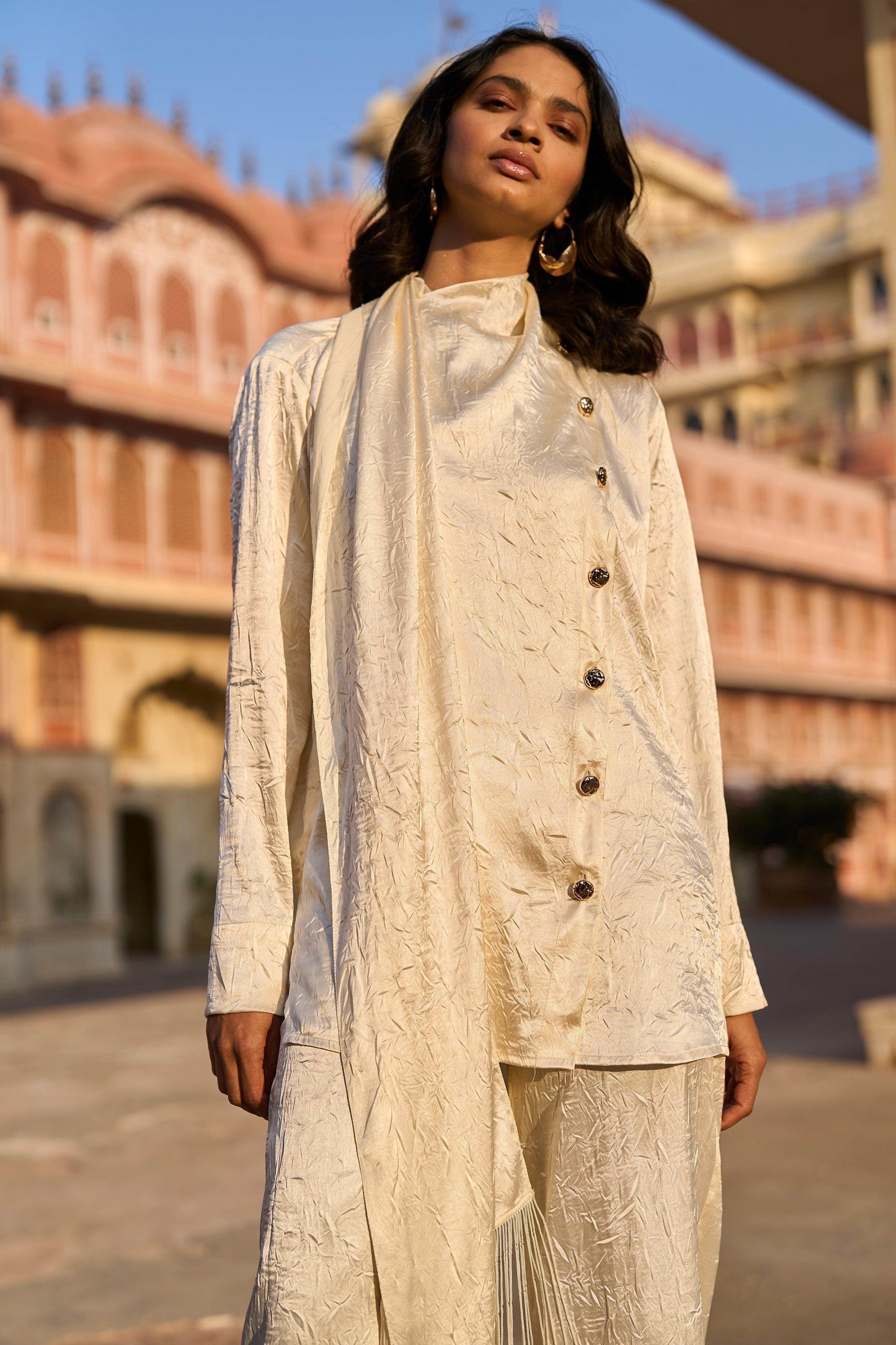 Crushed soft ivory fabric scarf top in an off-center placket full sleeve shirt. Hammered gold buttons in the front. Draped panel from the wearer's front right that can be worn and styled like a scarf. Drape panel is finished with fringe at the hem. Relaxed fit. Paired with matching straight pants that are semi elasticated at the waist. Side zip and hook closure. Pants are fully lined.