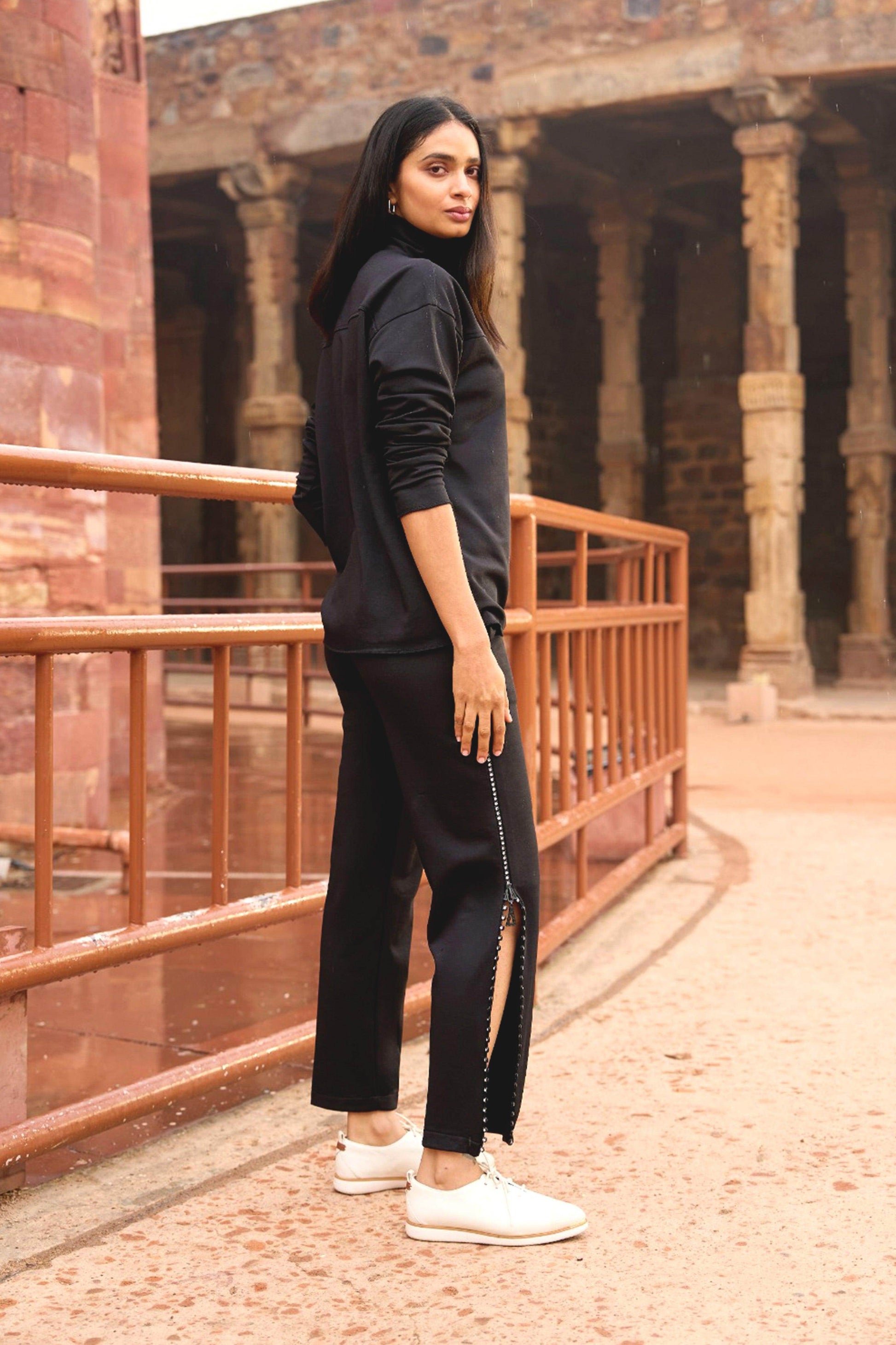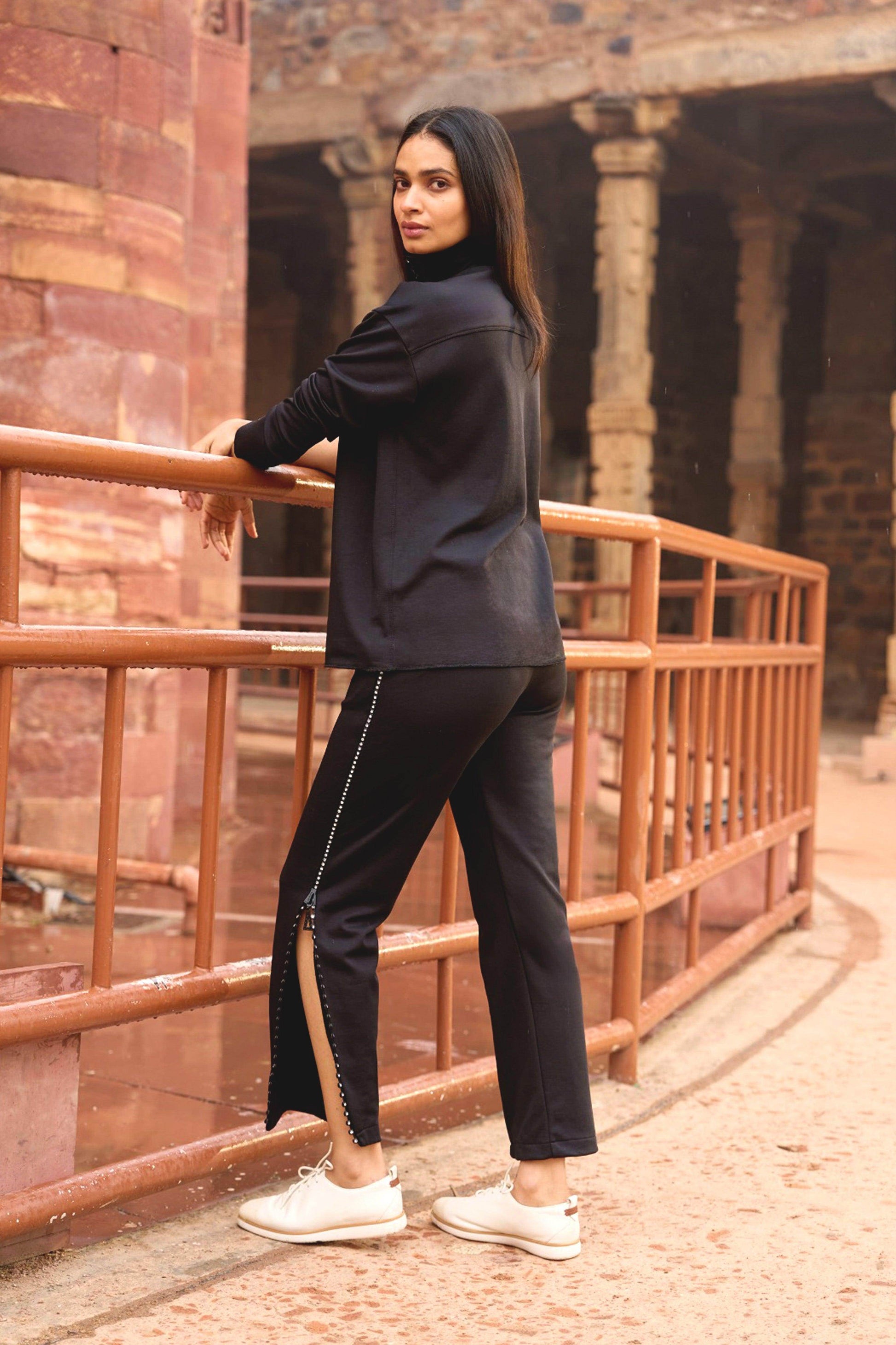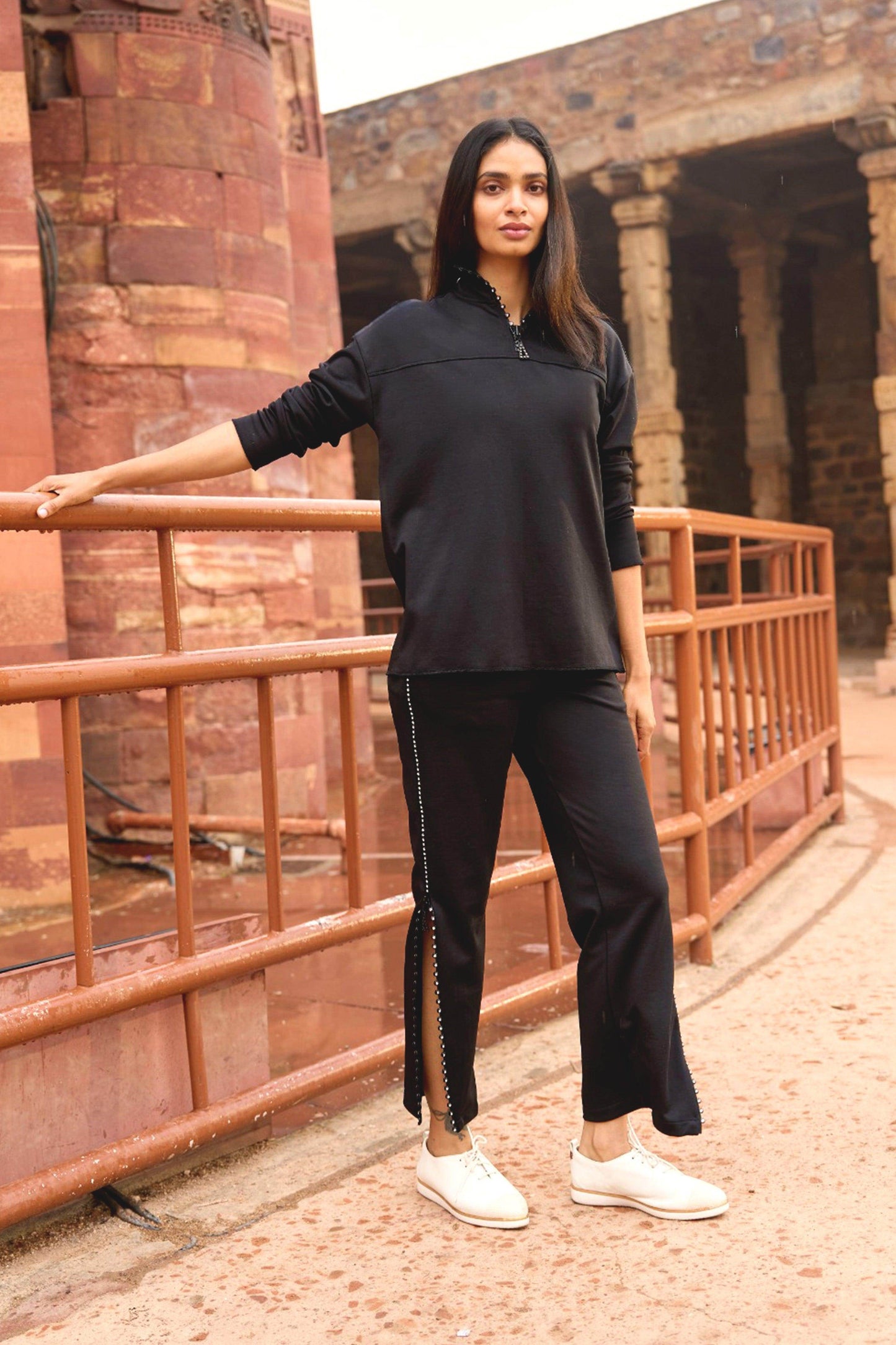 Relaxed fit knit popover top with a swarovski crystal zip in the front. Equal parts comfort and style. Full sleeve, shirt collar. Paired with matching straight cut knit pant with swarovski crystal zippers down the full side seams. Zippers are functional and open from the bottom hem. Can be worn fully closed or opened. Elasticated at the waist. Pockets in the sides.