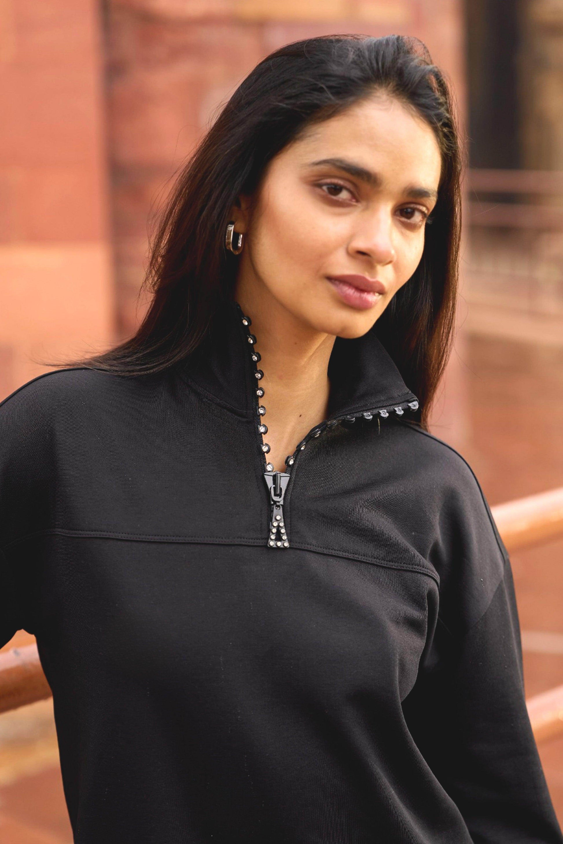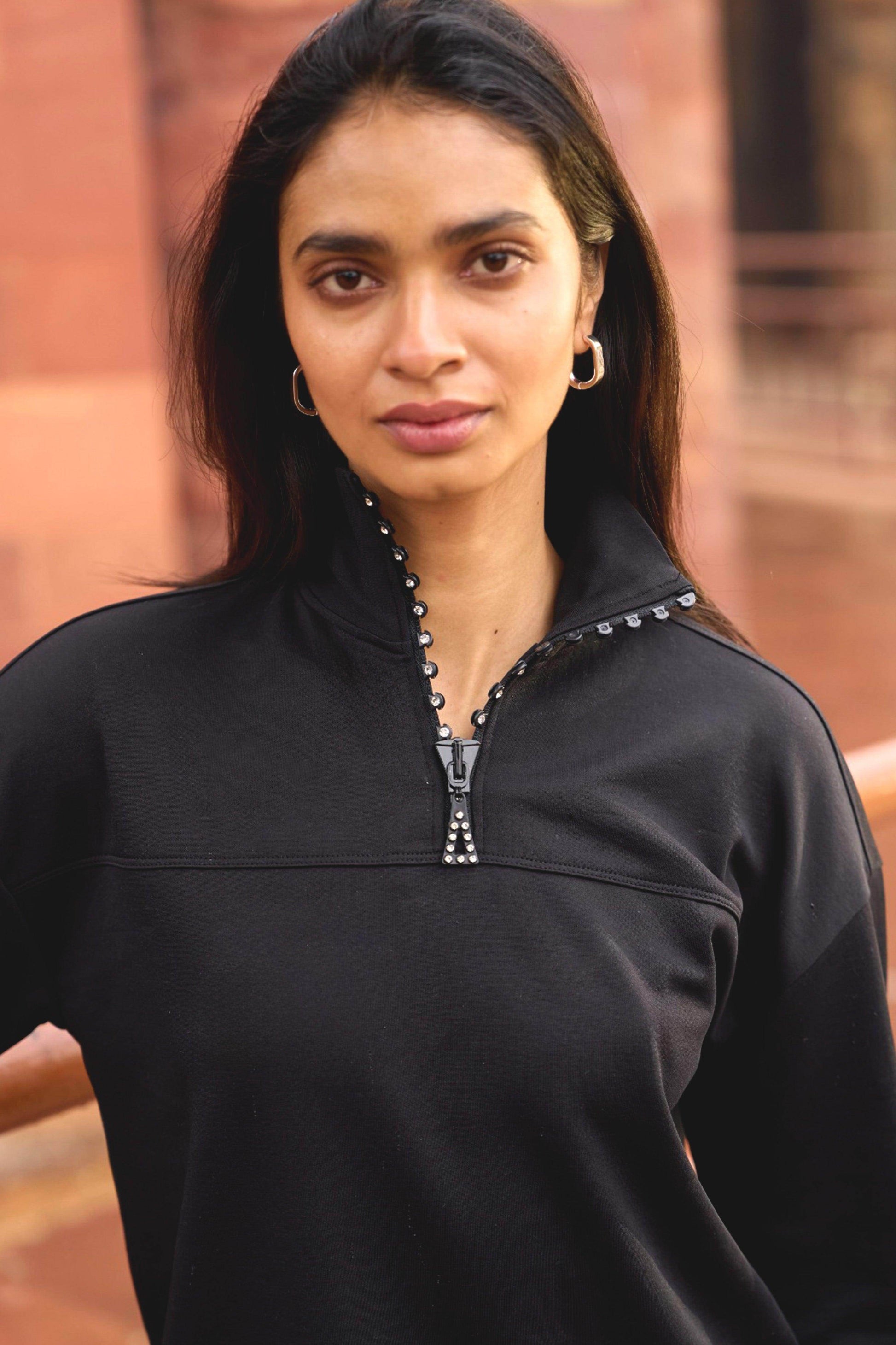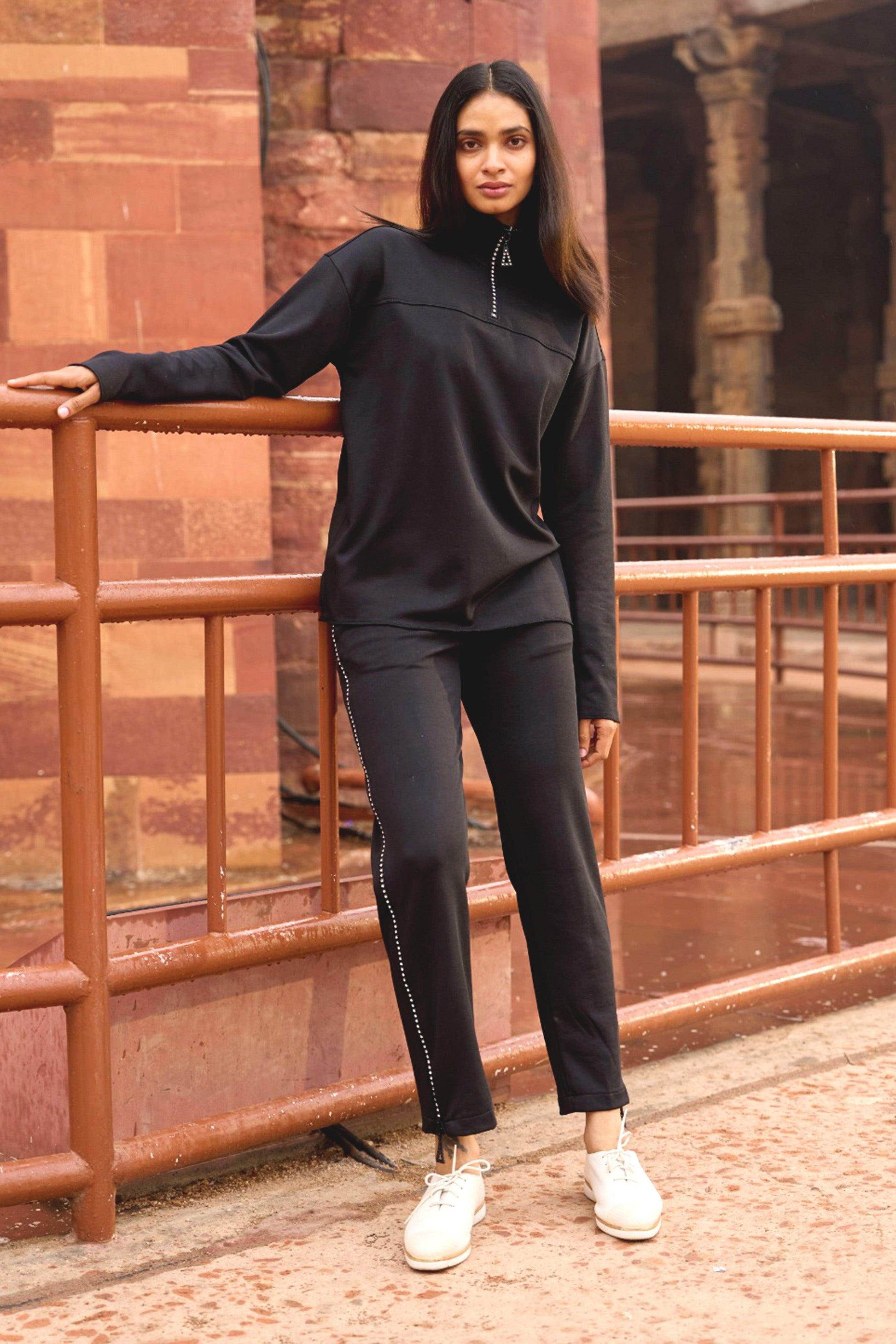 Relaxed fit knit popover top with a swarovski crystal zip in the front. Equal parts comfort and style. Full sleeve, shirt collar. Paired with matching straight cut knit pant with swarovski crystal zippers down the full side seams. Zippers are functional and open from the bottom hem. Can be worn fully closed or opened. Elasticated at the waist. Pockets in the sides.