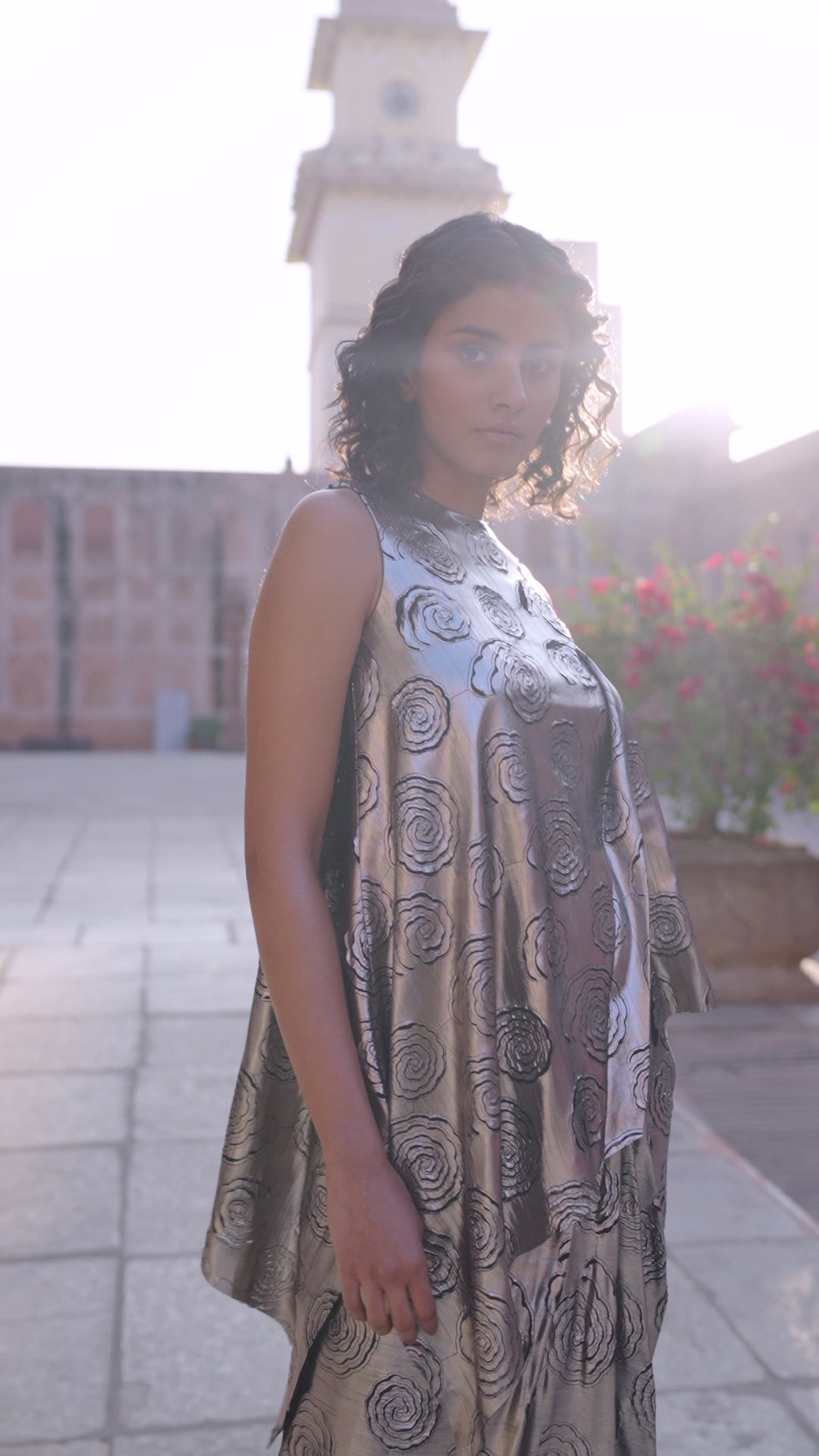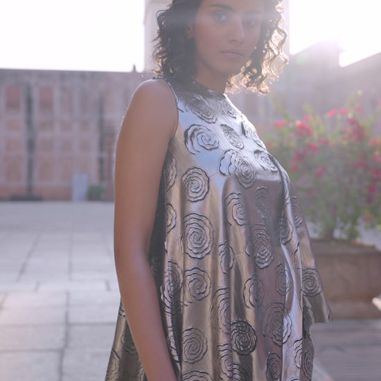 Asymmetric sleeveless top crafted in foil lamé with hand-cutout roses. Features a round neckline and a silver button closure at the back. Fully lined.