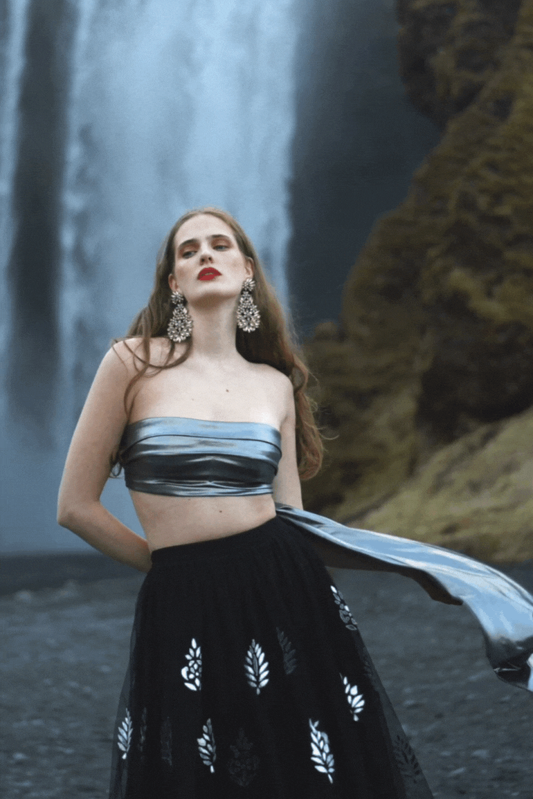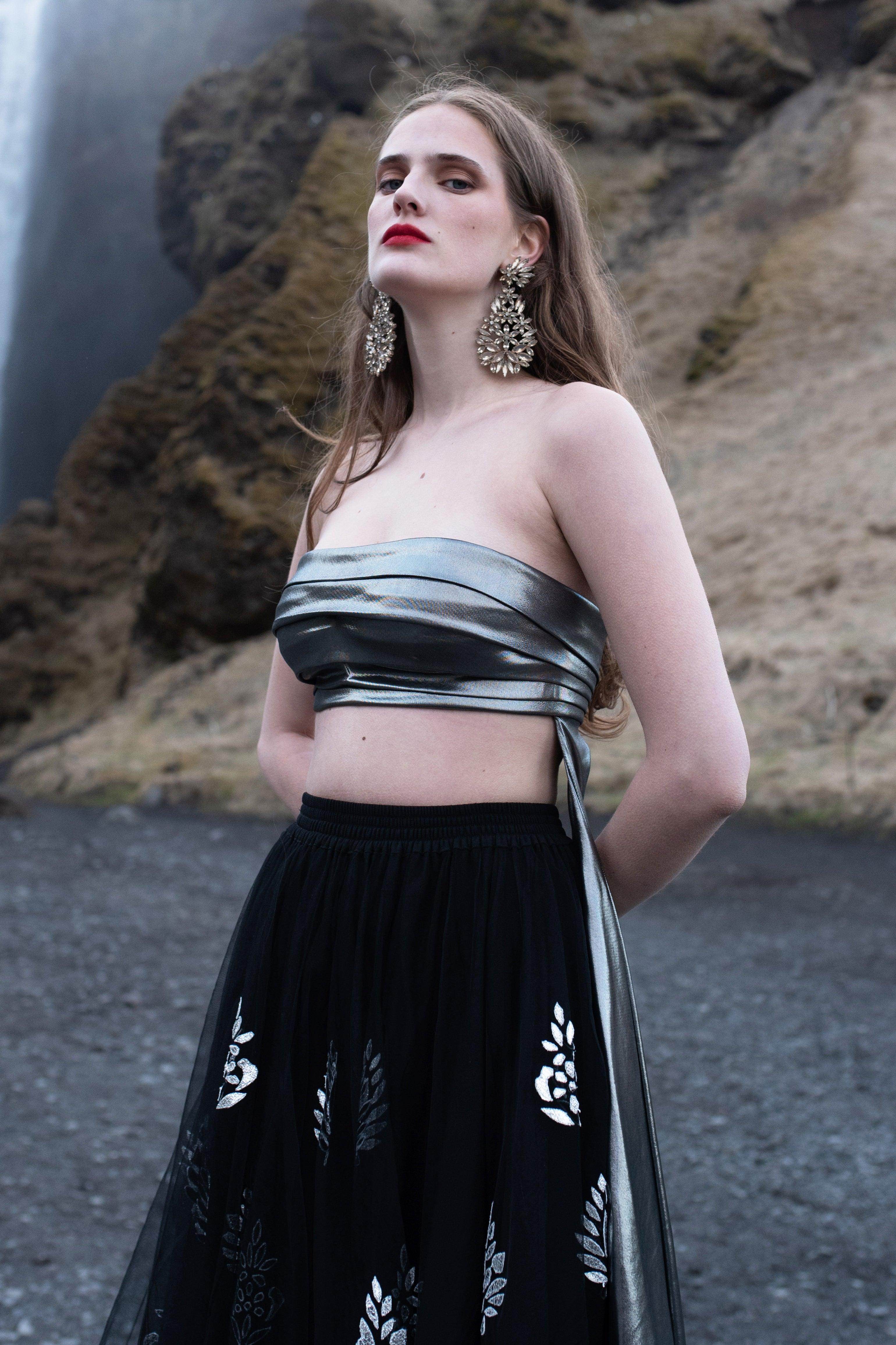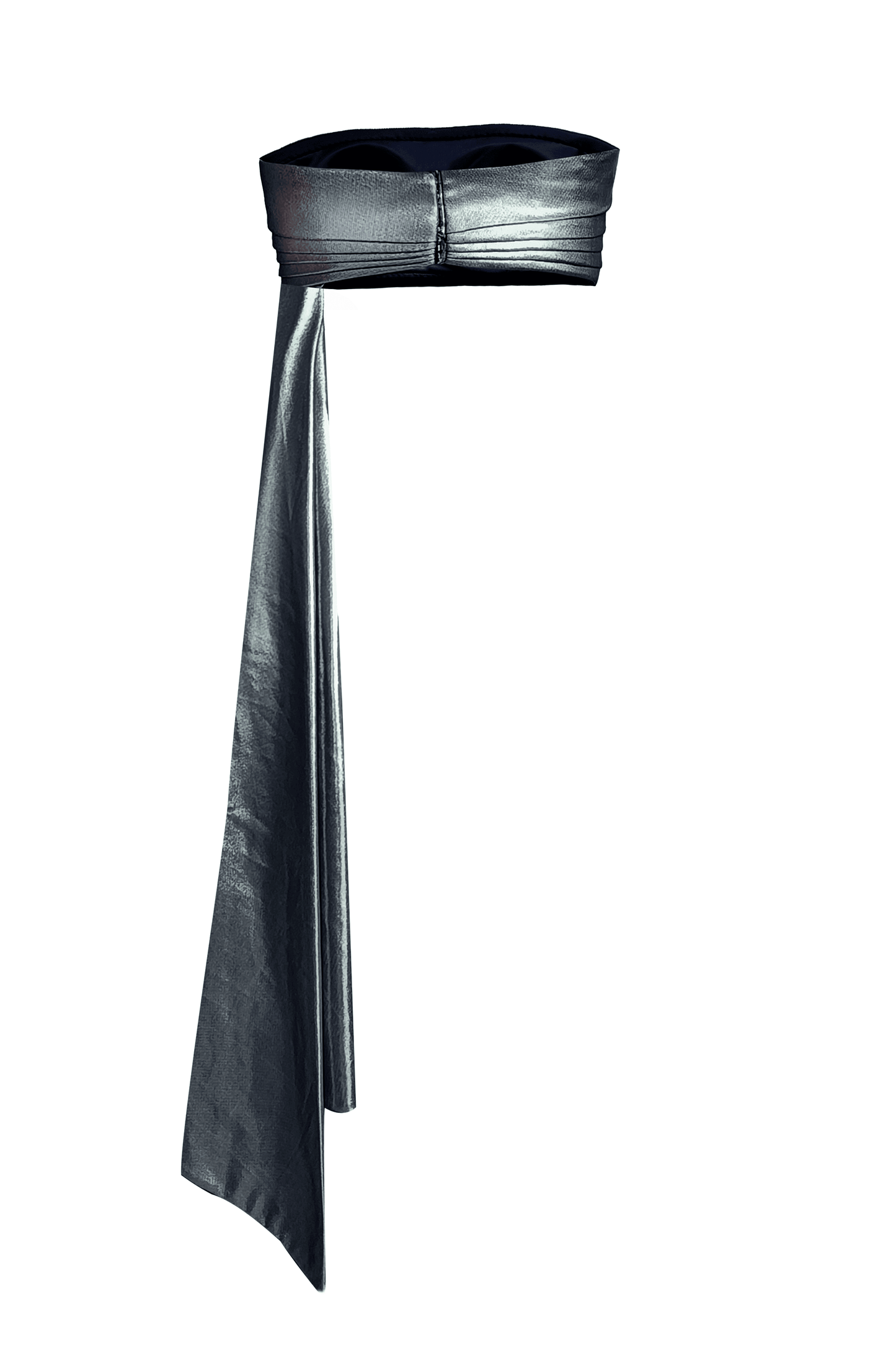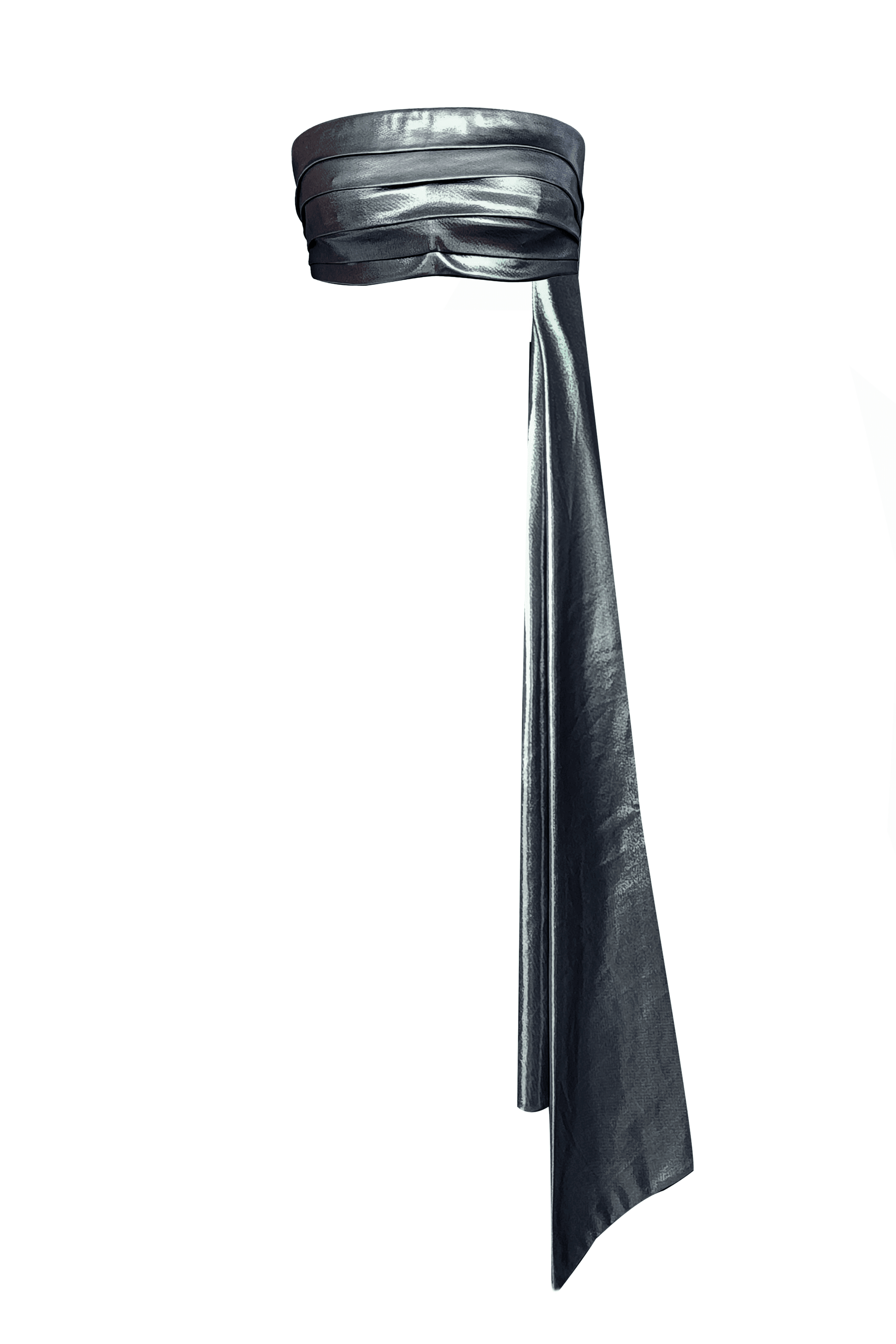 Pewter-silver bandeau tube top in stretchable knitted lamé fabric. Hand-sewn cummerbund-inspired delicate pleat detail at the front. Free-flowing draped panel attached on the wearer’s left for added movement and drama. Hook-eye closure at the back.The top is lined with removable pad pockets.