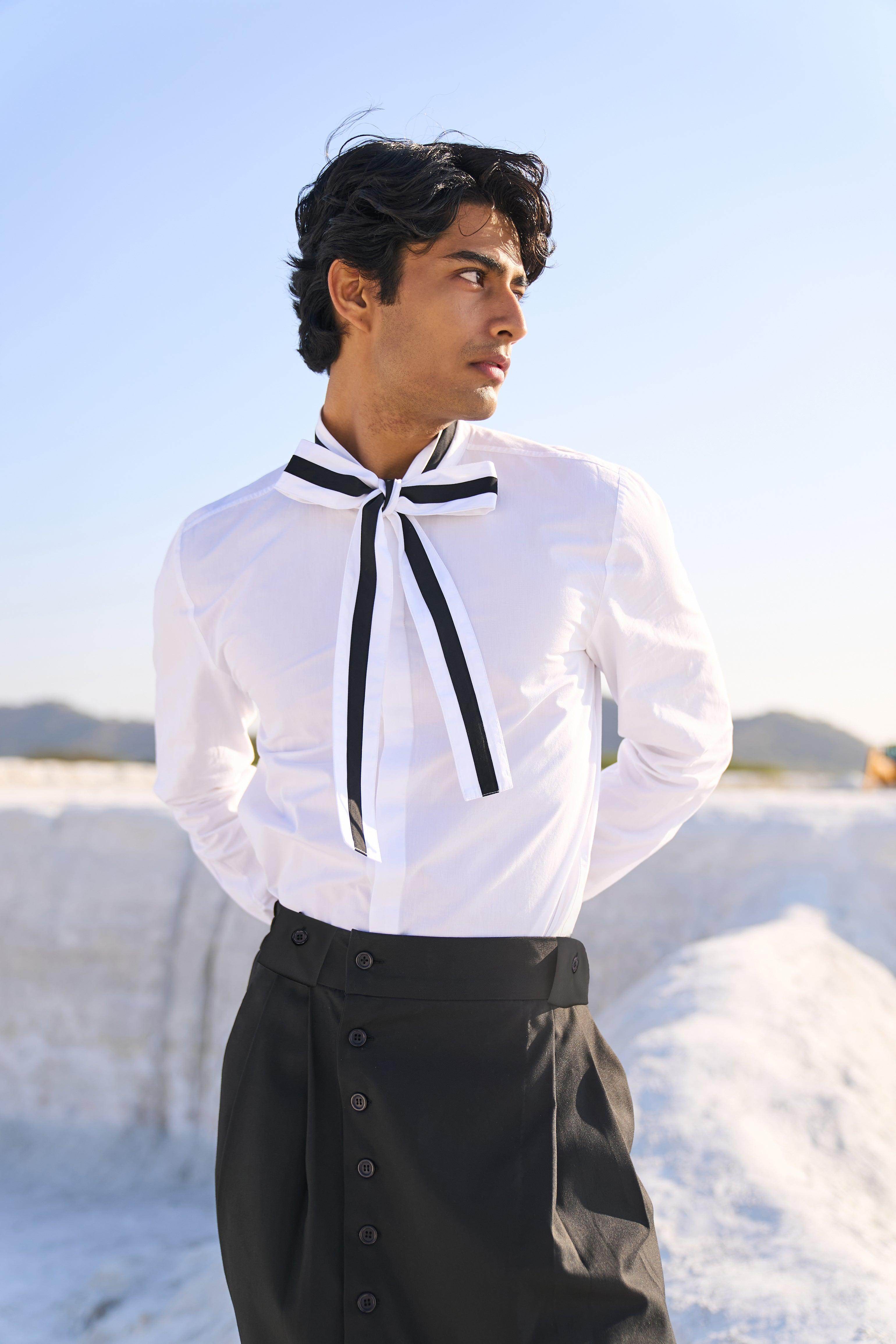 Wide-legged crop length pant in all weather suiting material. Slight drop crotch and off-center button fly detail. Semi-elasticated at the waist with belt loops. Pockets on the side and back.