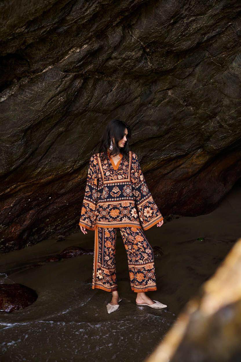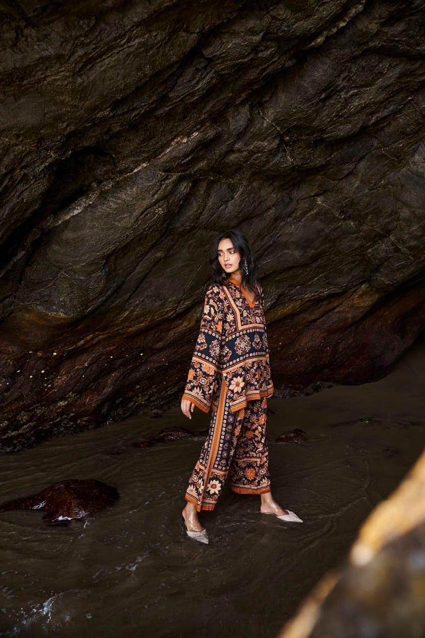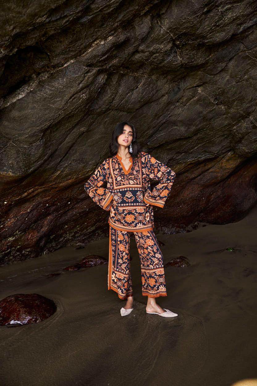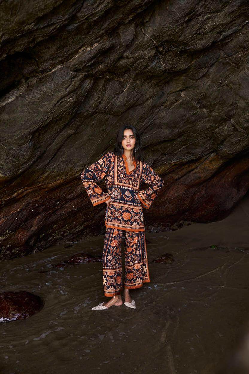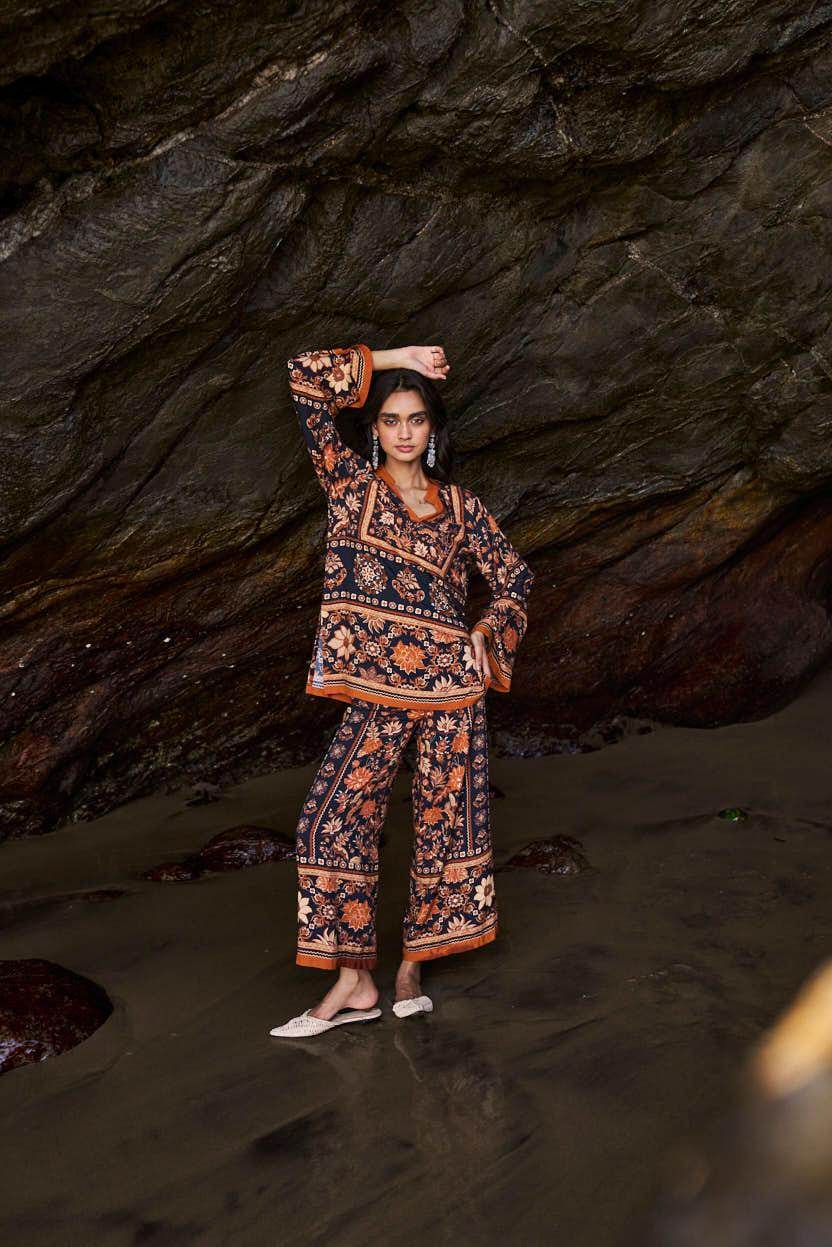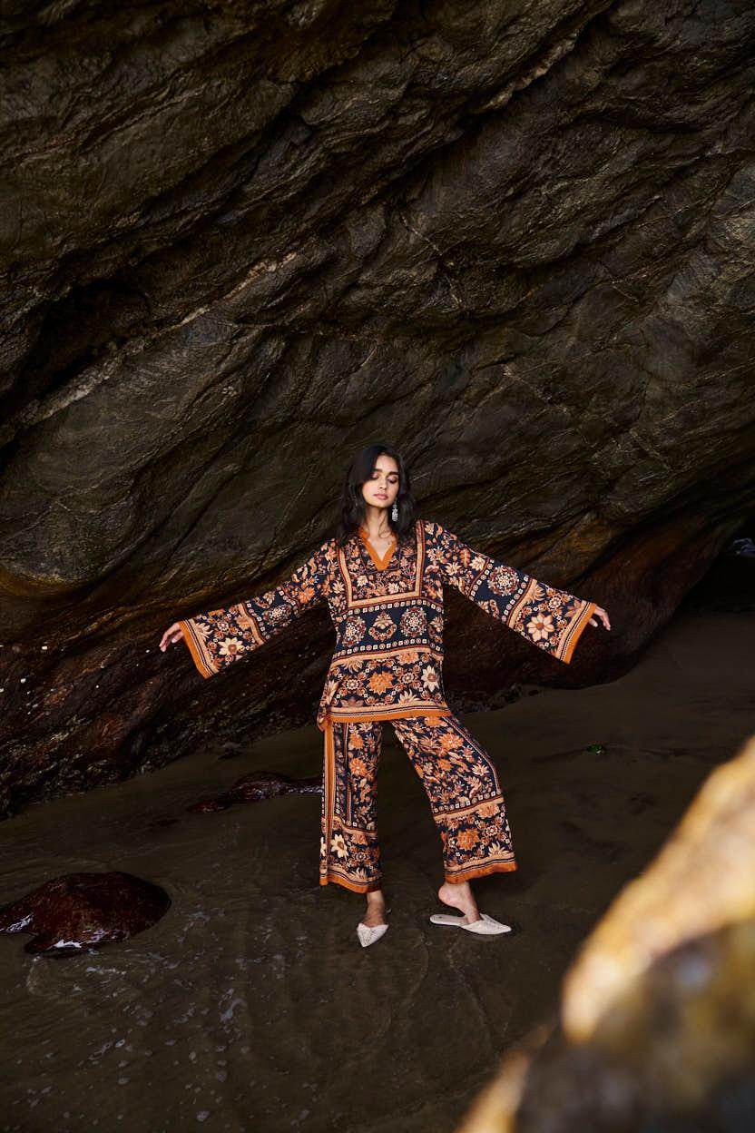Earth toned placement floral border print on a flowy black base. Flared full sleeves and a band collar with a V neck in the front. Paired with matching straight leg pants that have a hook/eye and zip closure and pockets in the sides. Relaxed fit.