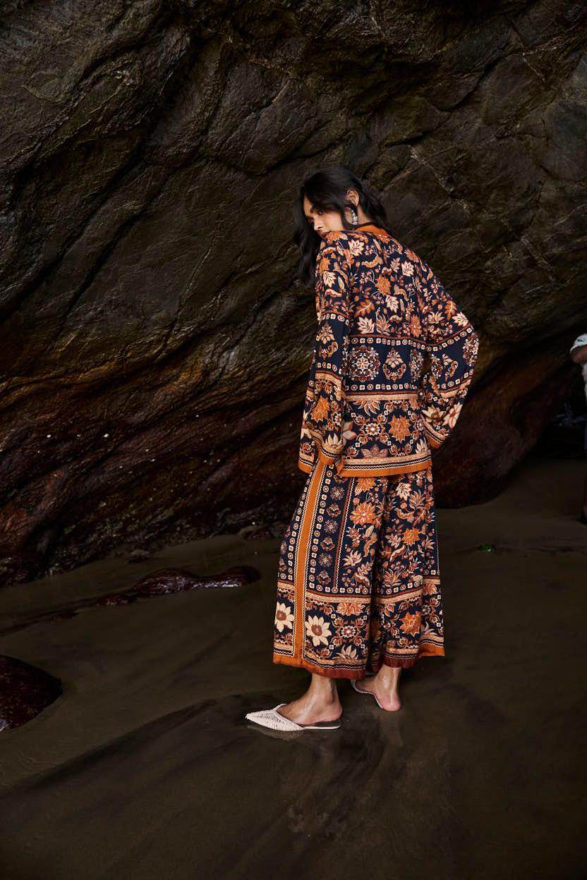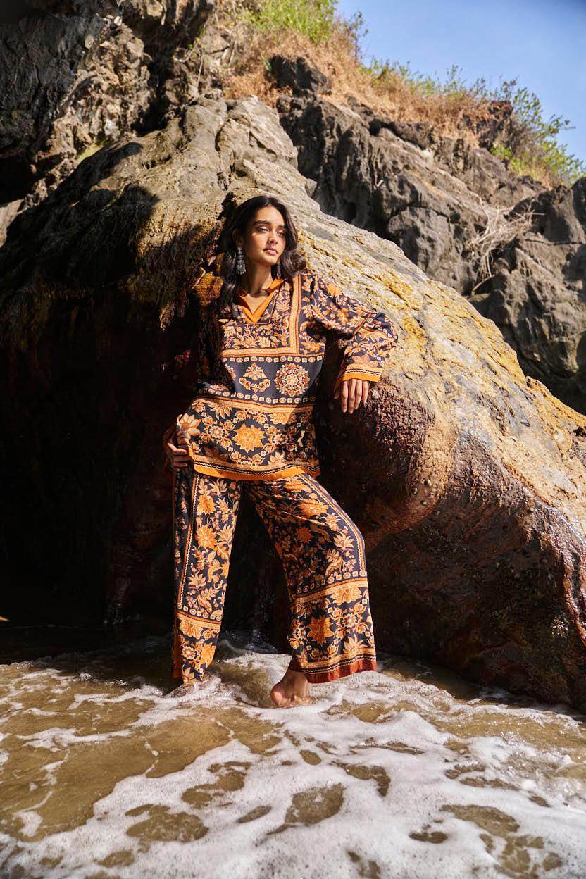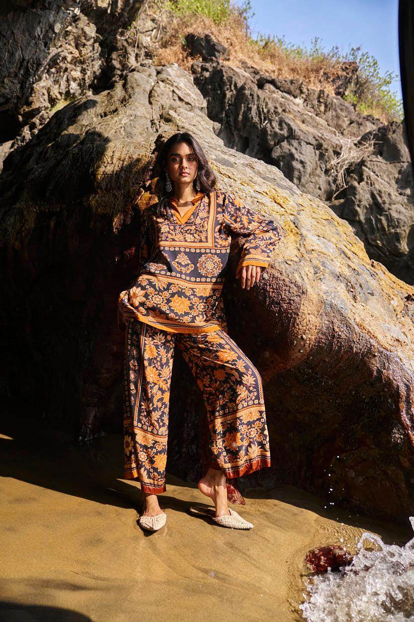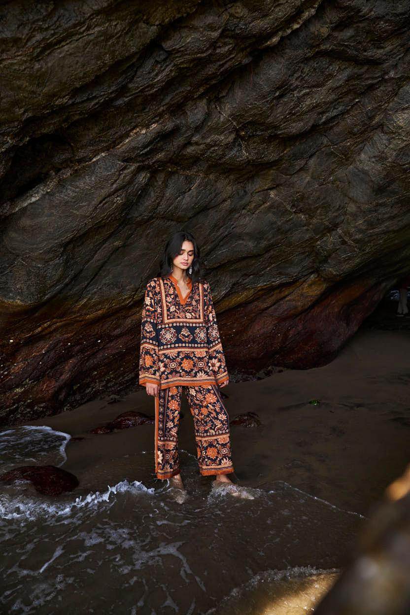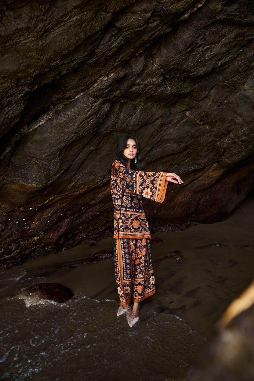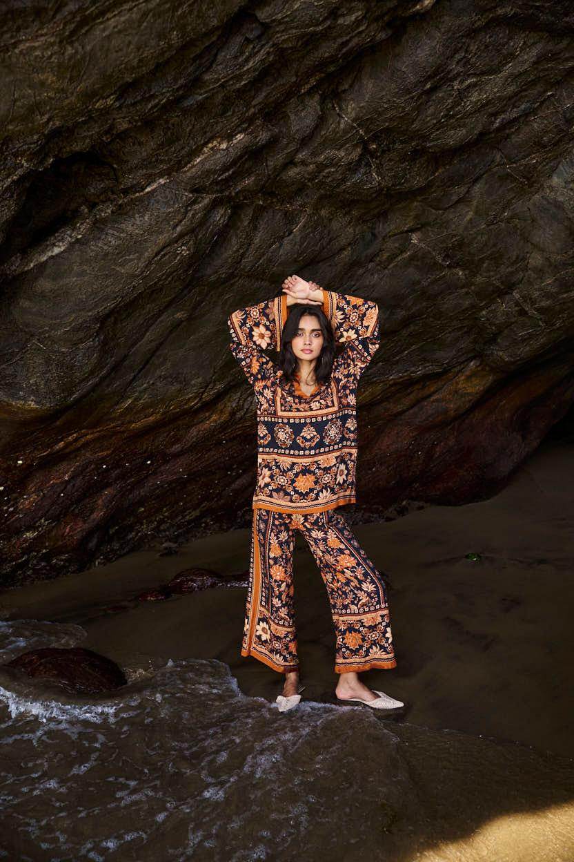 Earth toned placement floral border print on a flowy black base. Flared full sleeves and a band collar with a V neck in the front. Paired with matching straight leg pants that have a hook/eye and zip closure and pockets in the sides. Relaxed fit.