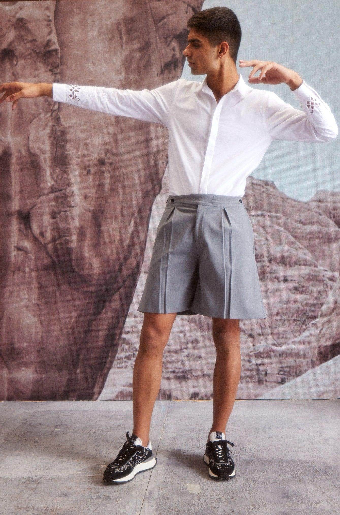 White full sleeve cotton poplin shirt with tonal cutwork embroidery detail around the sleeve cuff. Concealed button placket. Regular fit.