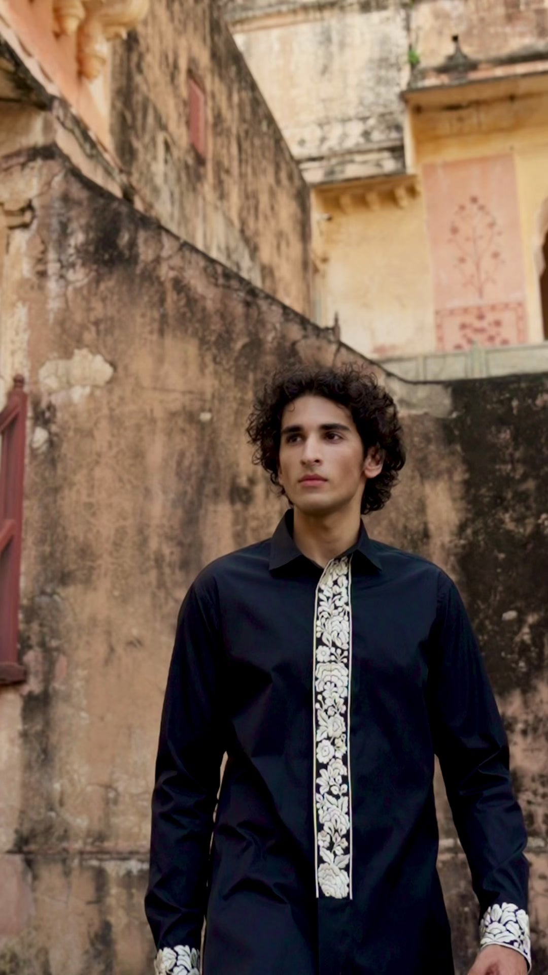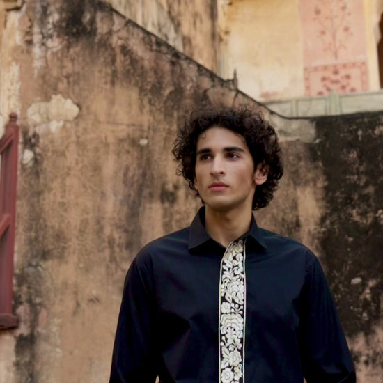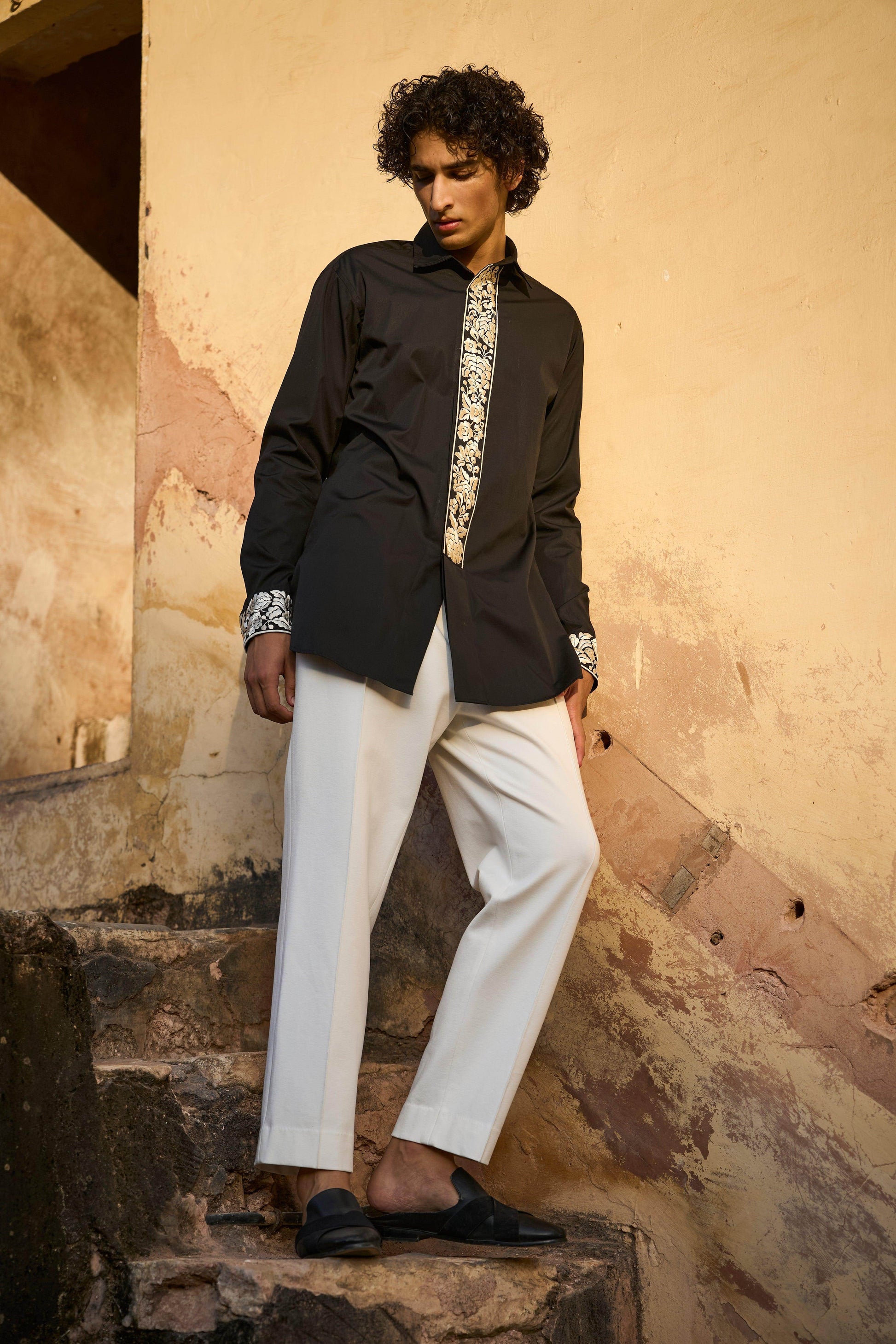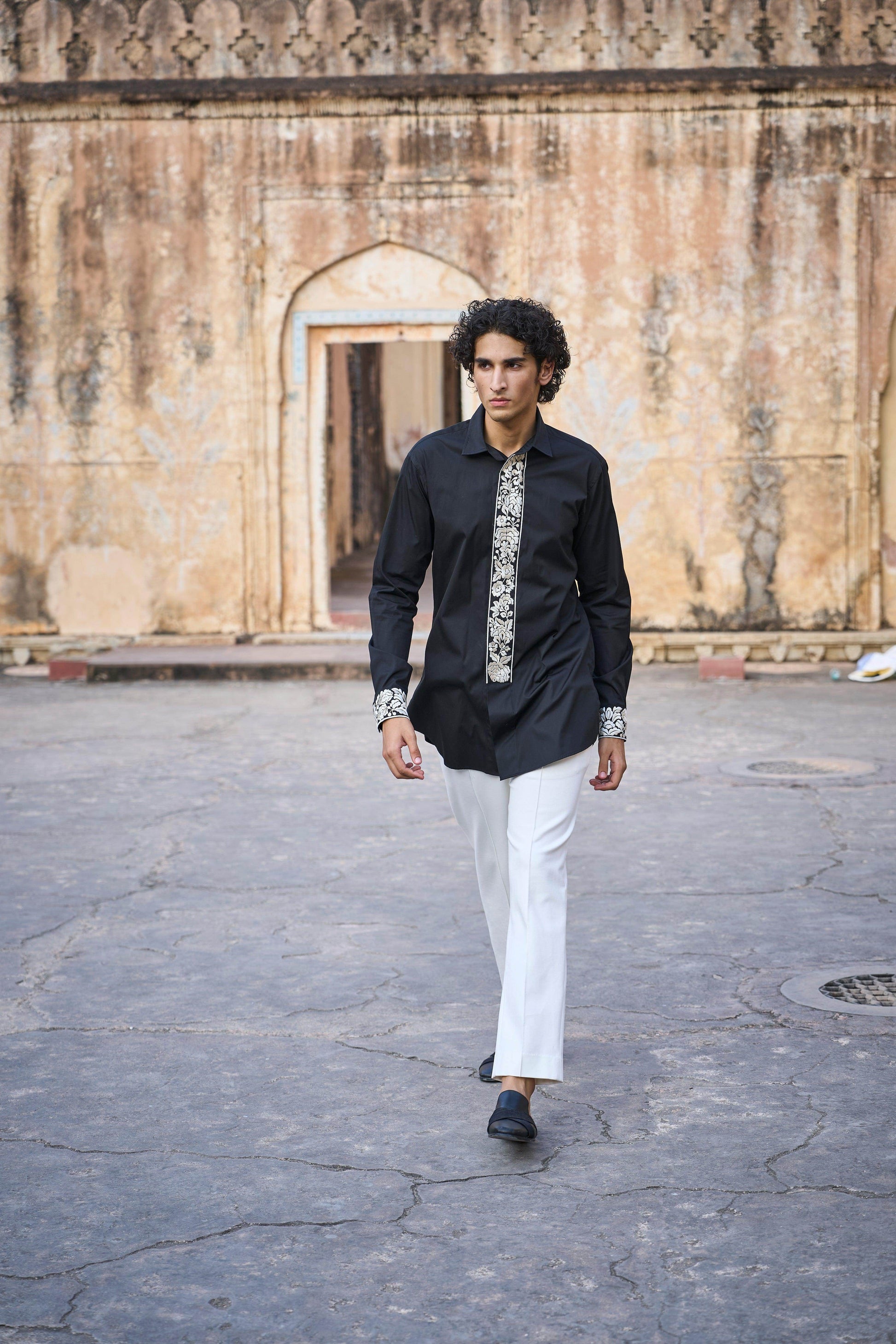 Black organic cotton poplin longline shirt with placed gara stitch inspired embroidery on the front placket and sleeve cuff. Embroidered piping border detail frames the concealed placket and edges of the cuff. Full sleeve, shirt collar. Relaxed fit.