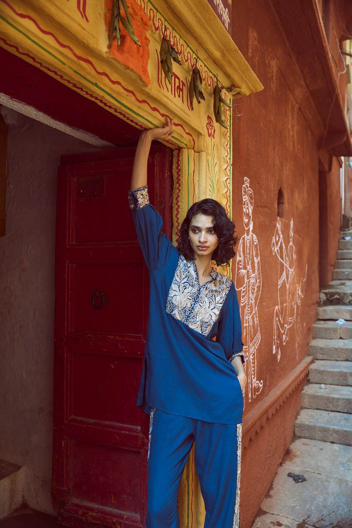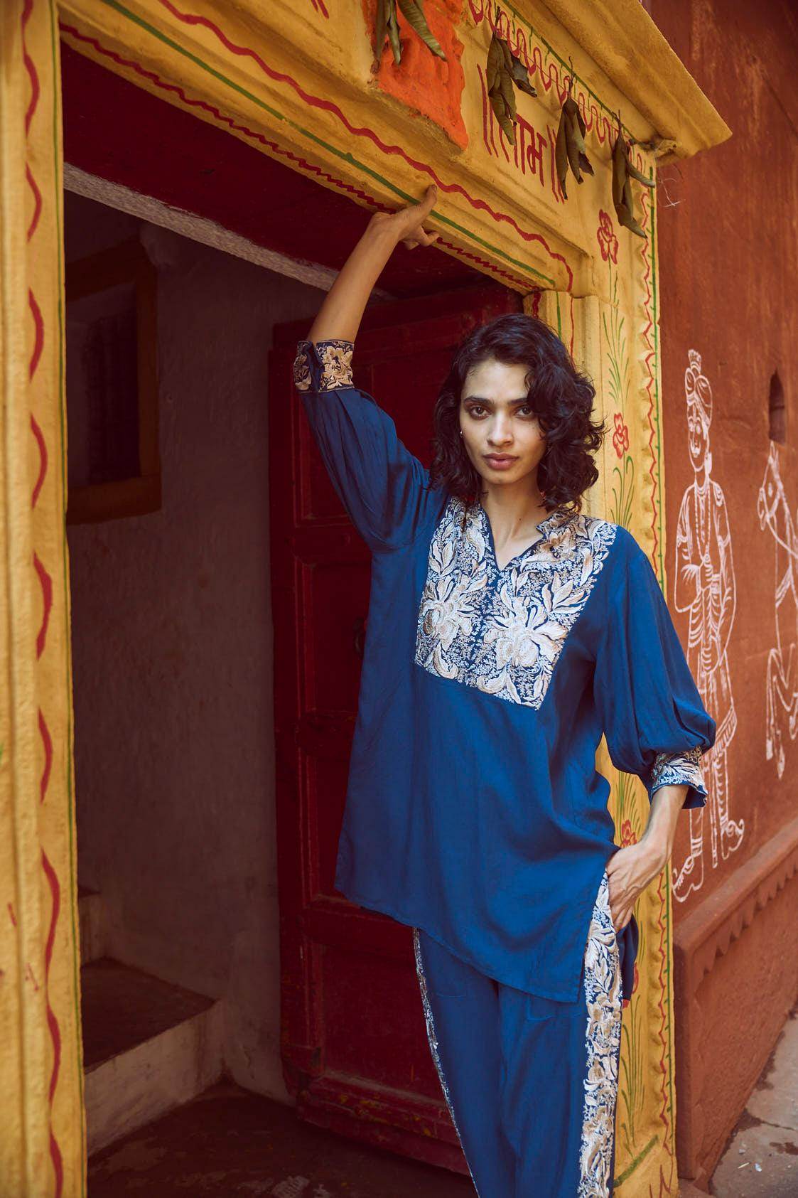 Teal embroidered pant set with Gara stitch-inspired embroidery detail at the front bib, collar, sleeve cuffs and sides of the pants. Popover top has a band collar and V neckline with 3/4th sleeves. High/low hem. Metallic button closures at the sleeve cuffs. Pants have hook and zip closure at the front. Elasticated at the back, pockets on the side.