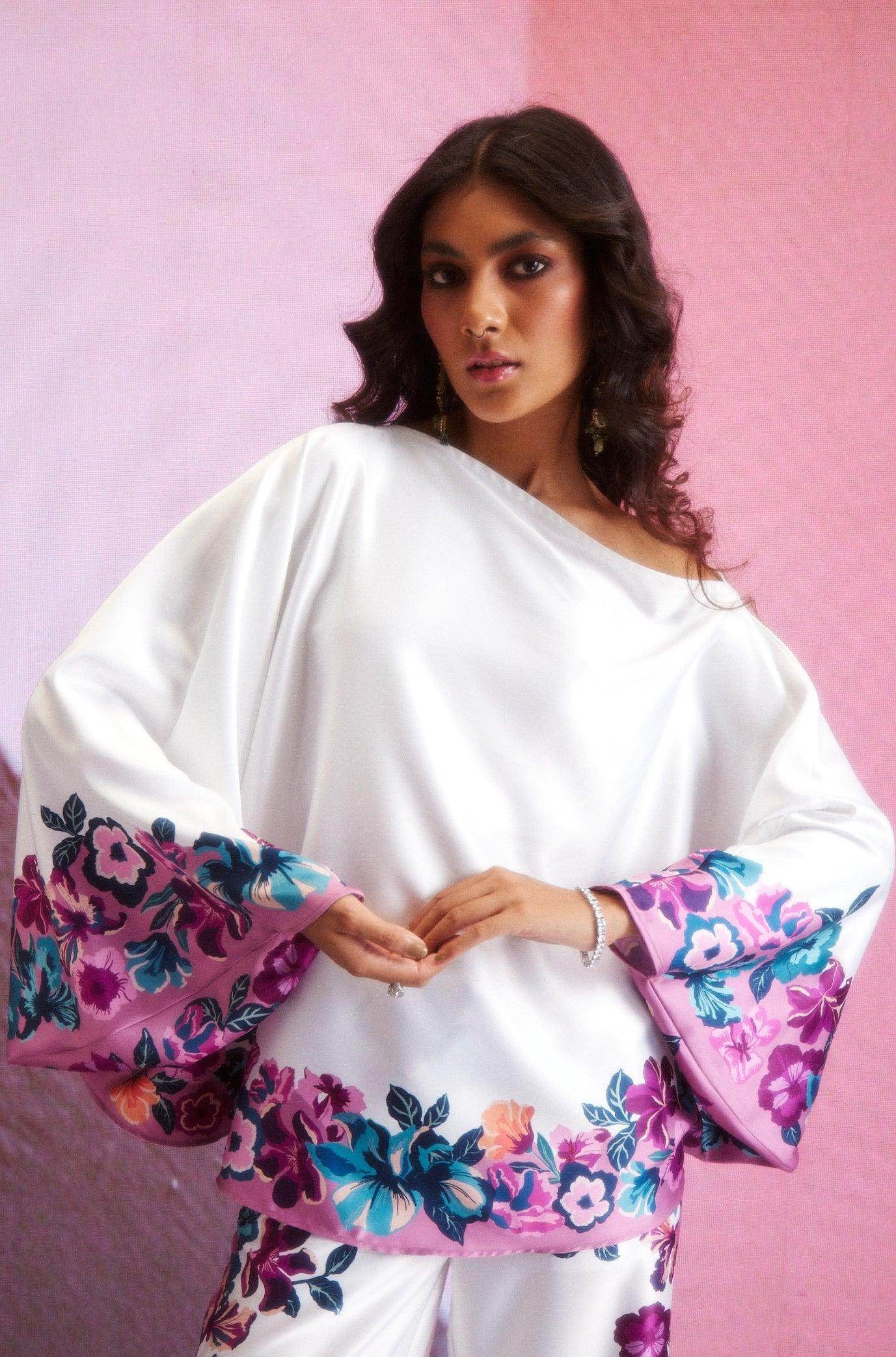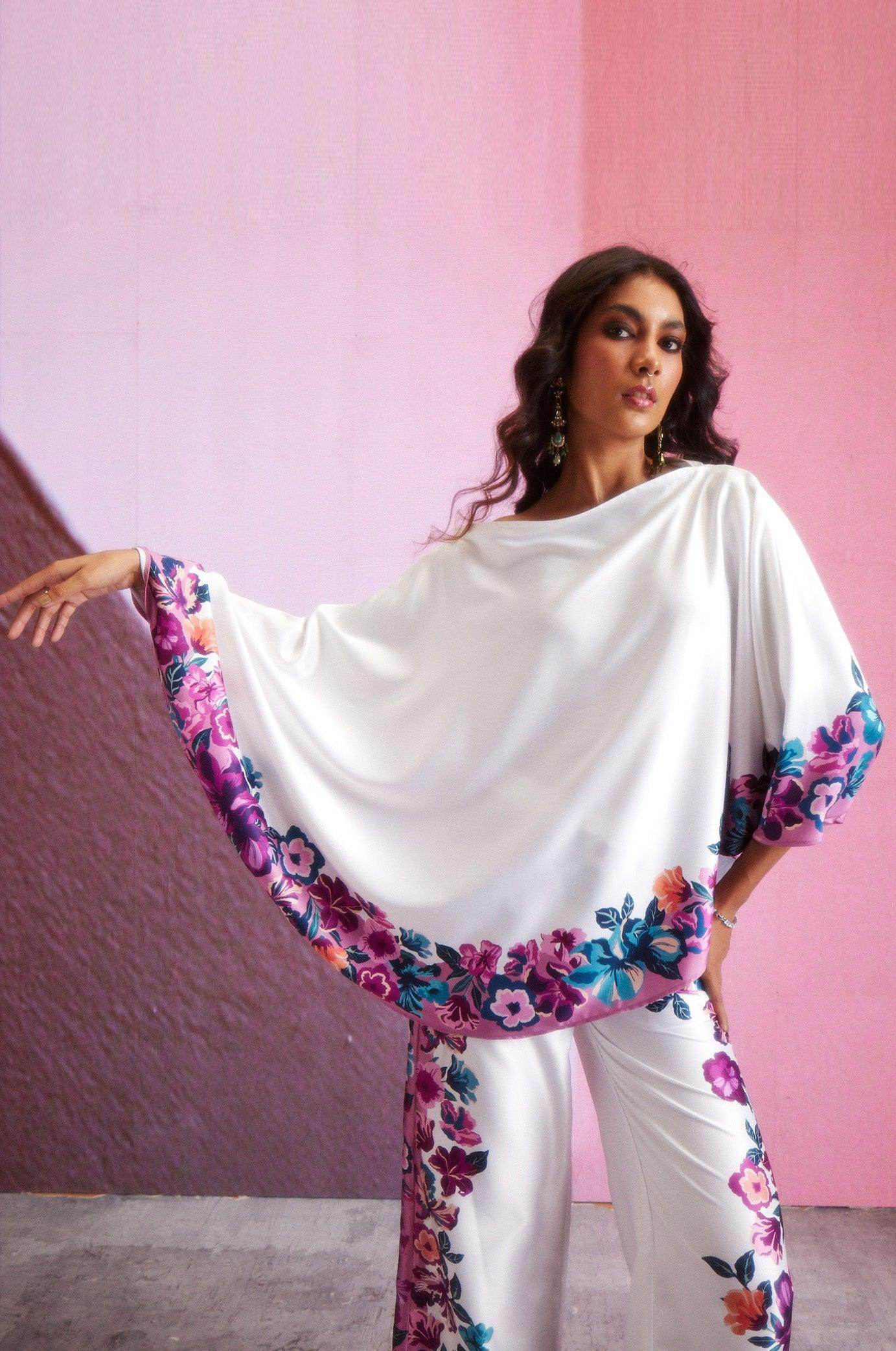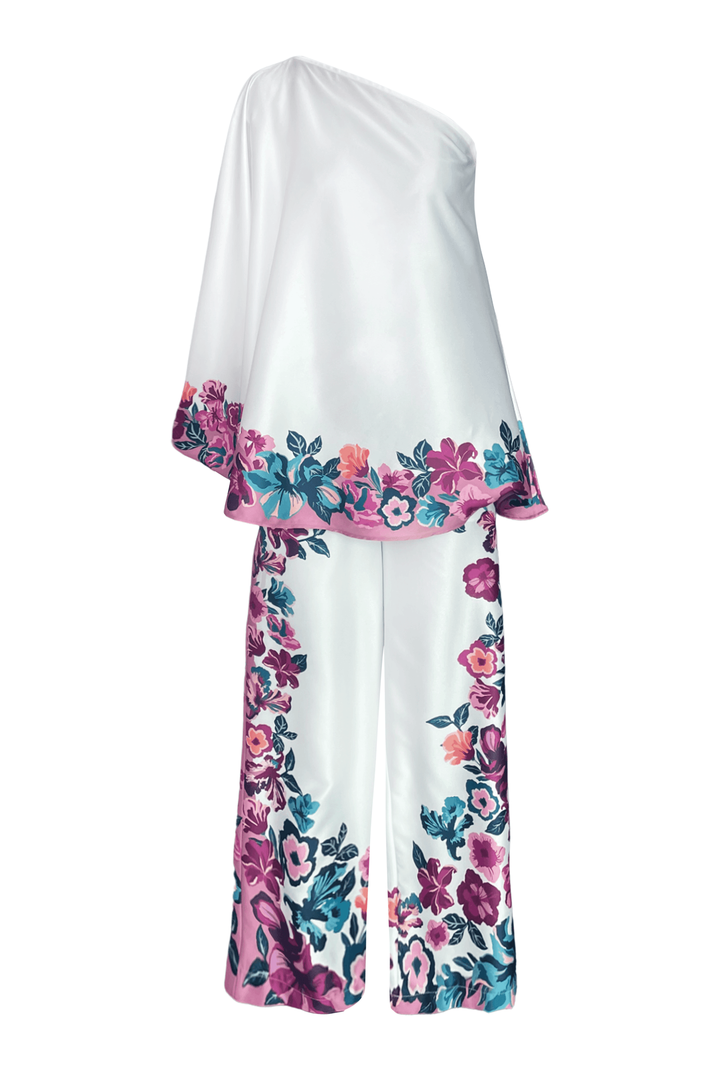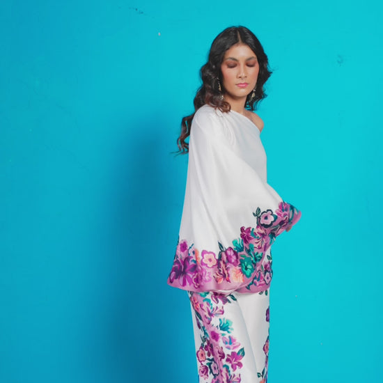 Pant set with multicolor placed floral print around the hem of the top and borders of the pants. Kaftan-inspired circular top can be worn as one shoulder or off-shoulder. Paired with matching straight-fit pants. Button and hook & eye closure at the front. Zip fly. Pockets on the side.