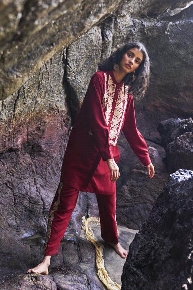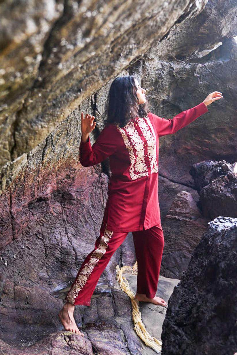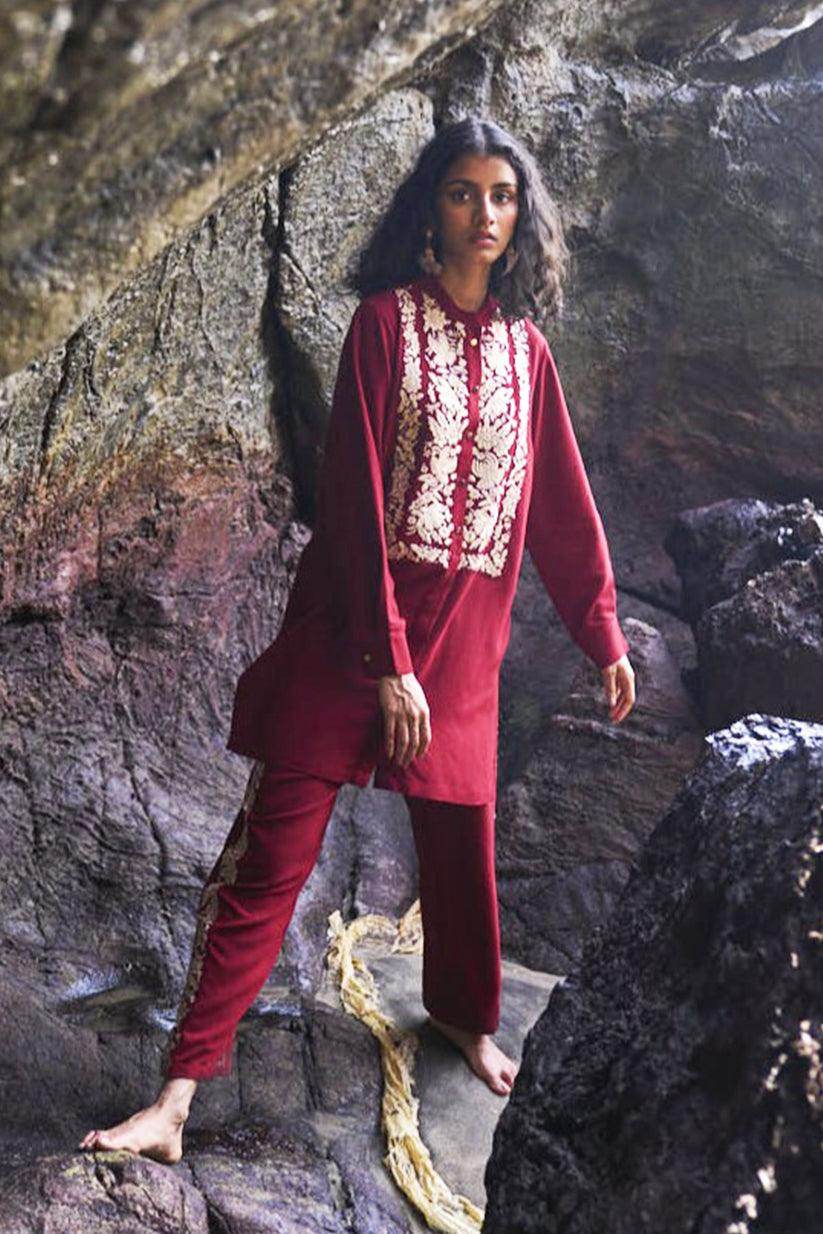 Cherry red longline top with champagne gold floral placed embroidery in the front bib. Band collar, full sleeves, front placket with metal buttons. Paired with matching straight pants with embroidery down the sides. Elasticated at the waist, pockets in the sides.