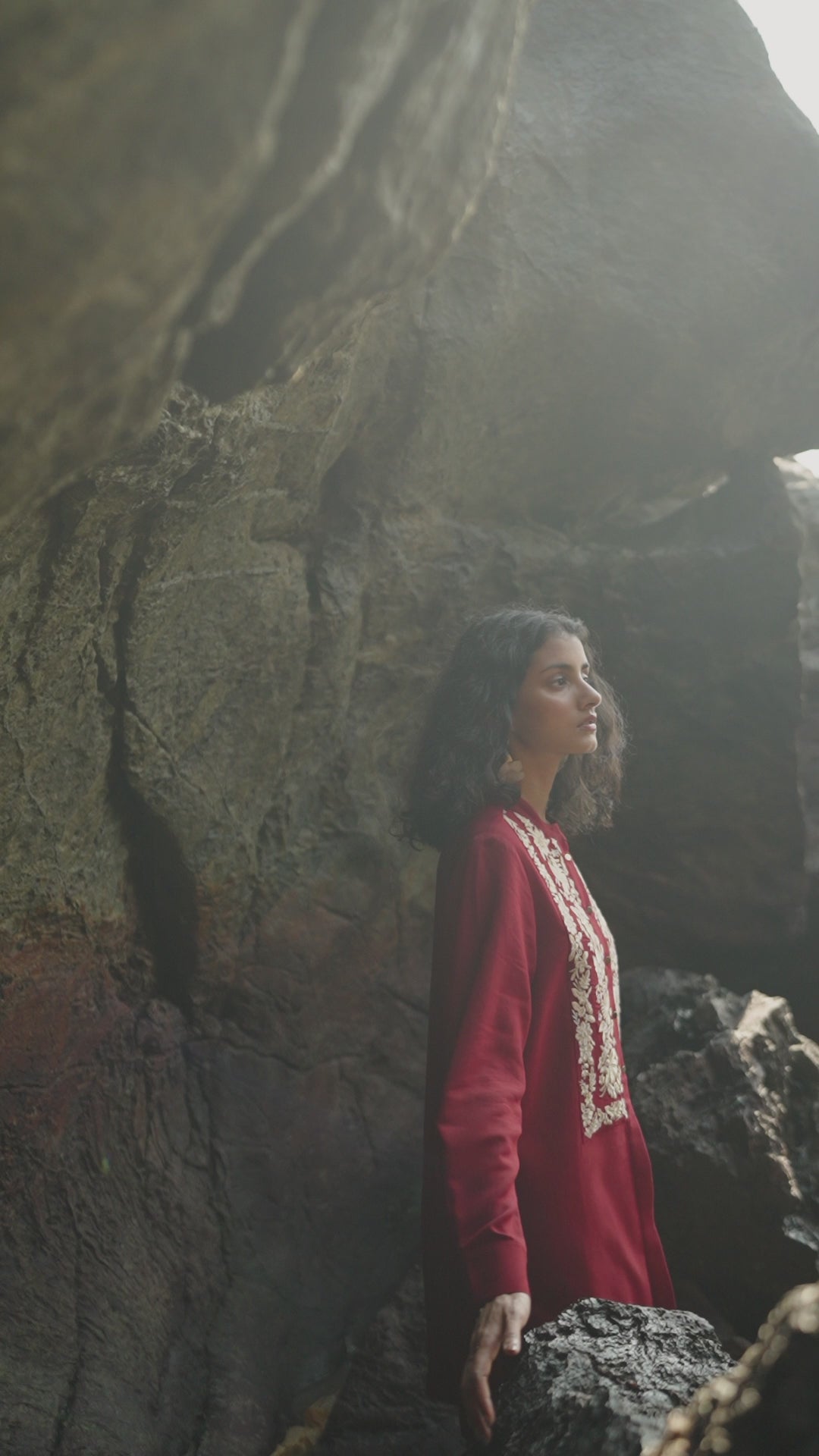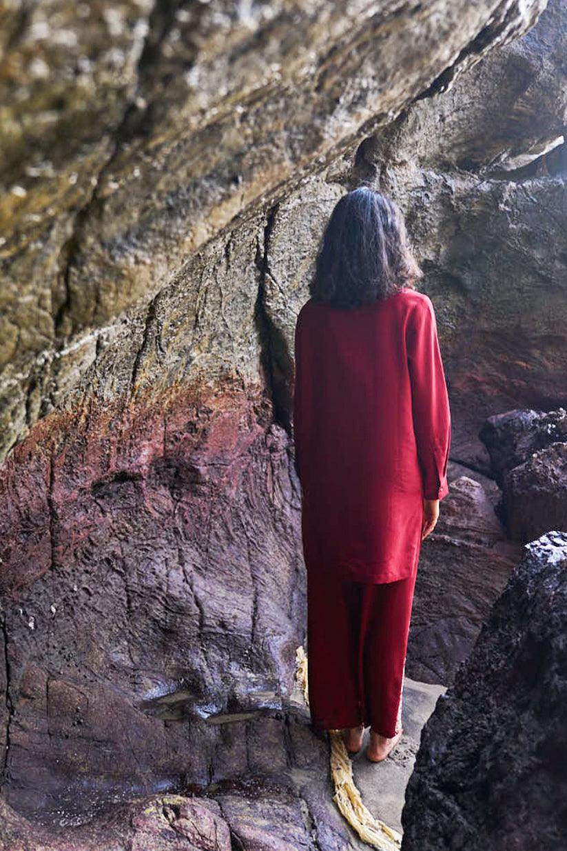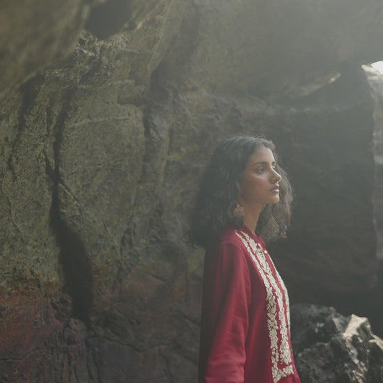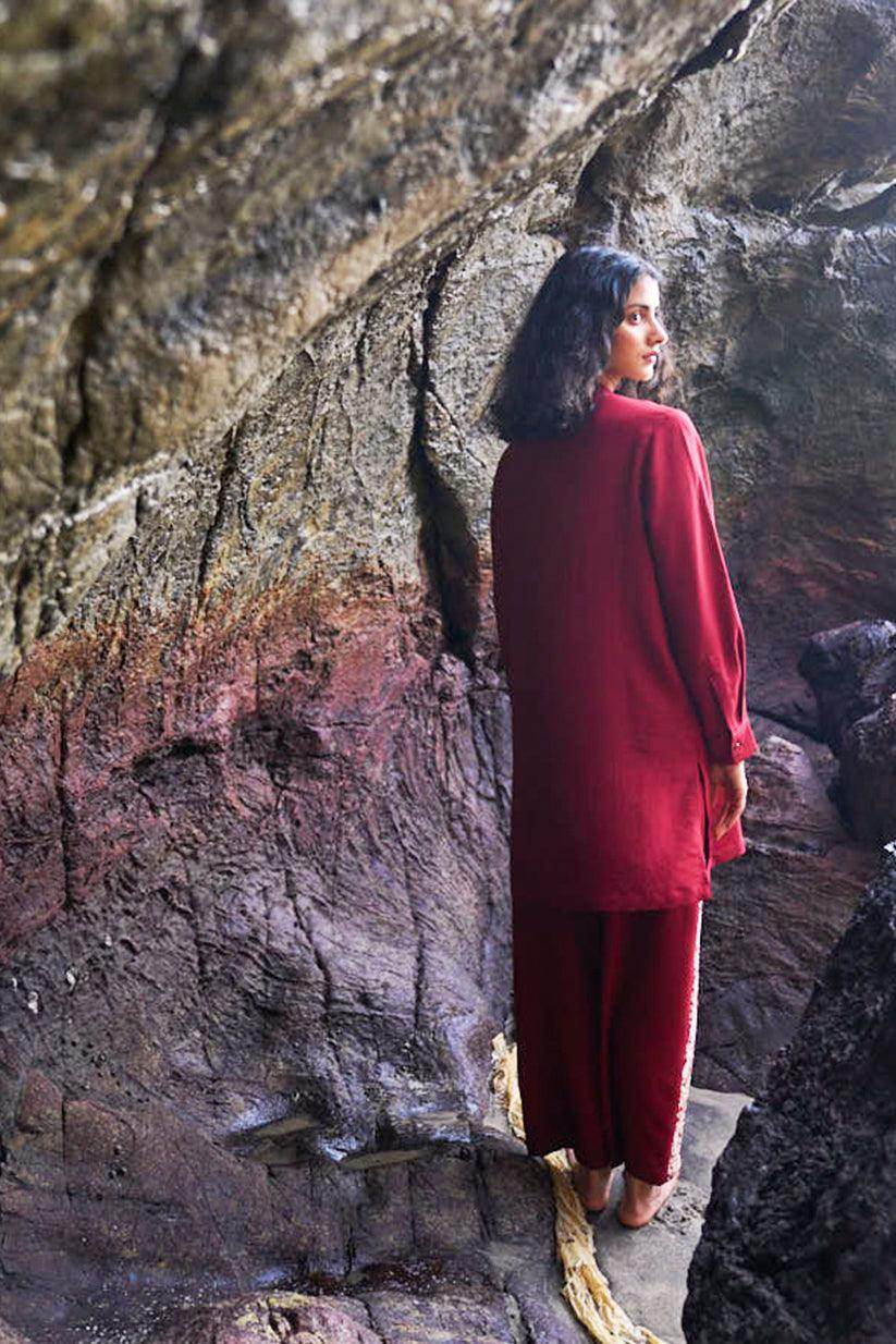 Cherry red longline top with champagne gold floral placed embroidery in the front bib. Band collar, full sleeves, front placket with metal buttons. Paired with matching straight pants with embroidery down the sides. Elasticated at the waist, pockets in the sides.
