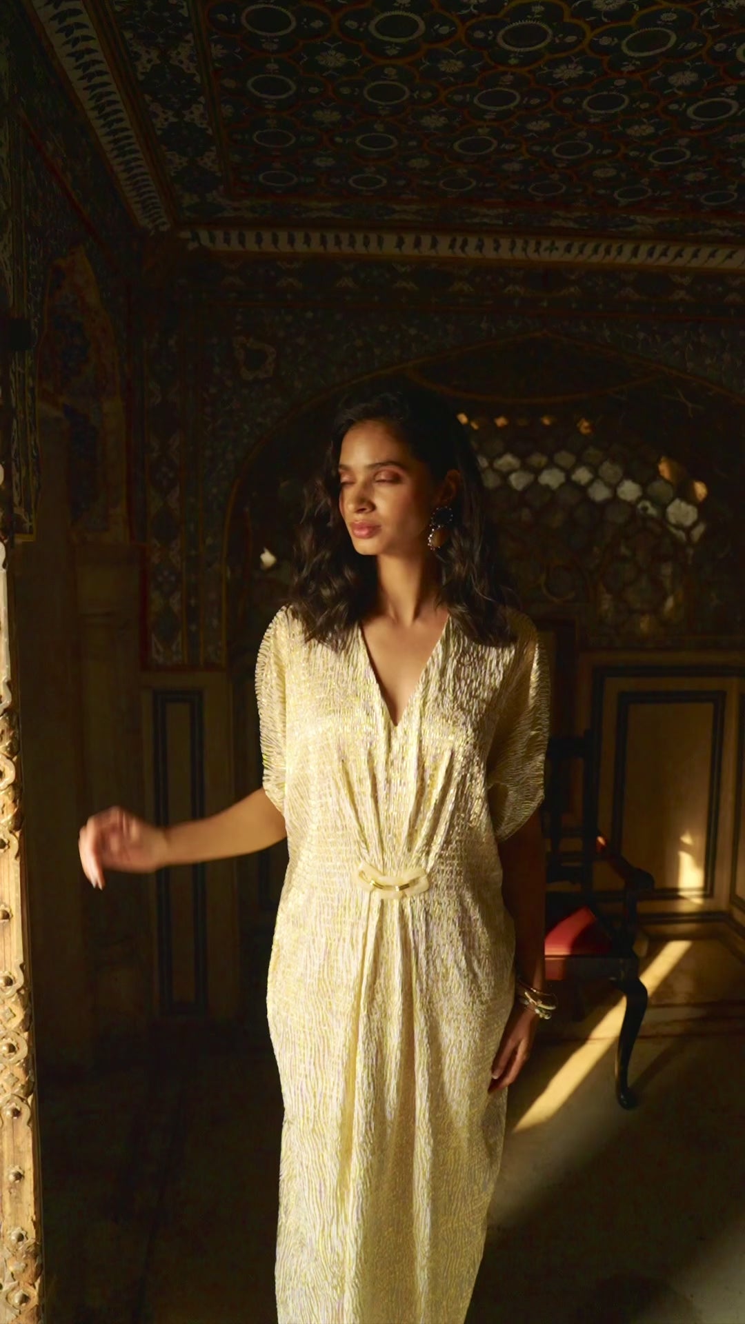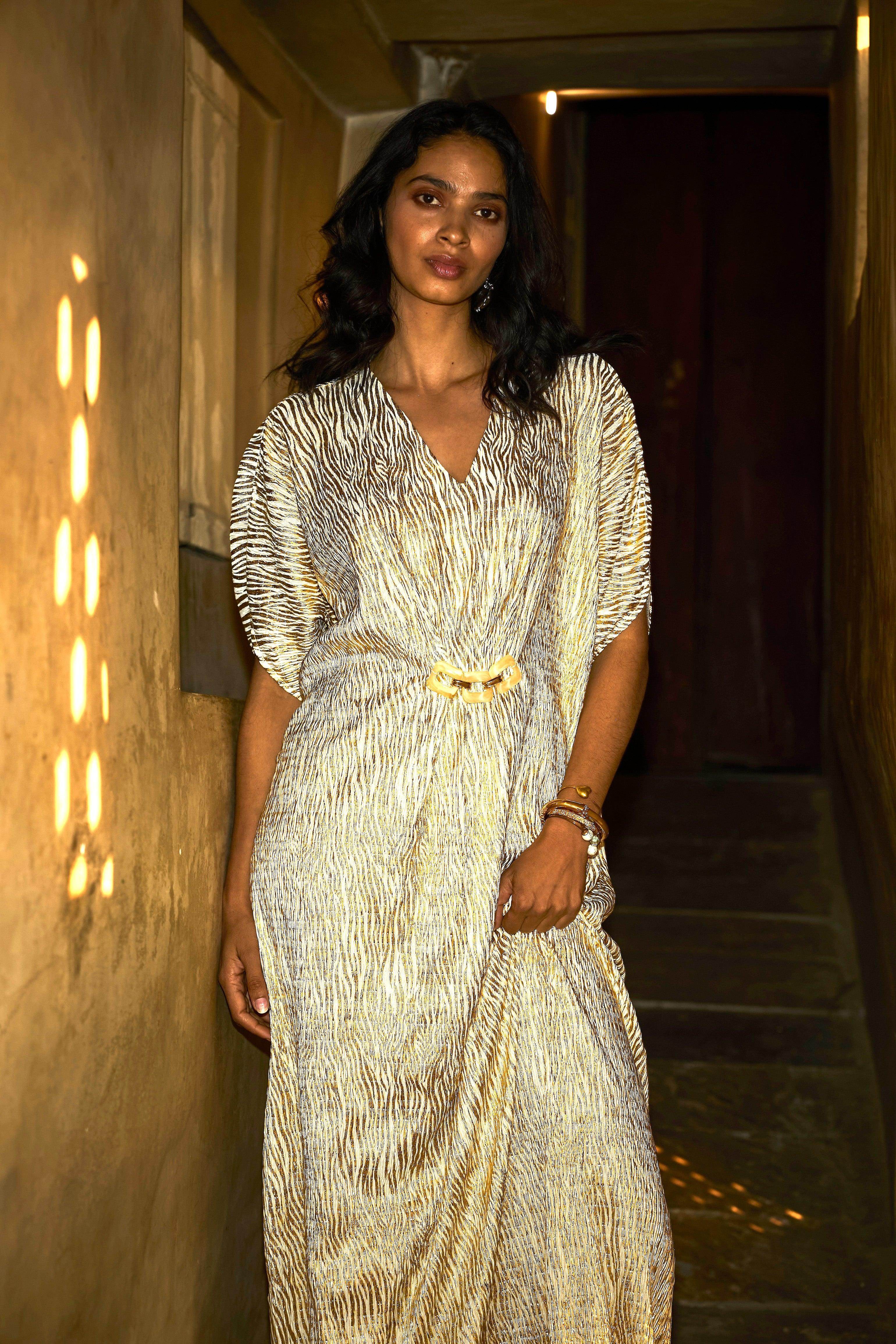 Textured pleated and foiled kaftan maxi. Gold on ivory patterned foil print with foil print with a pearl and gold-finished chain detail in the front. Soft hand-applied gathered pleats add a flattering shape. Dolman sleeve, V-neckline, short sleeves. Comes with a slip.