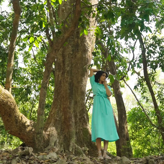 A-line midi dress with a front tie and high waist cut-outs. Shirt collar, front placket and relaxed fit half sleeves. Pockets on the sides.