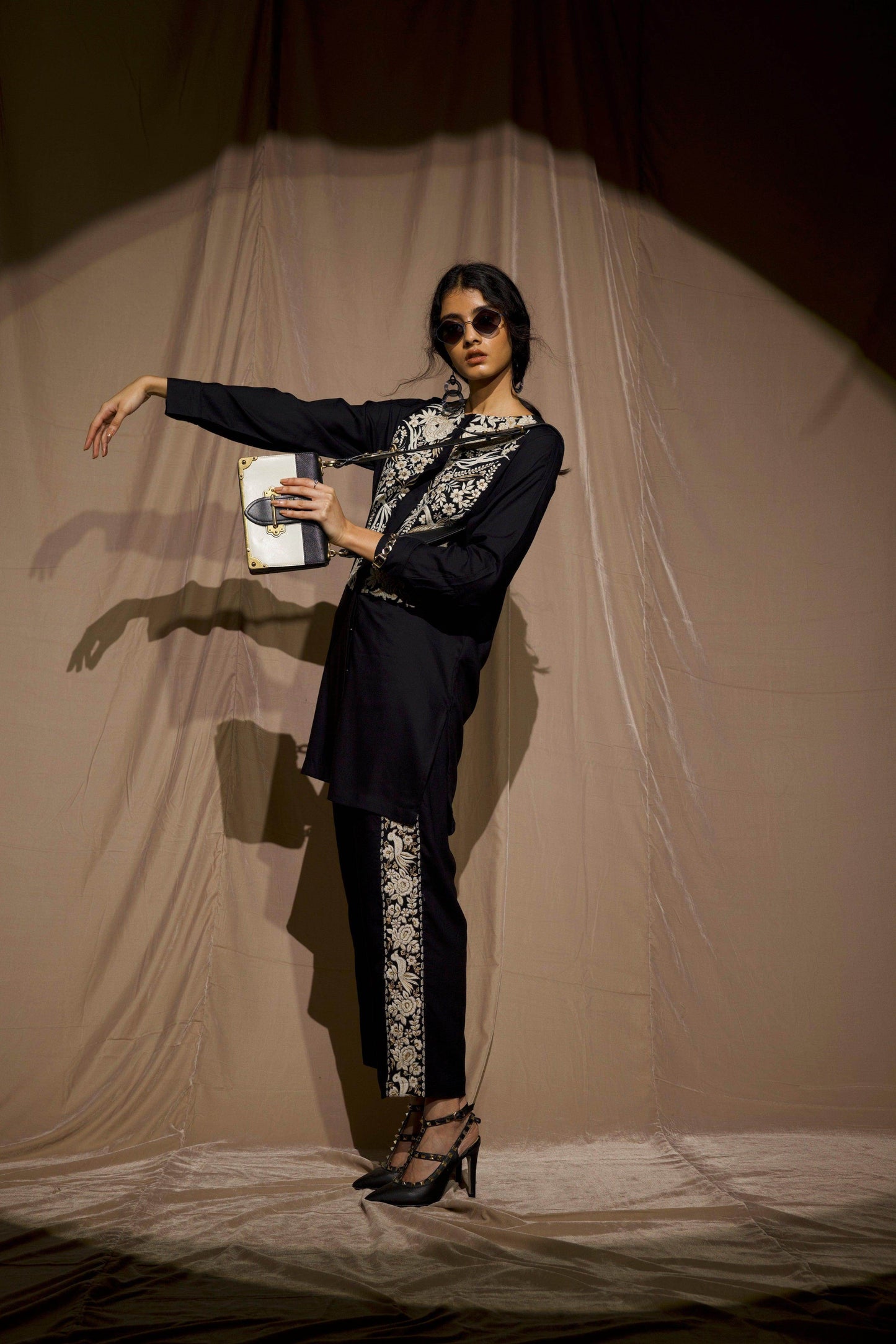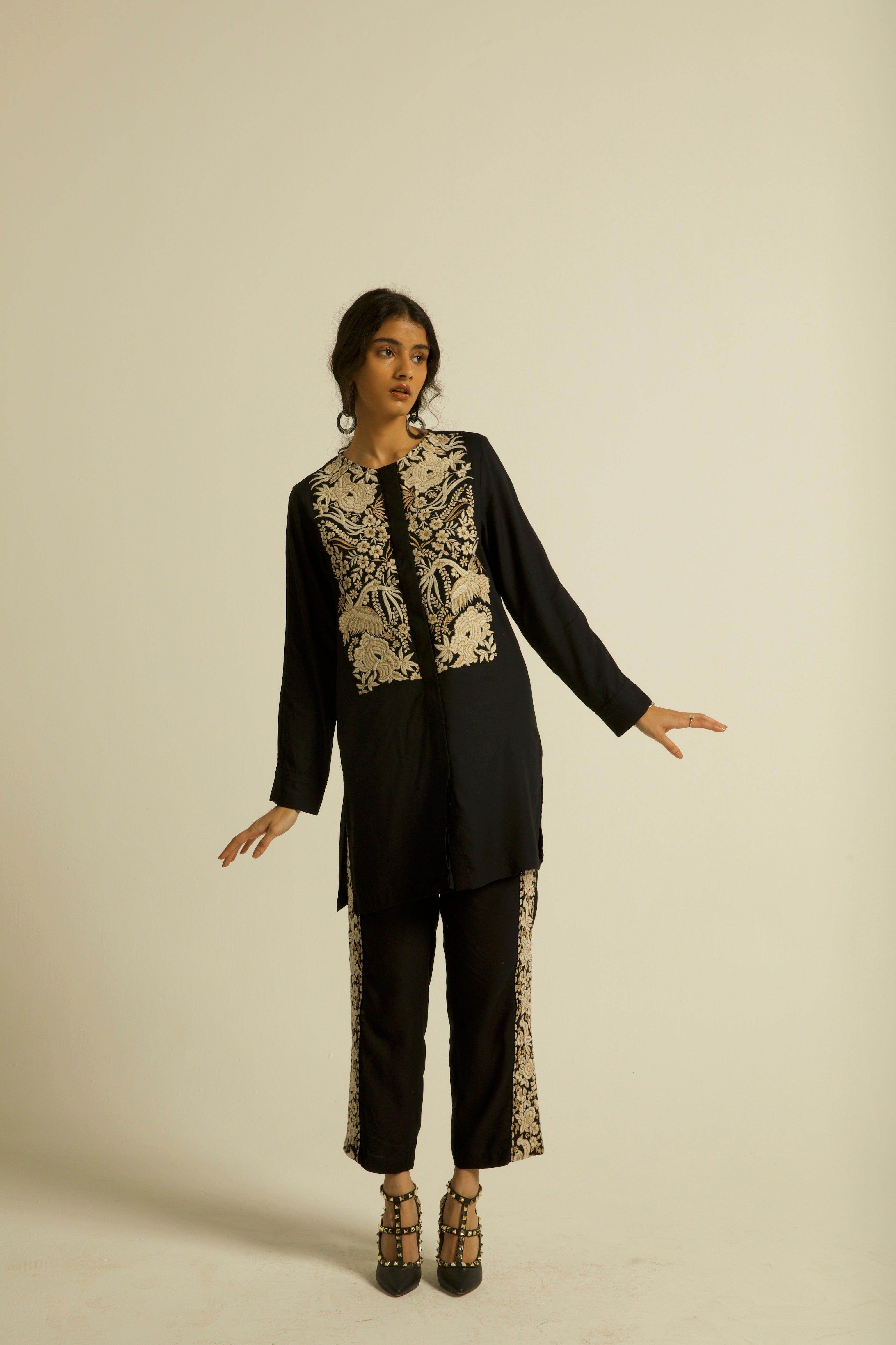 Black rayon shirt with Gara stitch inspired embroidery at the yoke. Longline shirt with concealed placket. Regular fit.