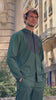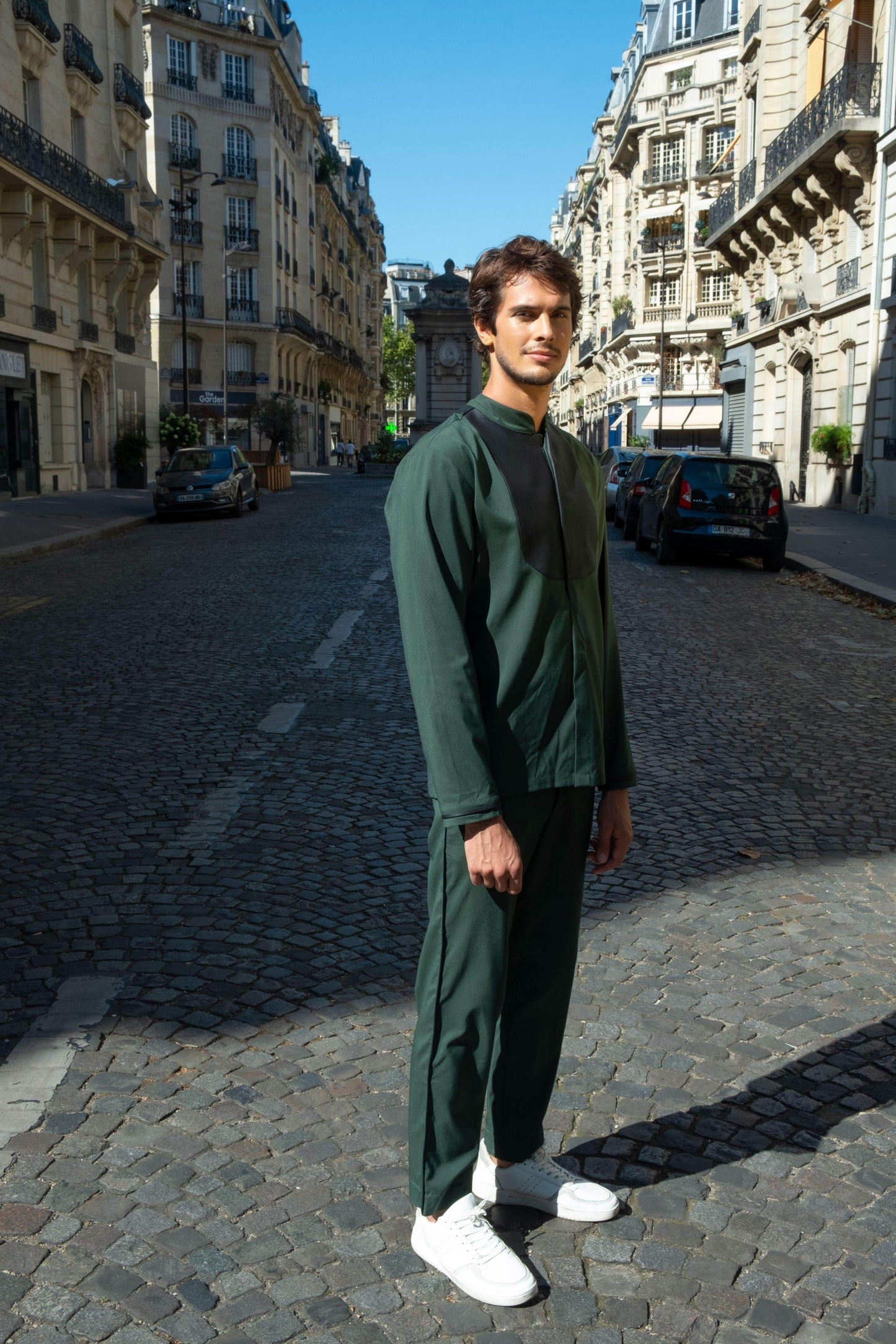 Green band collar full sleeve shirt with faux-leather bib panel at the front. Leather piping detail at the cuff and back of the collar. Concealed buttons. Regular fit. Paired with matching pants with leather piping detail down the sides. Zip closure at the front, belt loops. Pockets on the side and back. Made of all weather suiting material.