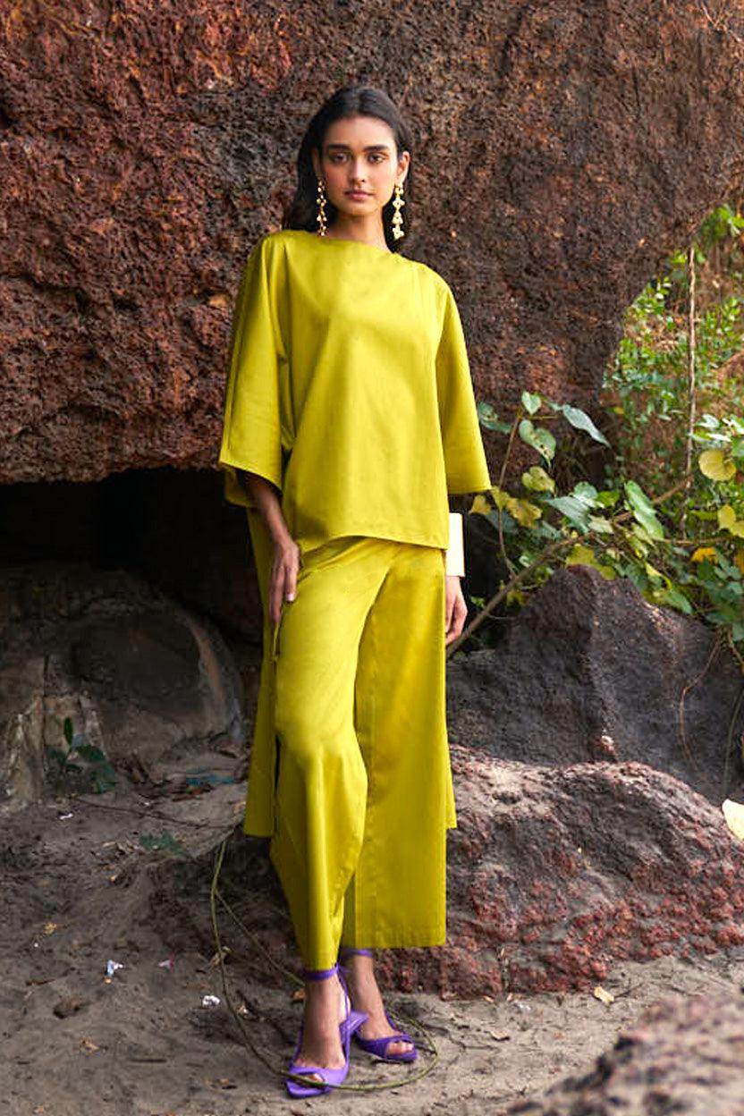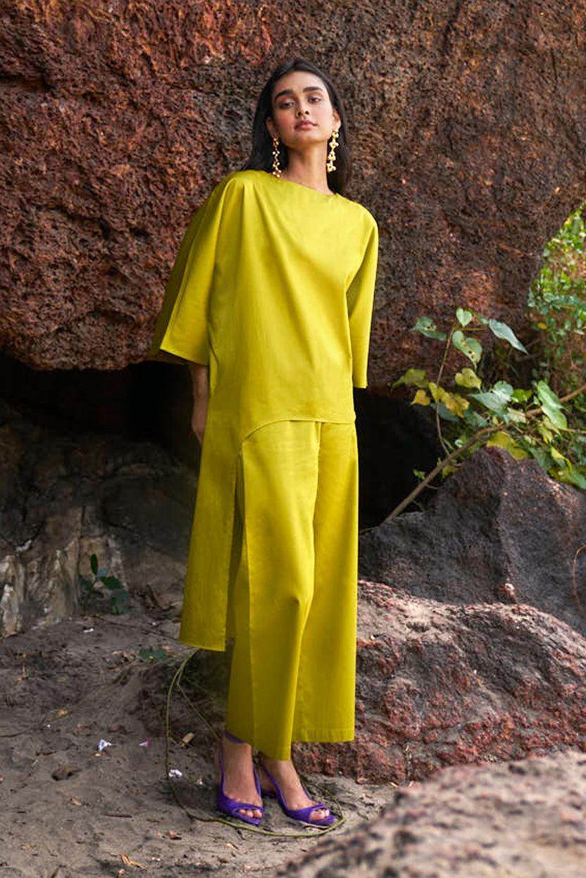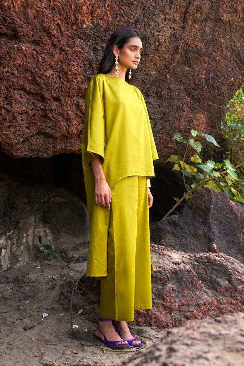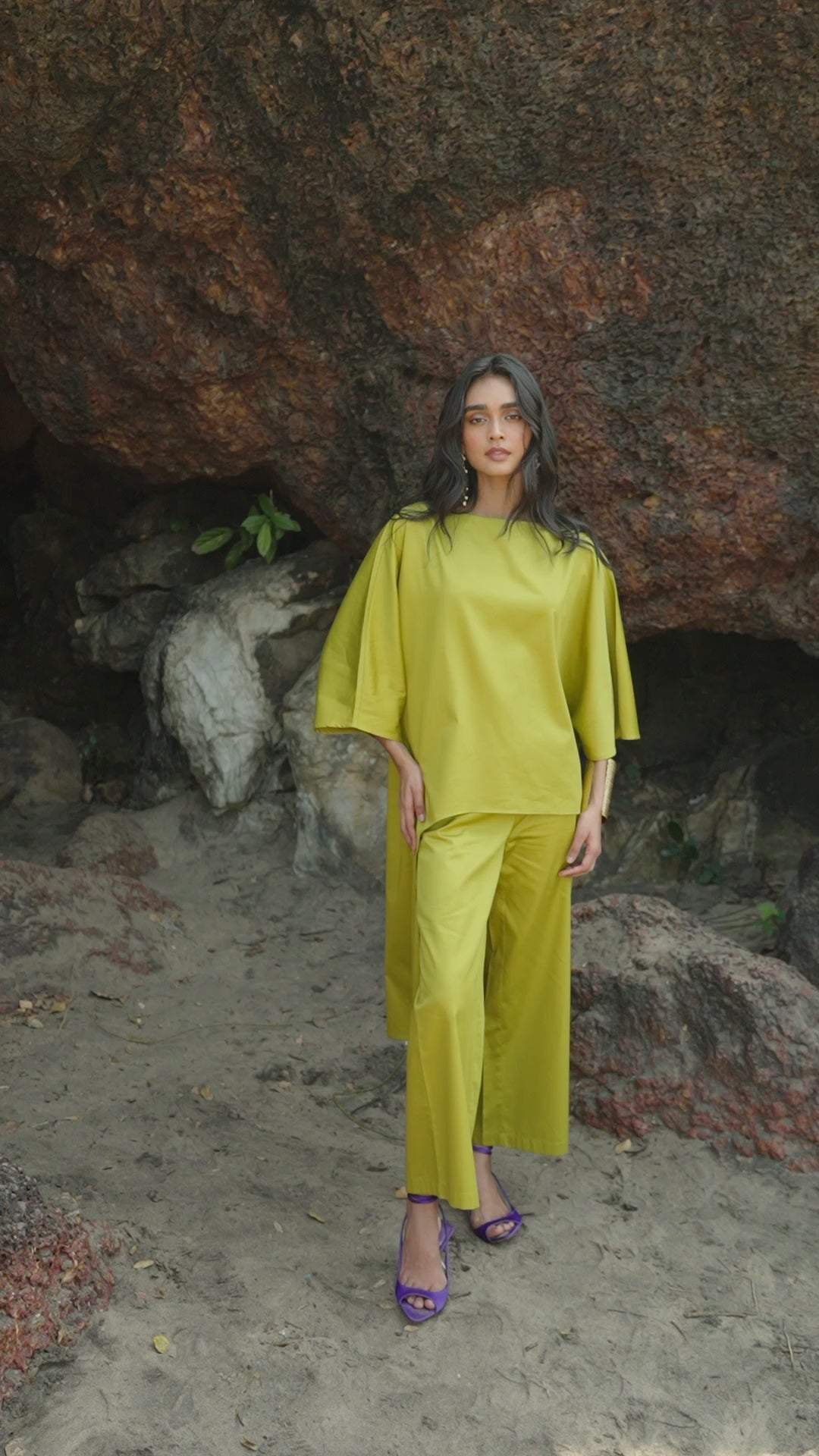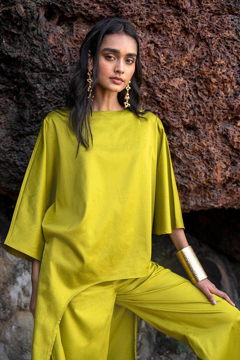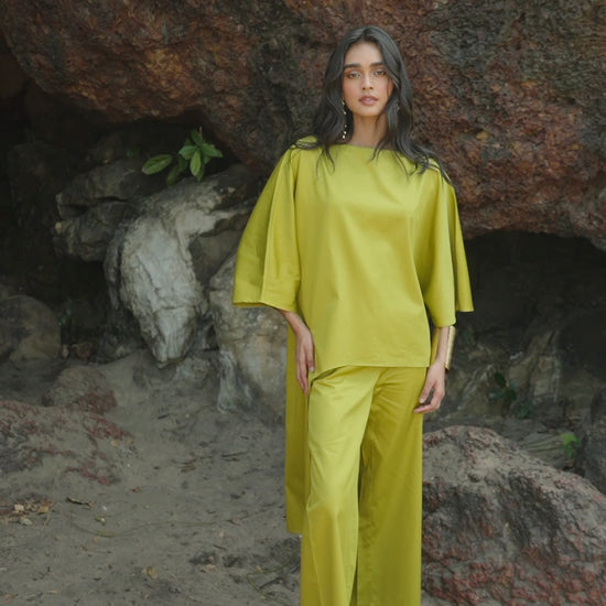 Olive green cotton coord set. High-low top with a boat neck. Dolman sleeve on one arm and a cape sleeve on the other. Back is dramatically long and creates movement.