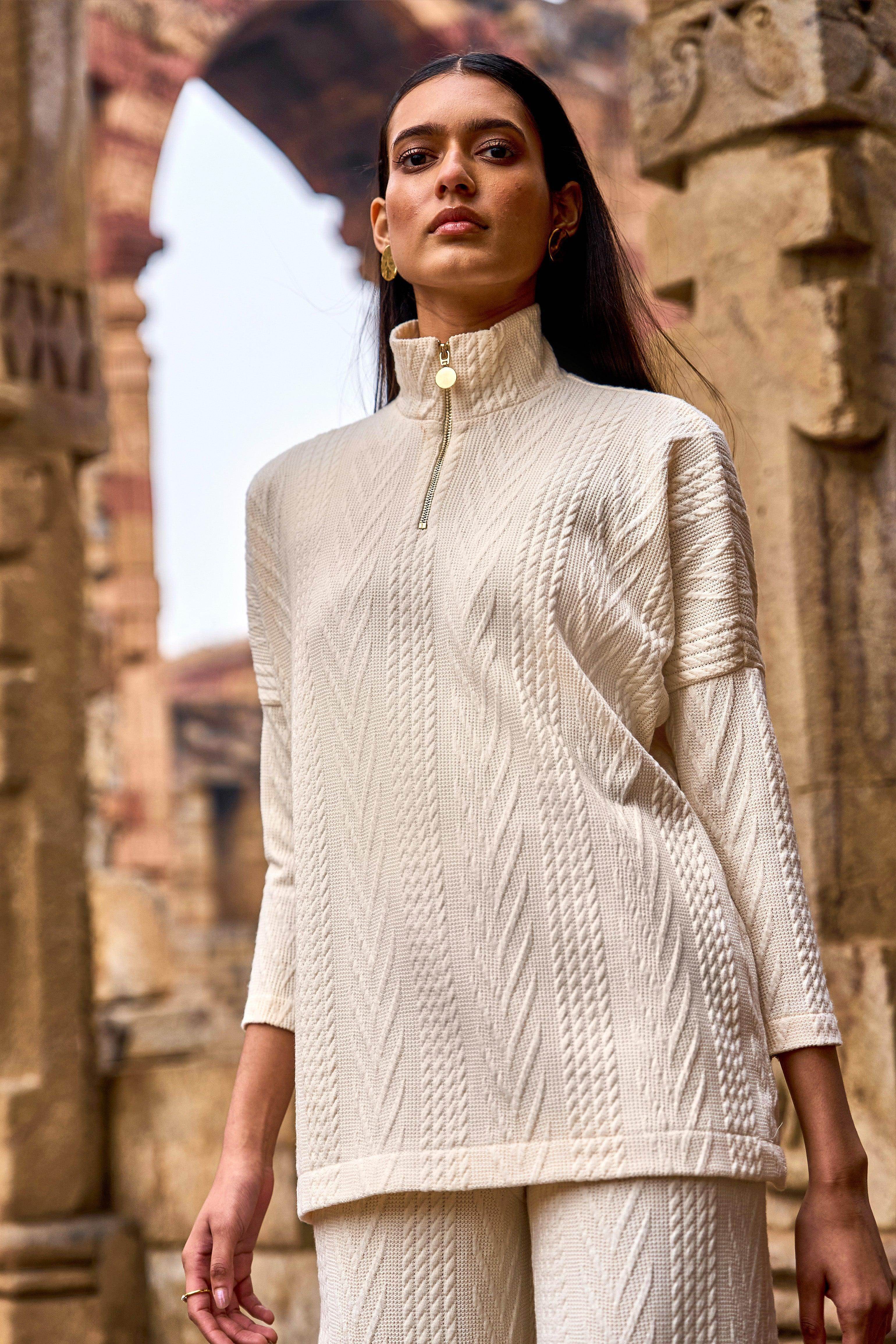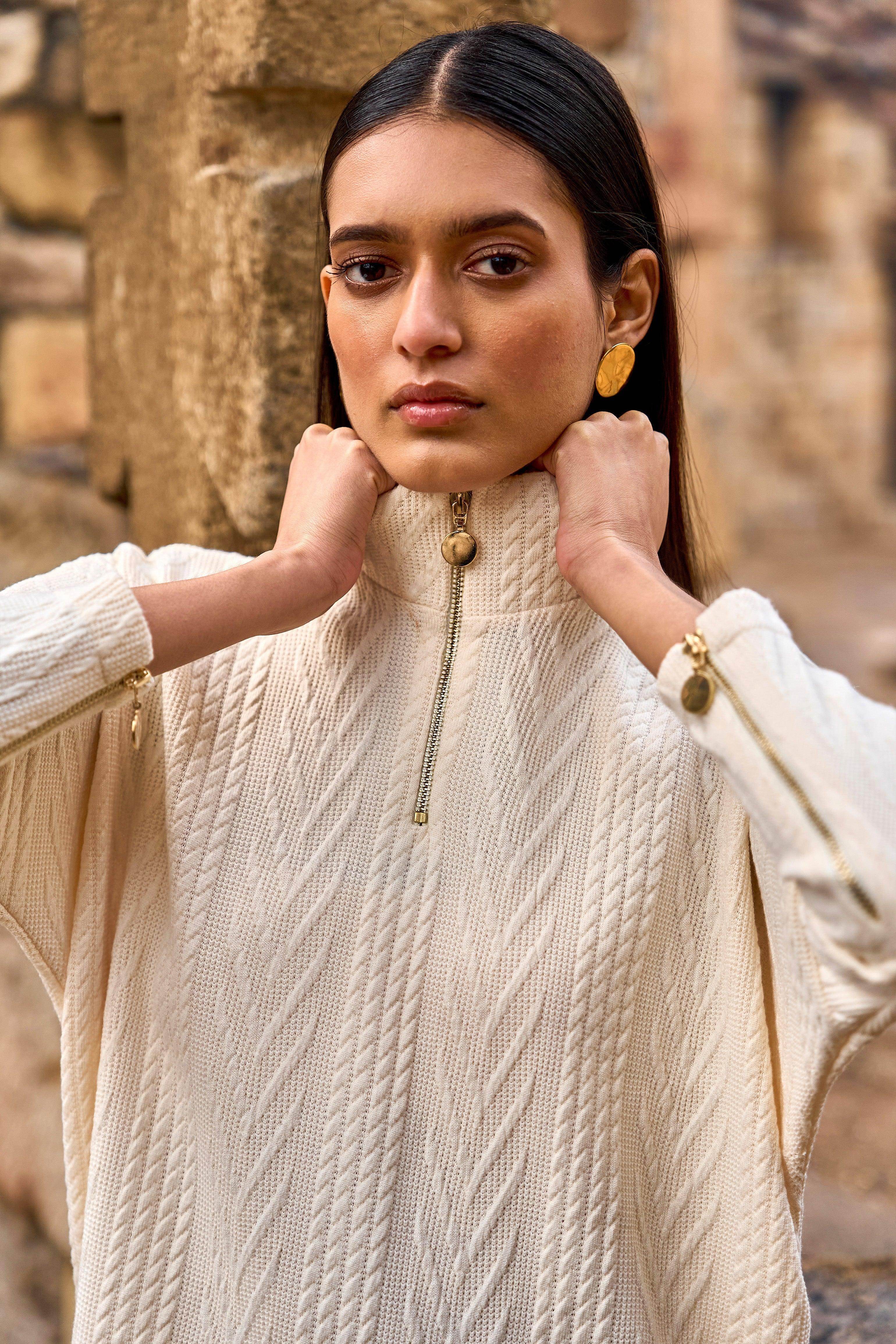 Soft knitted band collared popover top. Textured jacquard in a cable knit pattern. Gold zip with round puller tabs on the front neck and sleeve cuffs. Relaxed fit.