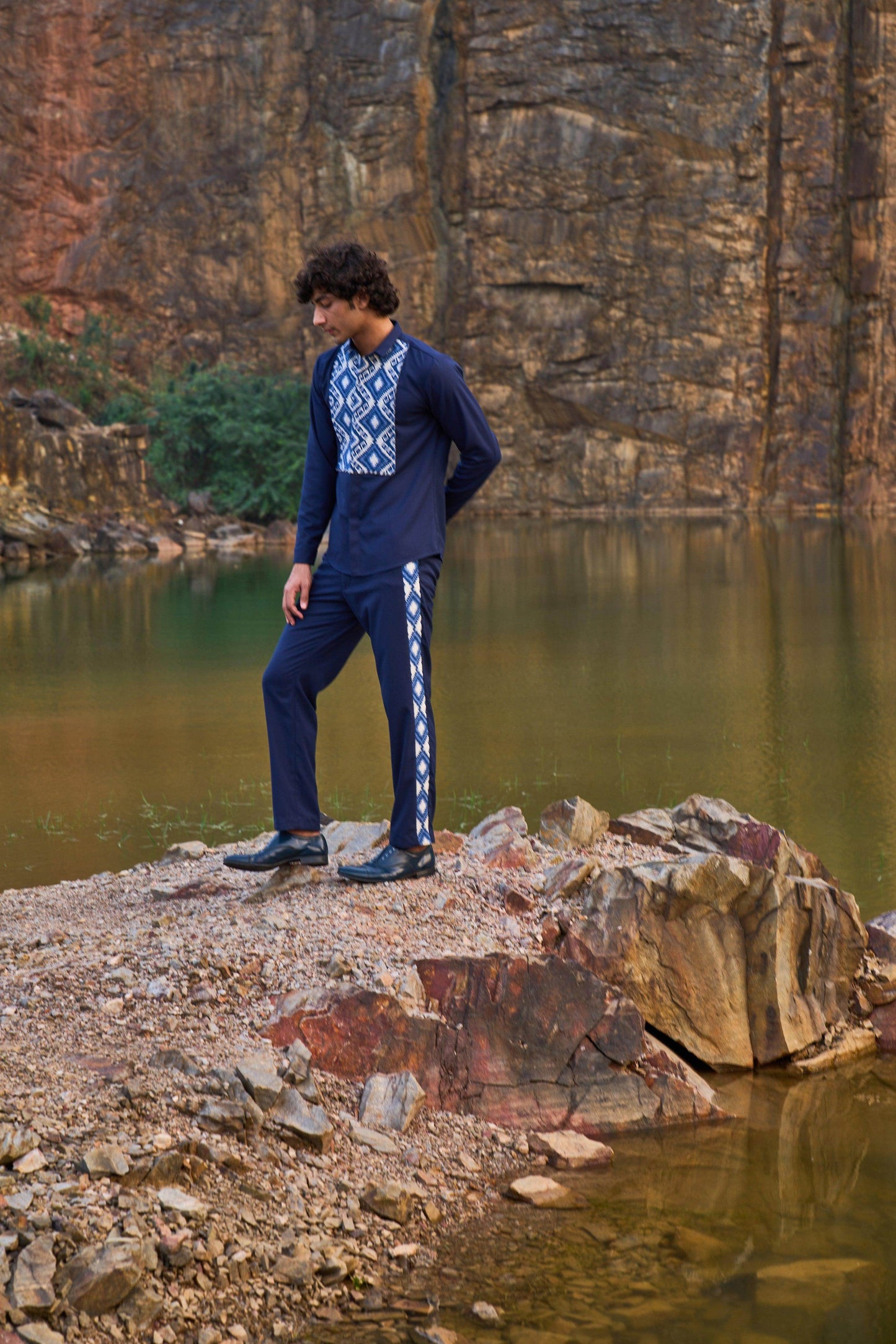 Blue button-down full sleeve shirt with a paneled patterned jacquard bib at the front. Concealed buttons. Regular fit. Paired with matching pants with patterned jacquard stripe detail down the sides. Zip closure at the front, belt loops. Pockets on the side and back. Made of all weather suiting material.