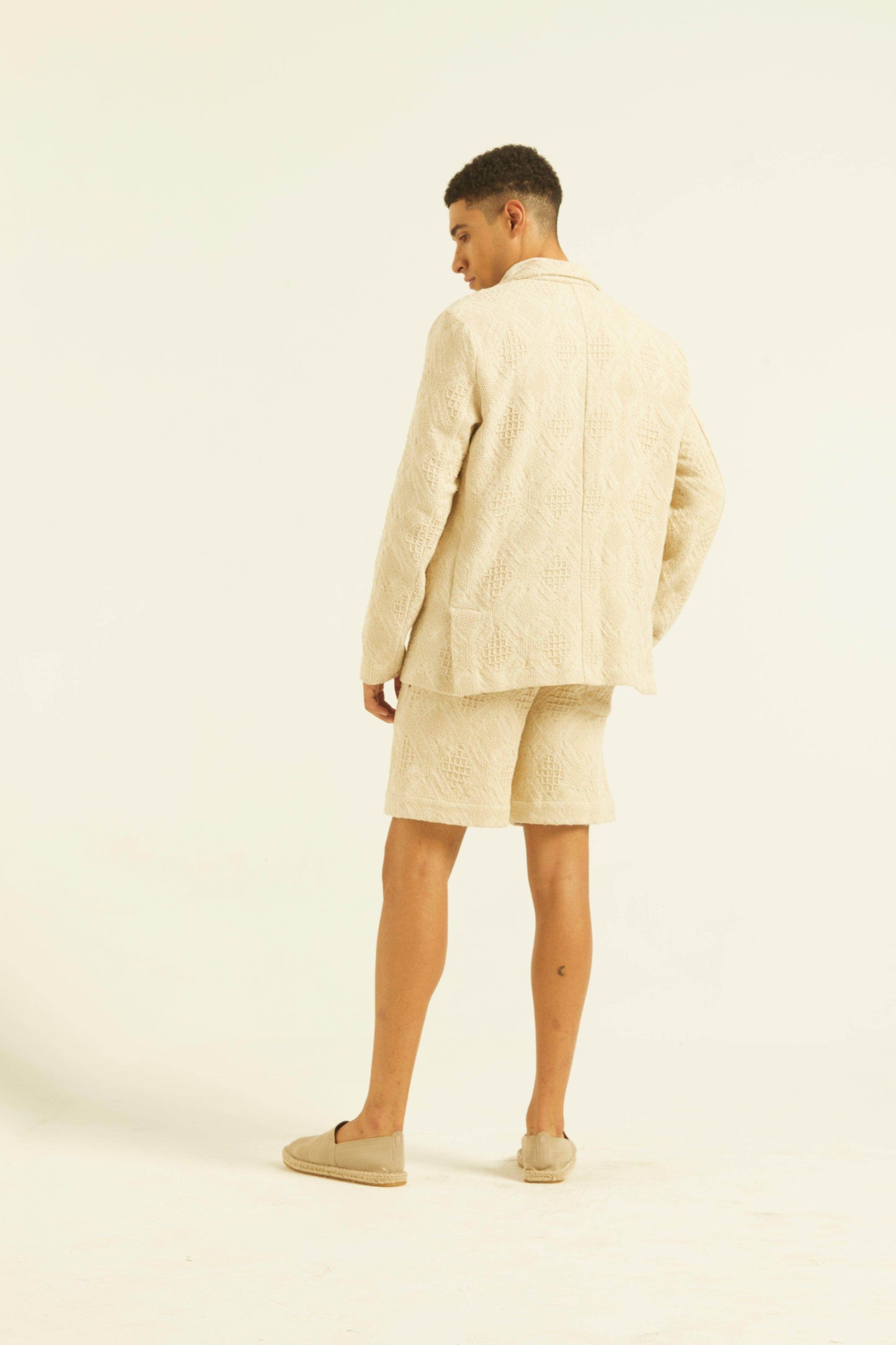 Single-button summer suit jacket made of patterned ivory tonal jacquard fabric. Lapels and pockets at the front. Regular fit. Paired with matching shorts. Elasticated at the waist, pockets in the side and back. Zip fly.