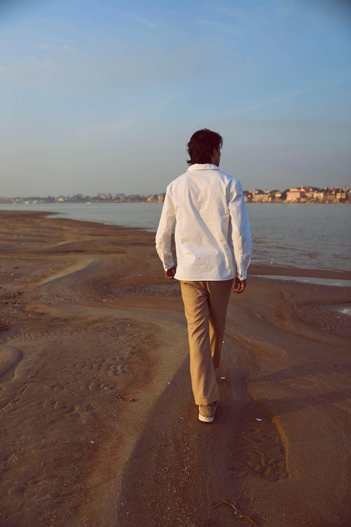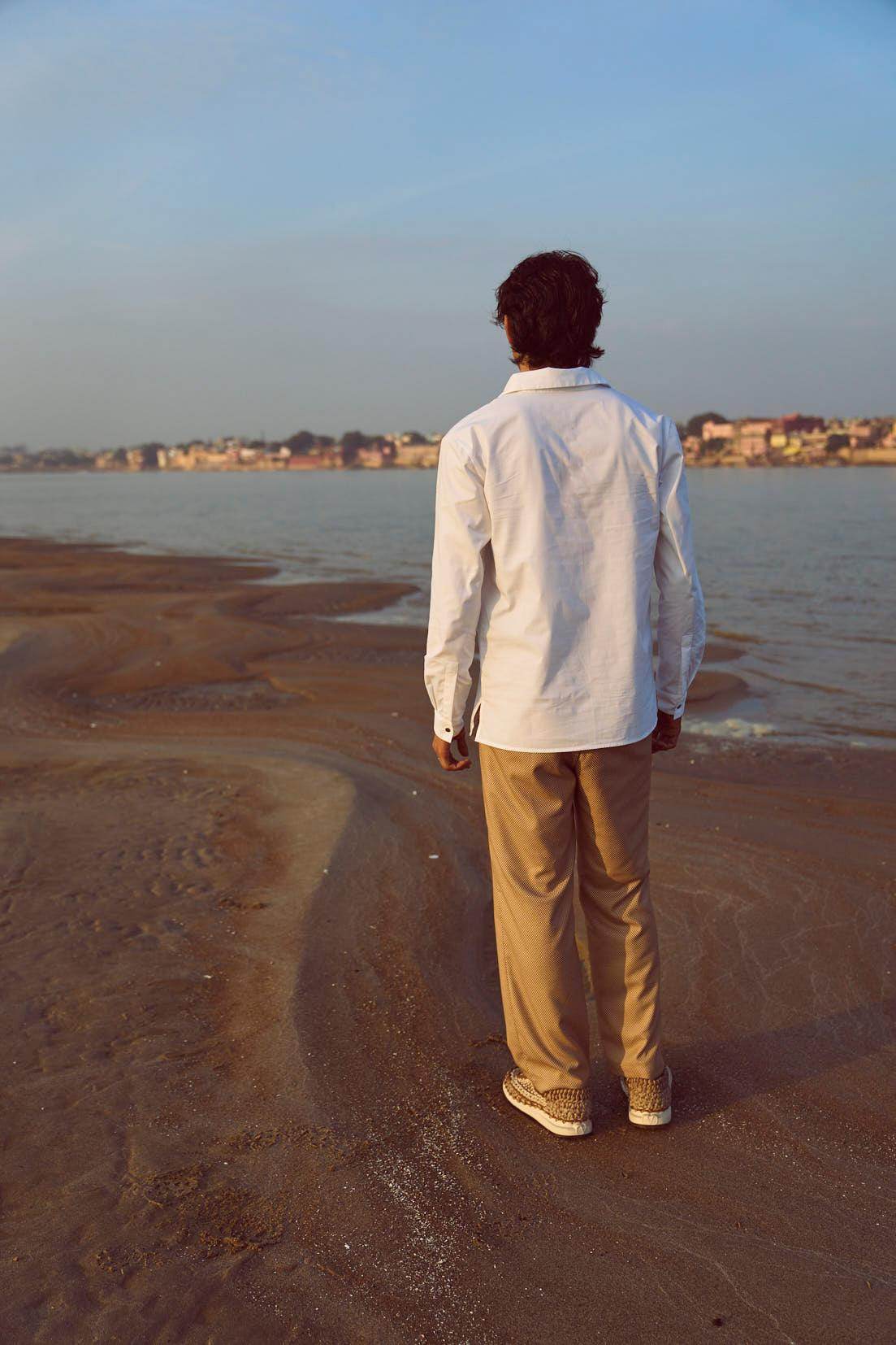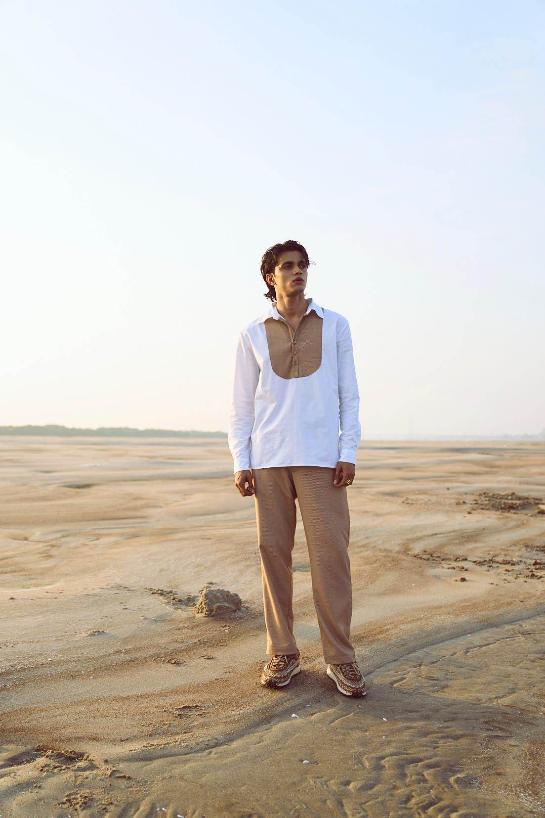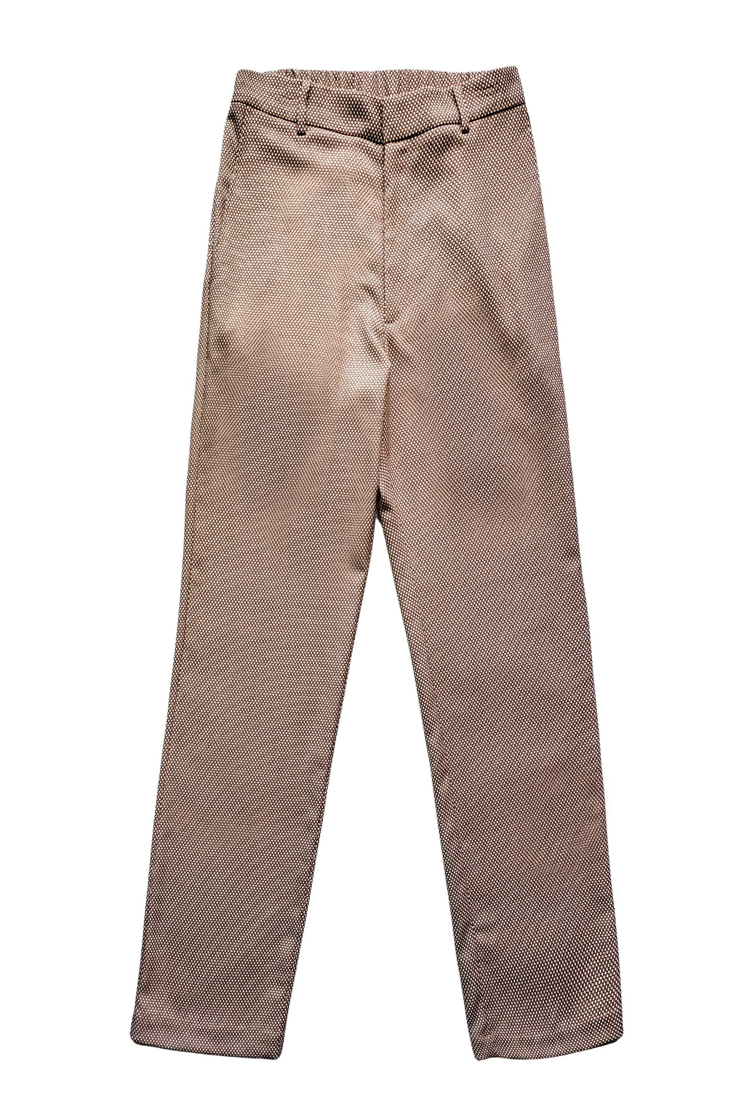 Khaki and white textured straight-fit pants. Pockets on the side and back. Semi elasticated at the waist. Hook and zip closure at the front. Belt loops.