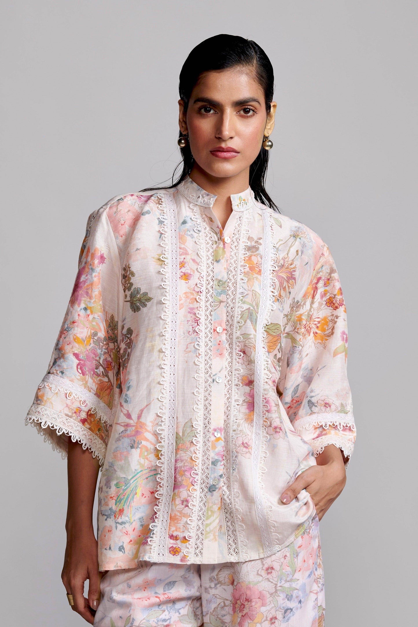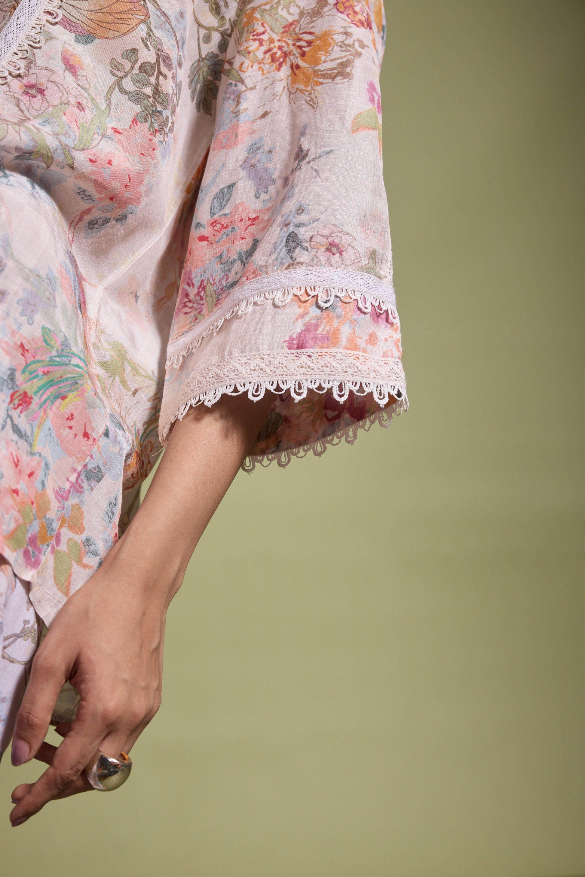 Pastel multi-floral print on a breathable natural linen blend base. Features natural contrast laces on the band collar, front, back, and sleeves. Button-down placket in the front with soft gathers in the back. Relaxed fit.