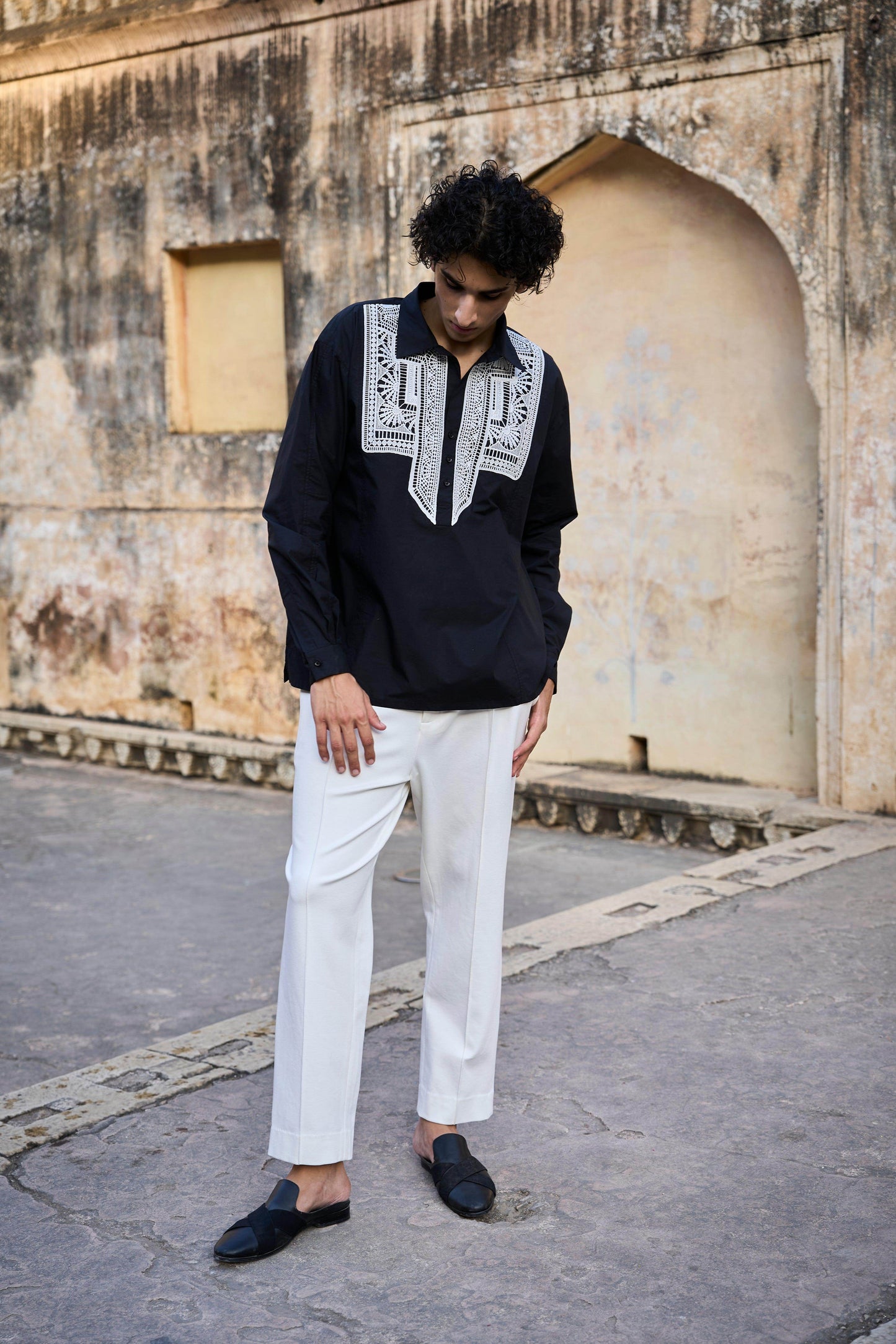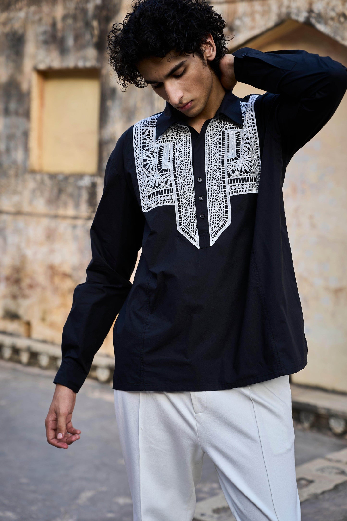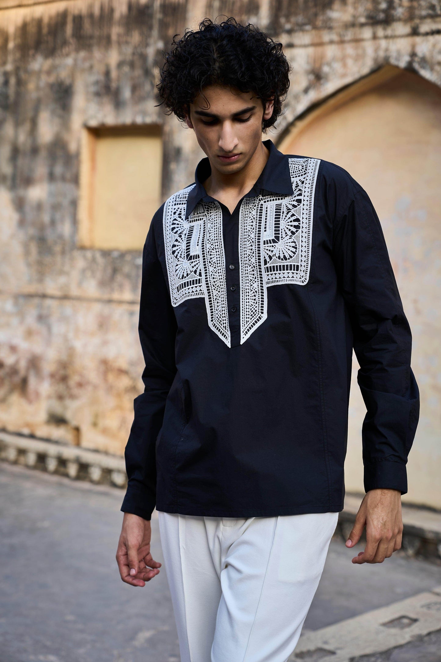 Relaxed fit popover shirt in black organic cotton poplin. Geometric and baroque inspired contrast white lace patch frames the front placket. Full sleeves, shirt collar.