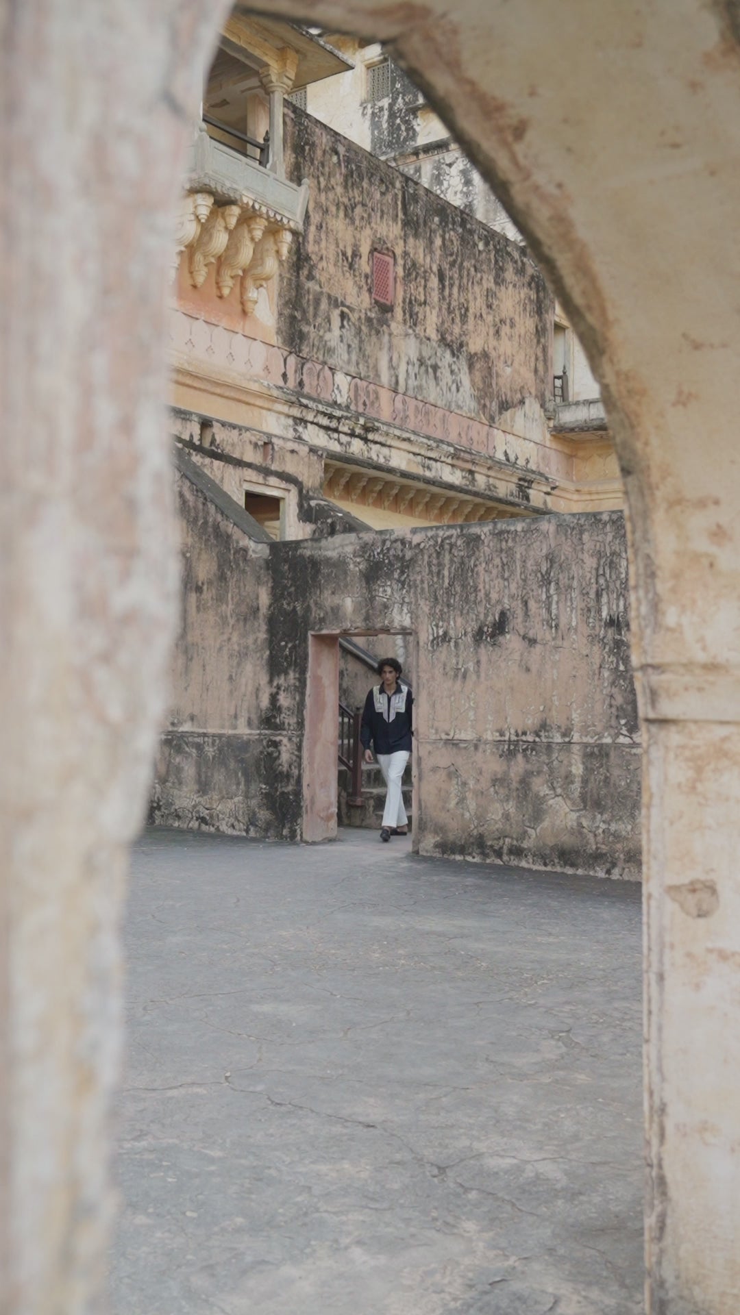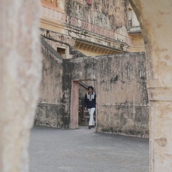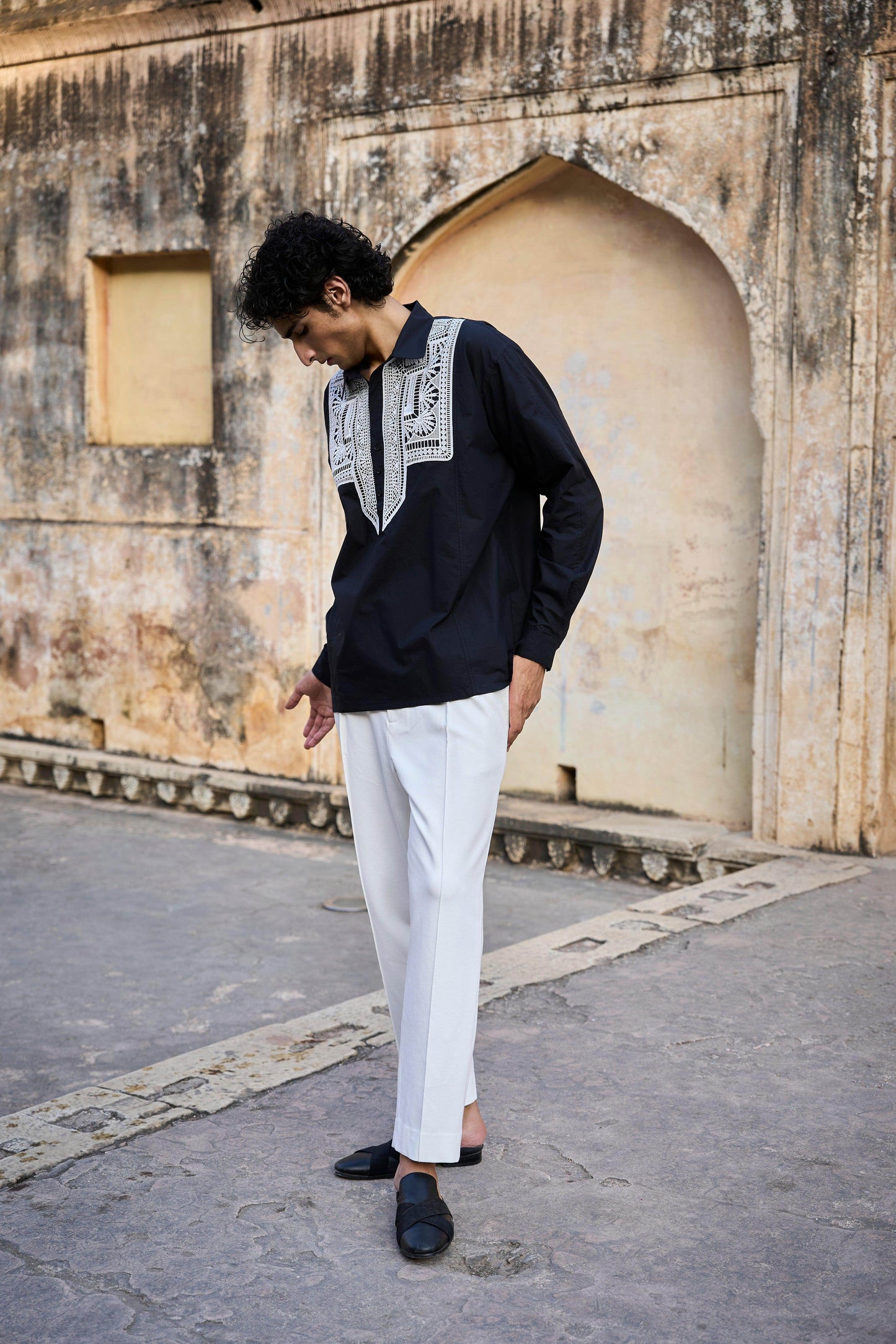 Relaxed fit popover shirt in black organic cotton poplin. Geometric and baroque inspired contrast white lace patch frames the front placket. Full sleeves, shirt collar.