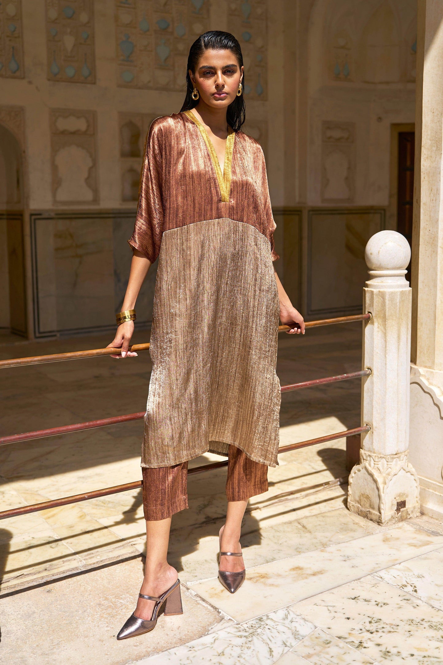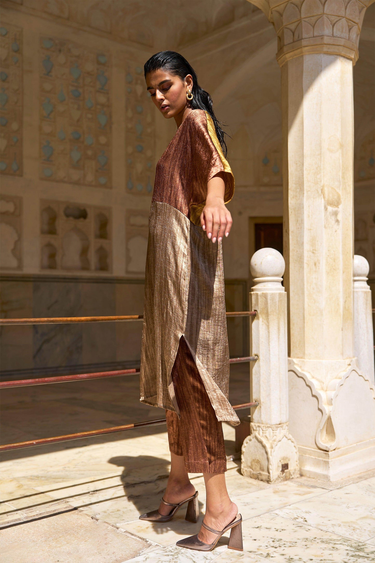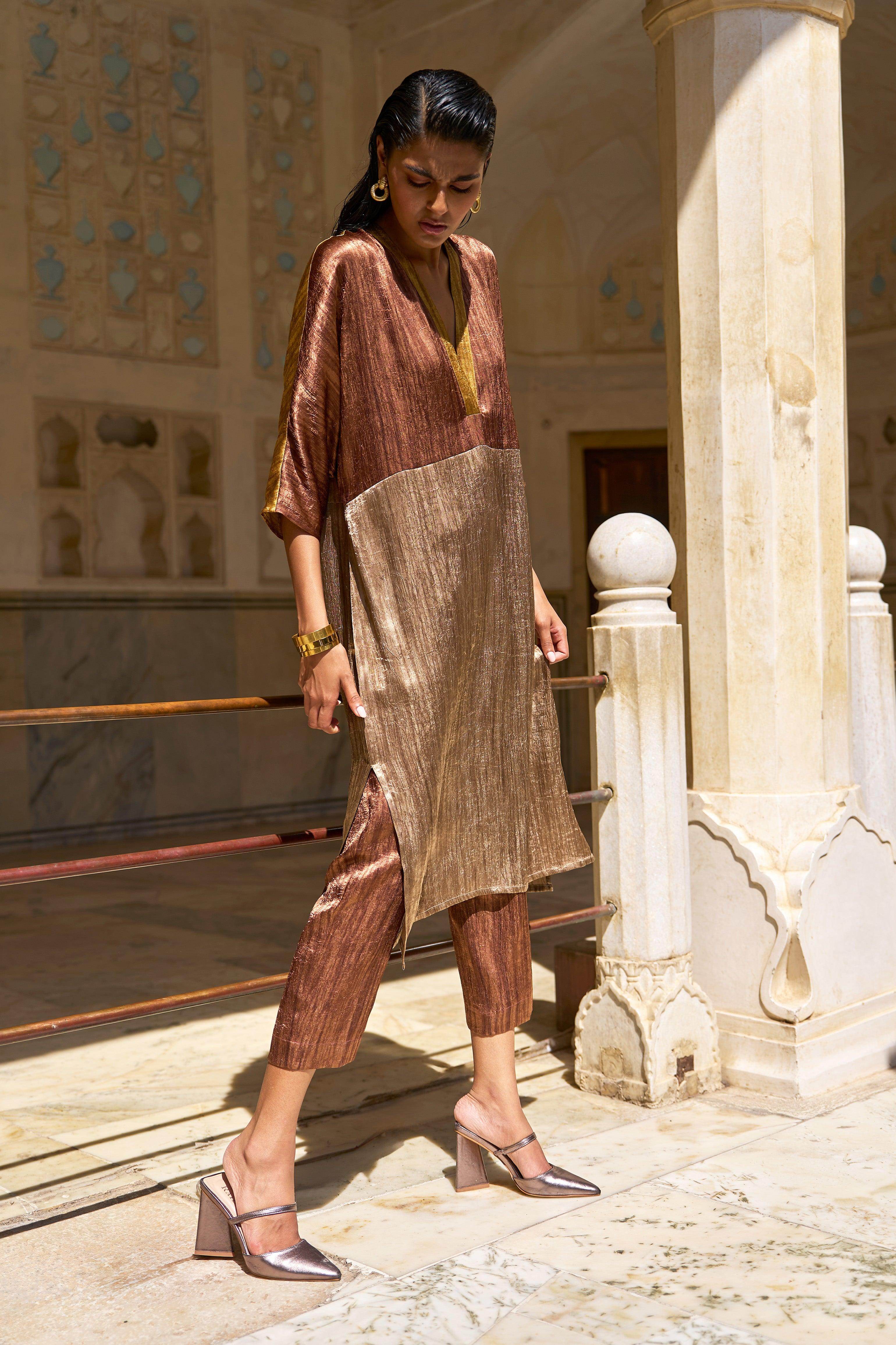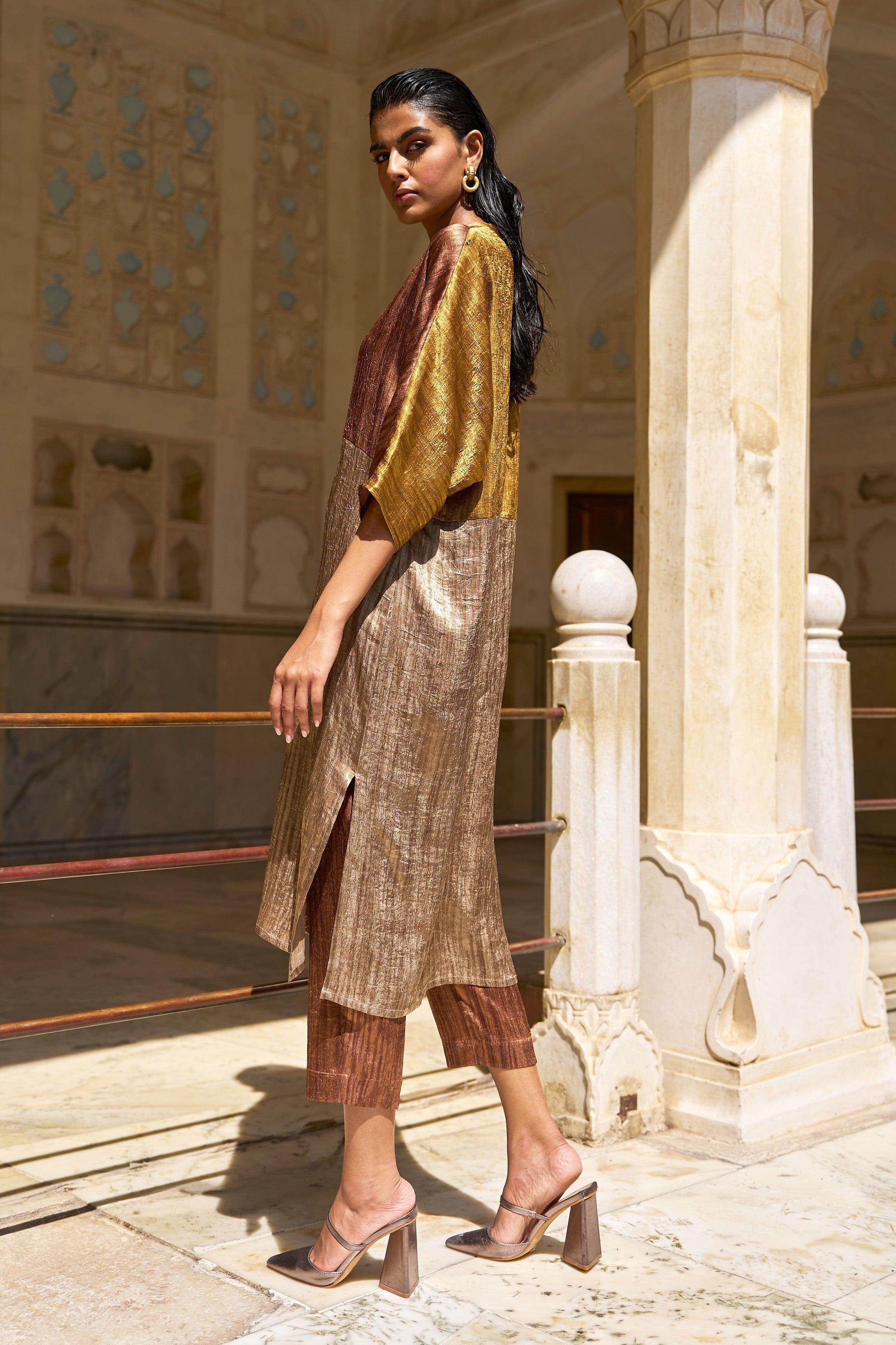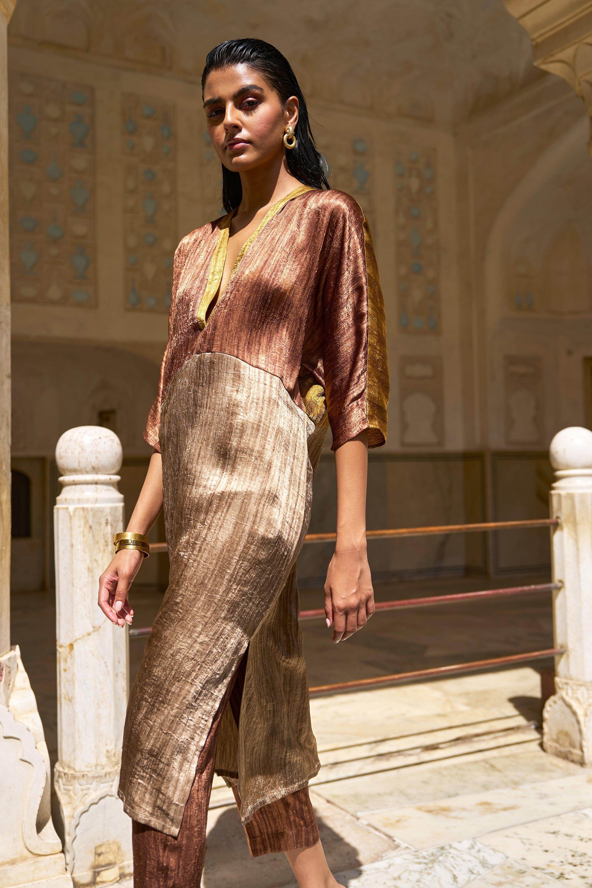 V-neck tunic top in crinkled and textured lamé fabrics in earth tones. Colour blocked in shades of caramel, mustard and coffee. Popover top in a relaxed fit. Half sleeves, side slits.