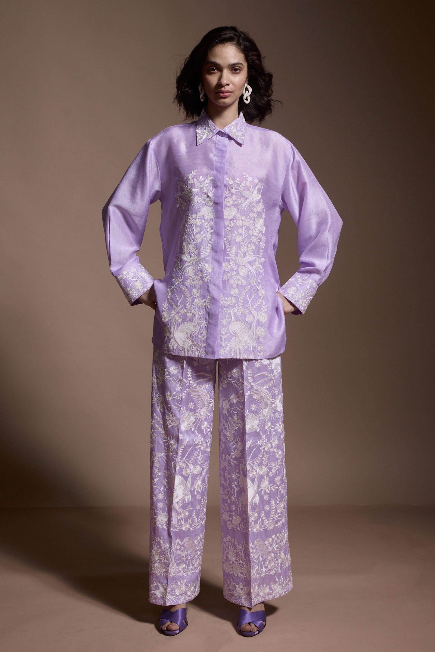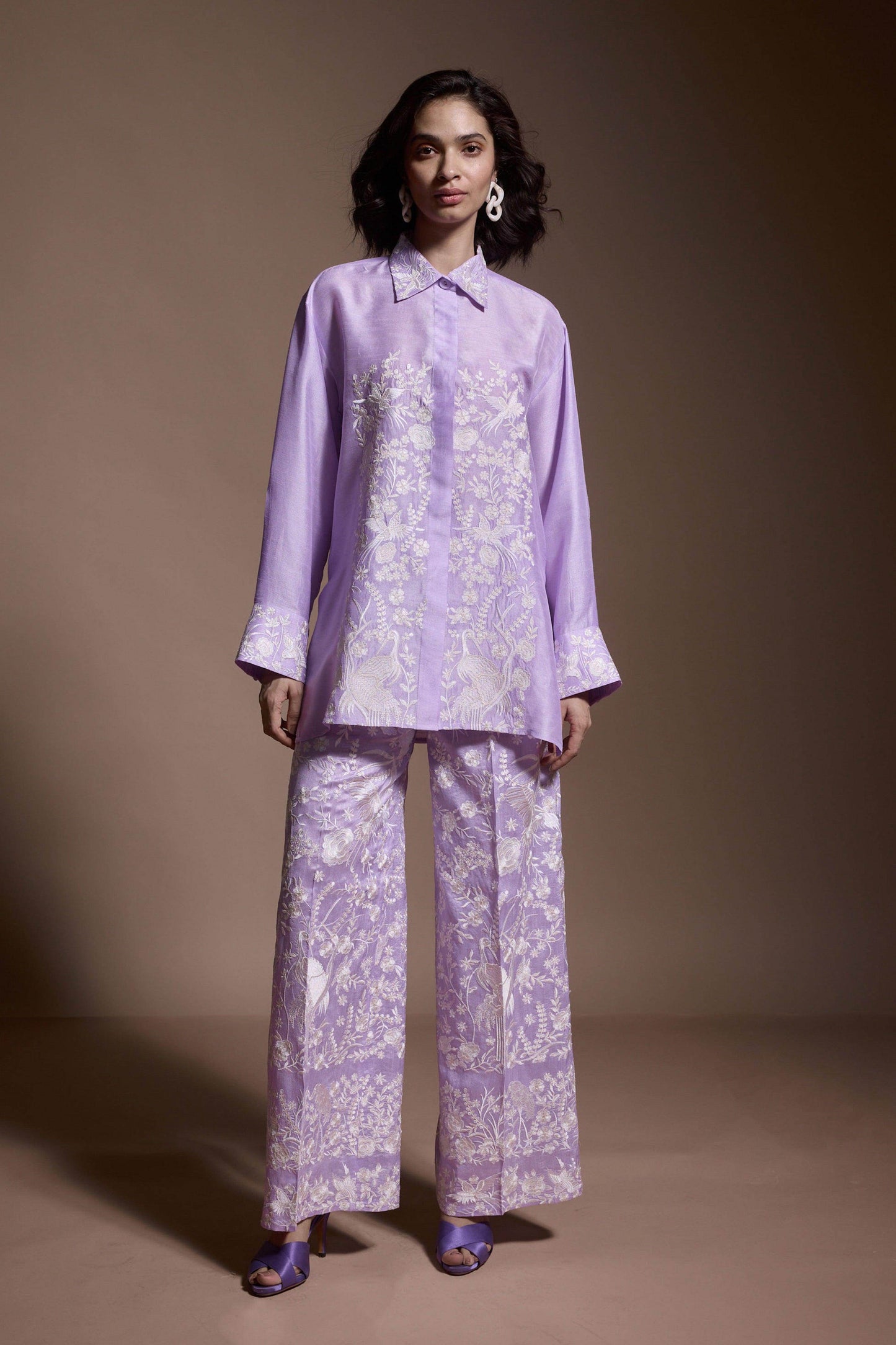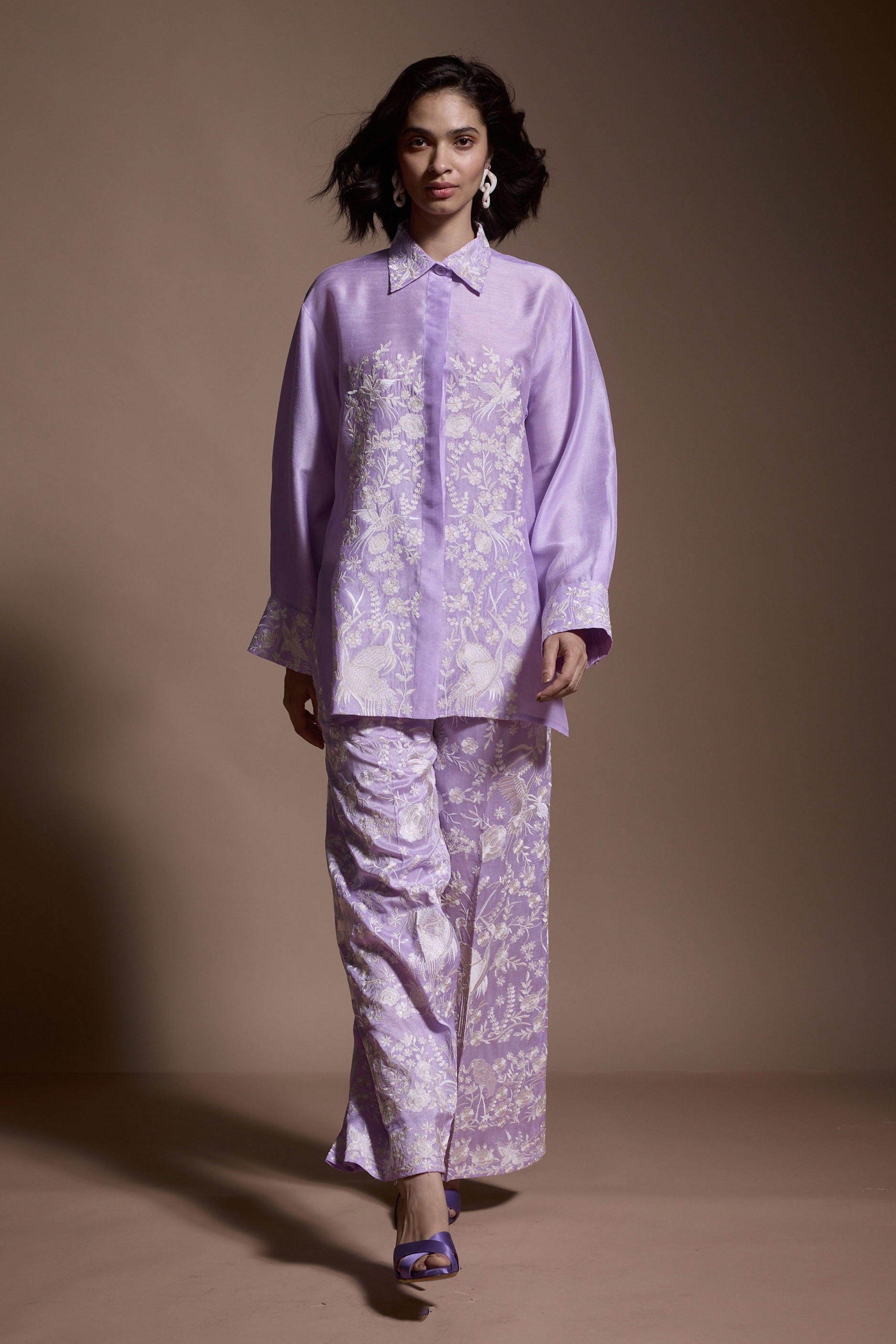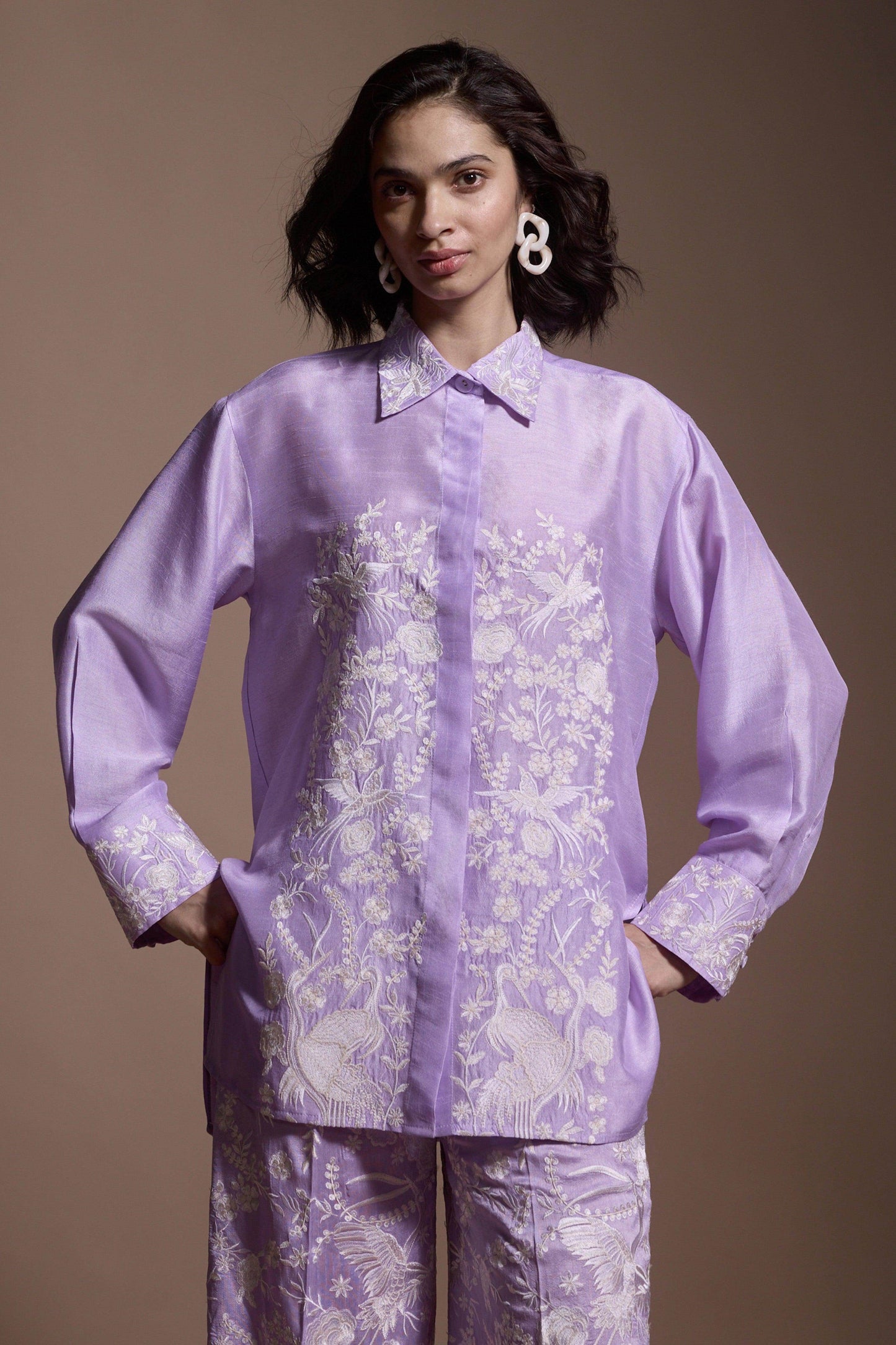 Lavender relaxed fit shirt with contrast gara stitch embroidery on the front, collar, and sleeve cuffs. Concealed button-down placket, full sleeves with broad cuffs, and side slits.