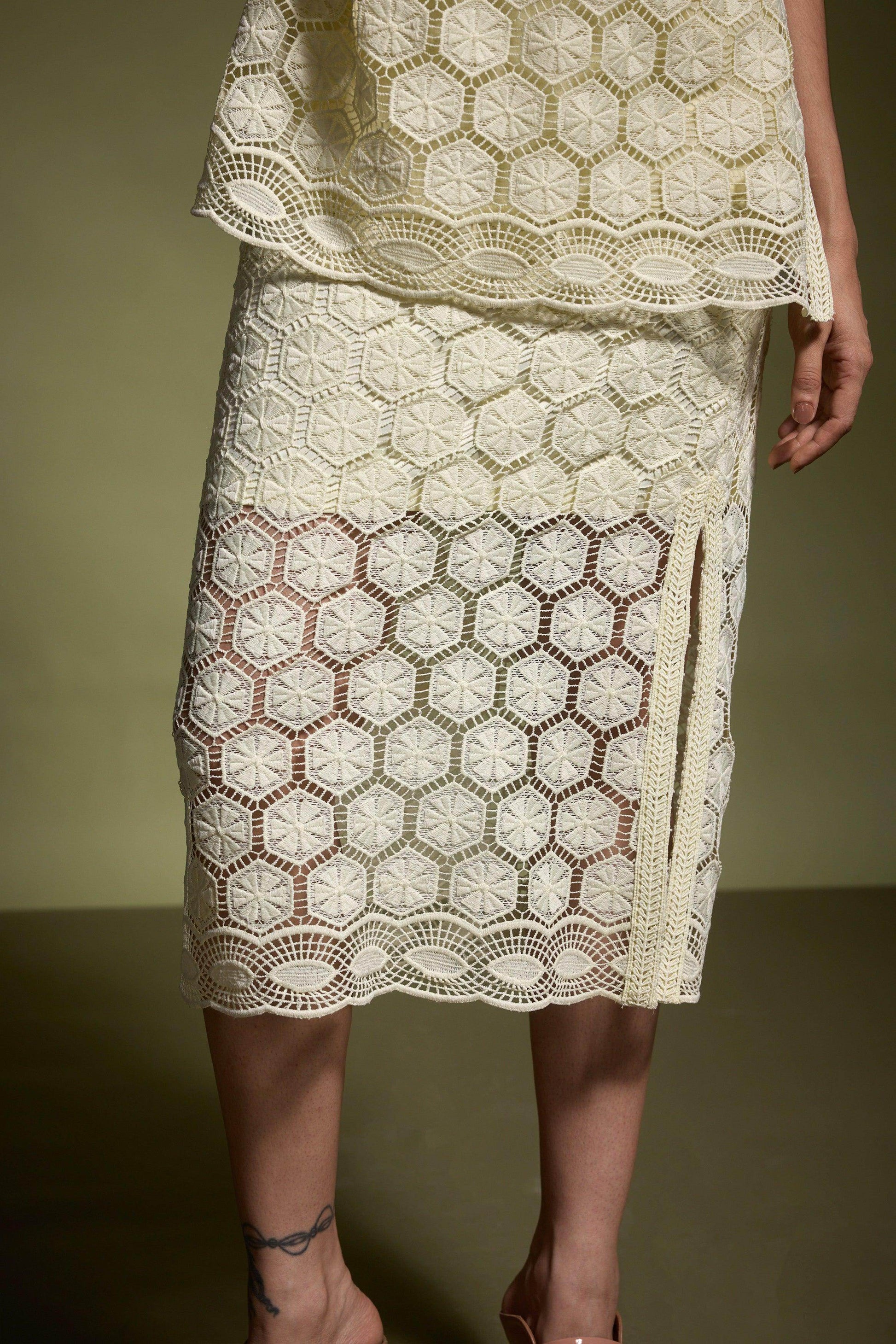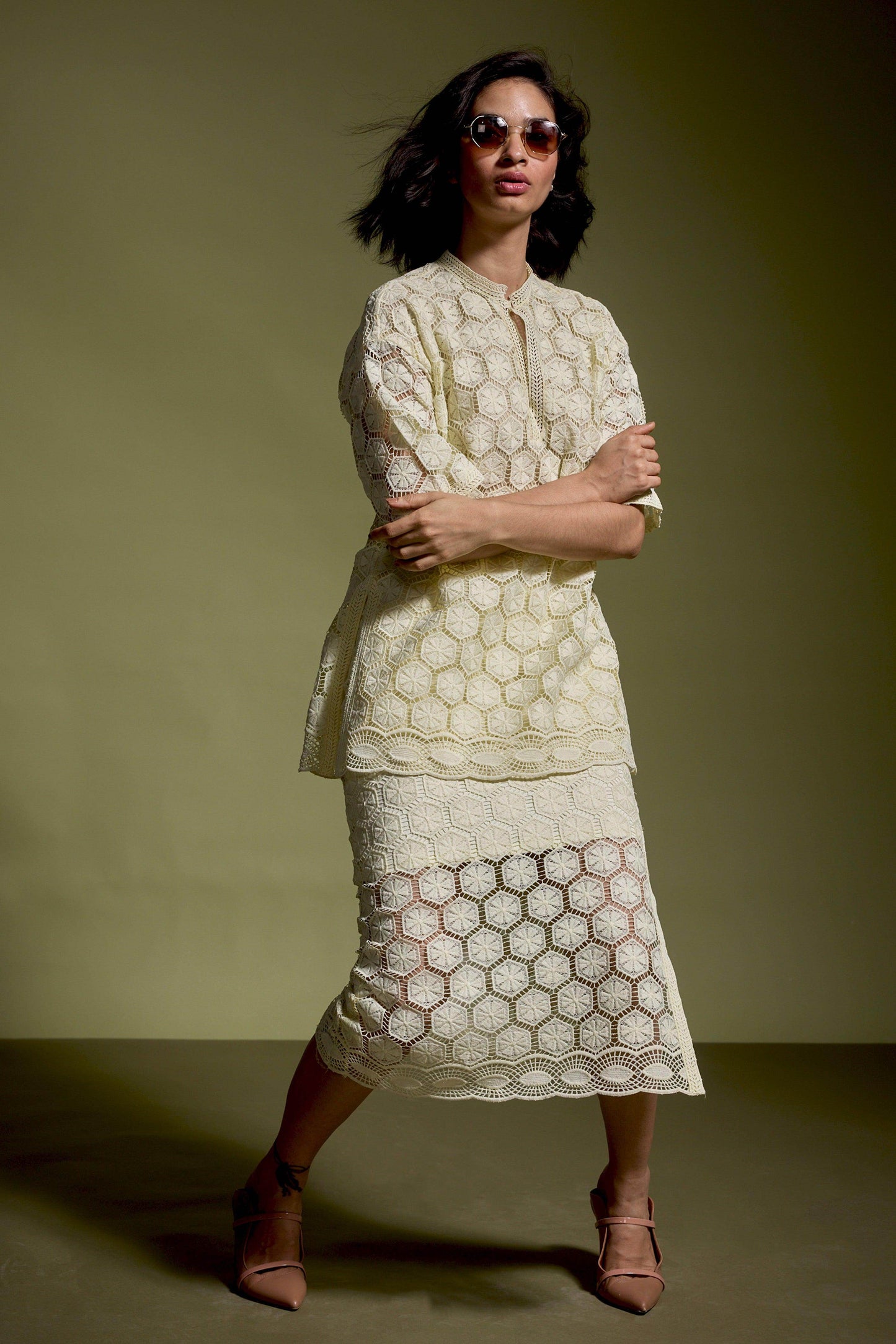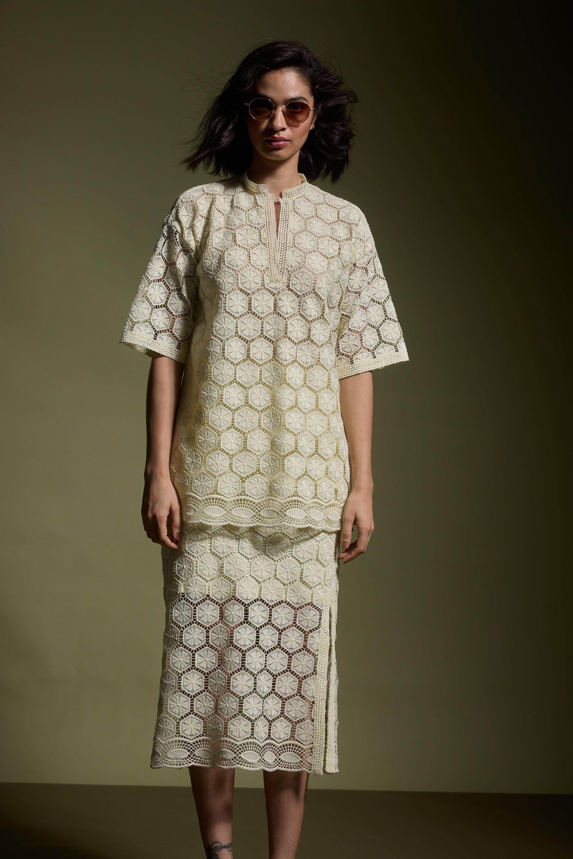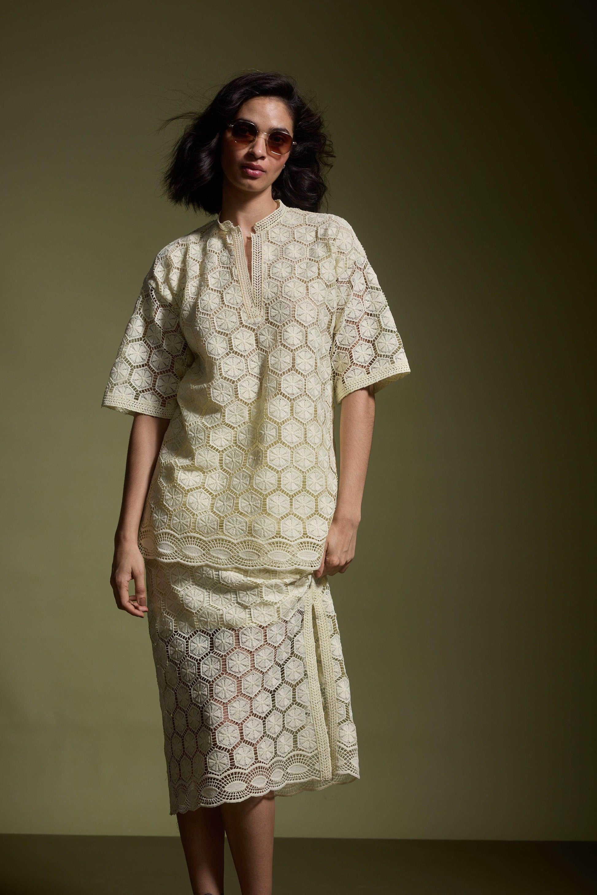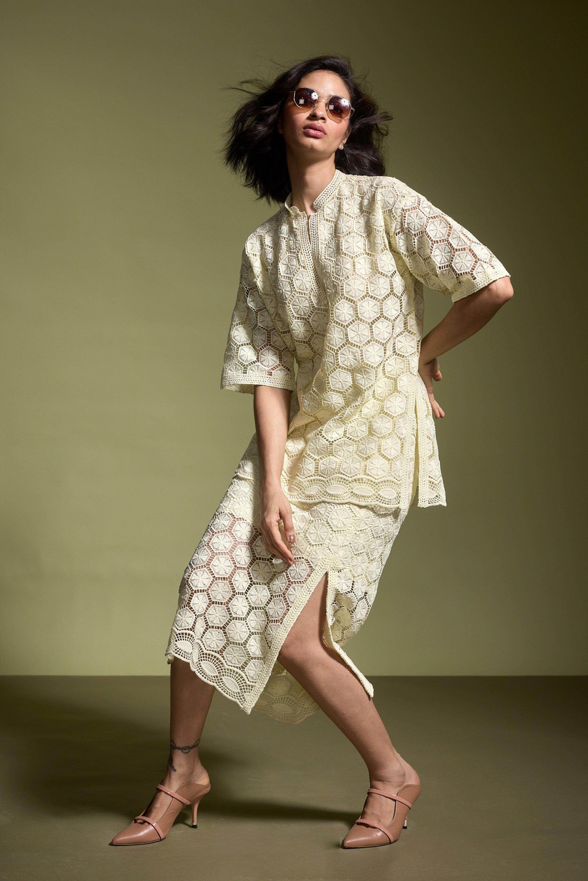 Lemon yellow geometric cutout lace popover top. Relaxed fit with soft lace insert at the V-neckline. Bodice lining, unlined half sleeves, and a band collar. Border lace insert at the hem. Side seam slits with lace detailing. Paired with Lemon yellow geometric cutout lace midi skirt. Relaxed cut with soft lace insert at the elasticated waist. Lined till the knee. Border lace insert at the hem. Side seam slits with lace detailing. Zip and loop button closure on the side.