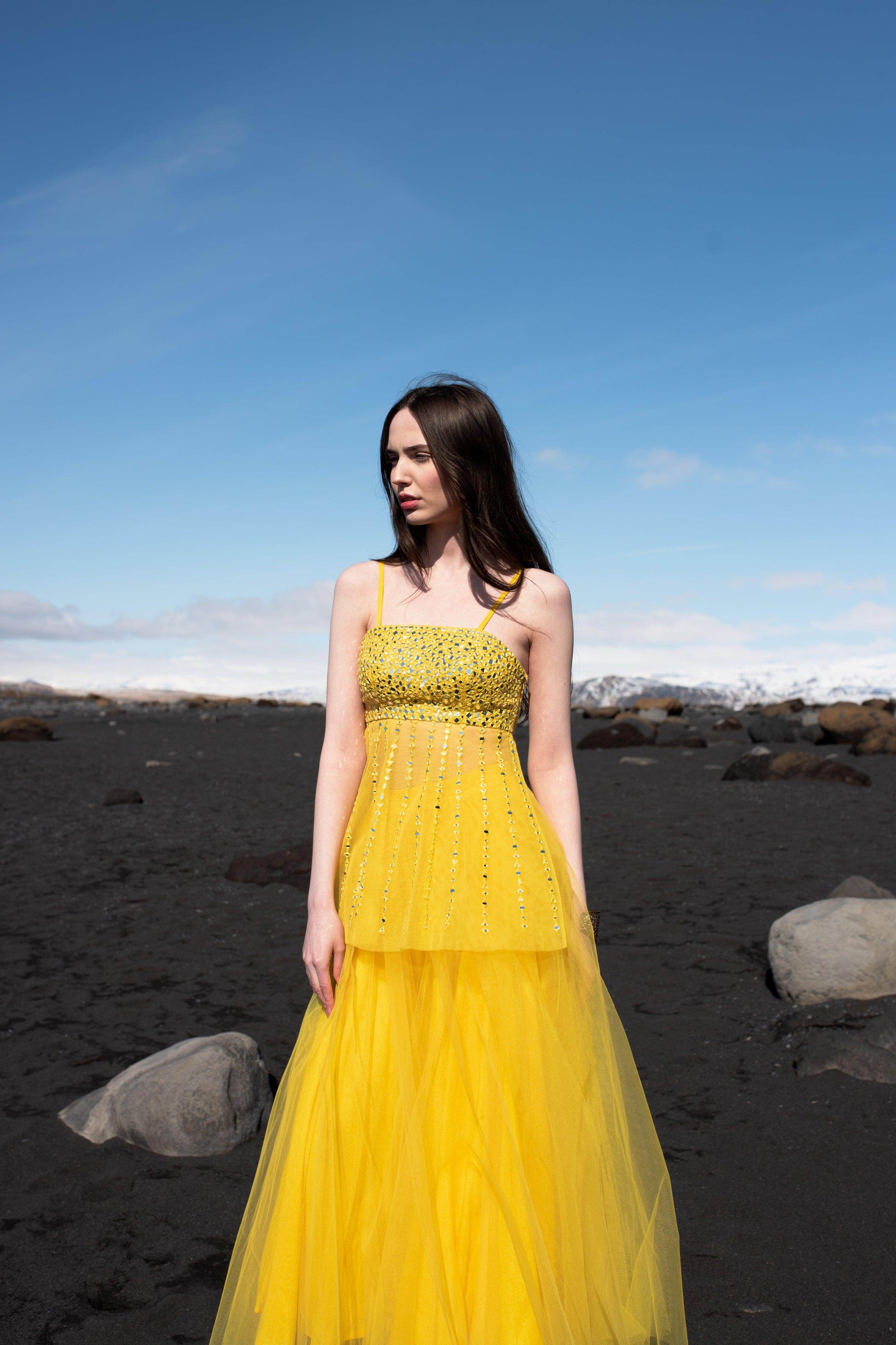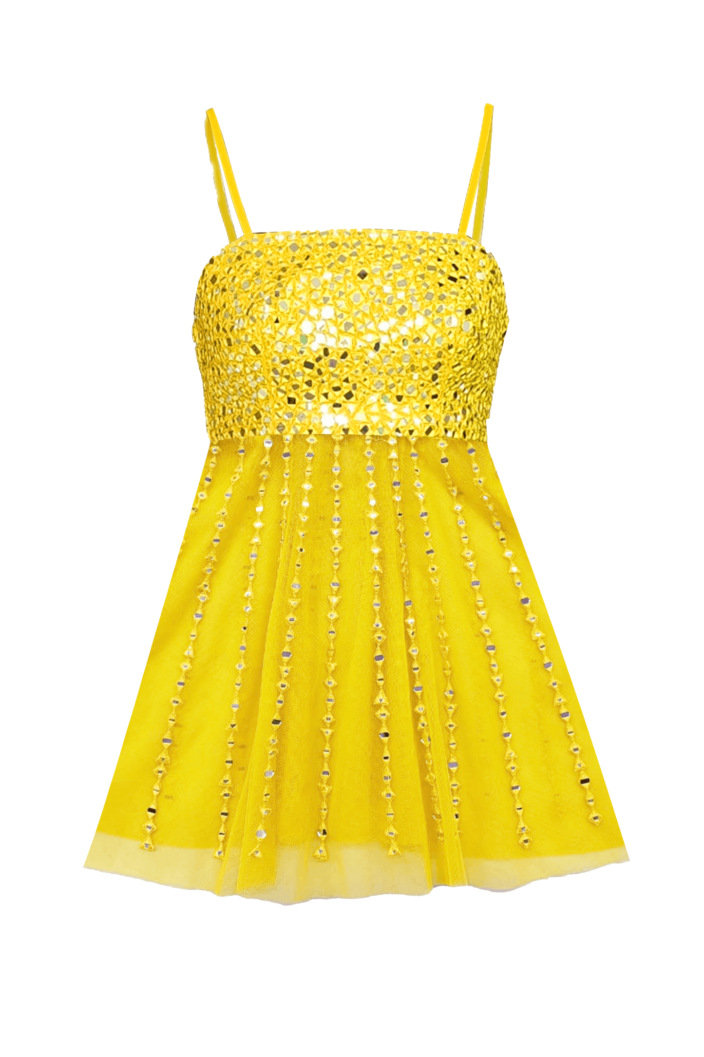 Sunflower yellow peplum-style top in ethereal tulle fabric. Adorned with intricate hand and machine-embroidered mirrors in various shapes and sizes at the bandeau. Mirror-embroidered lines flowing from the bandeau top to the peplum hem, inspired by rays of the sun. Zip closure on the bandeau on the wearer's left, complemented by alluring high slits on the peplum sides. Adjustable shoulder straps for a customized fit. The bandeau of the top is fully lined. Hand-cut raw hems.