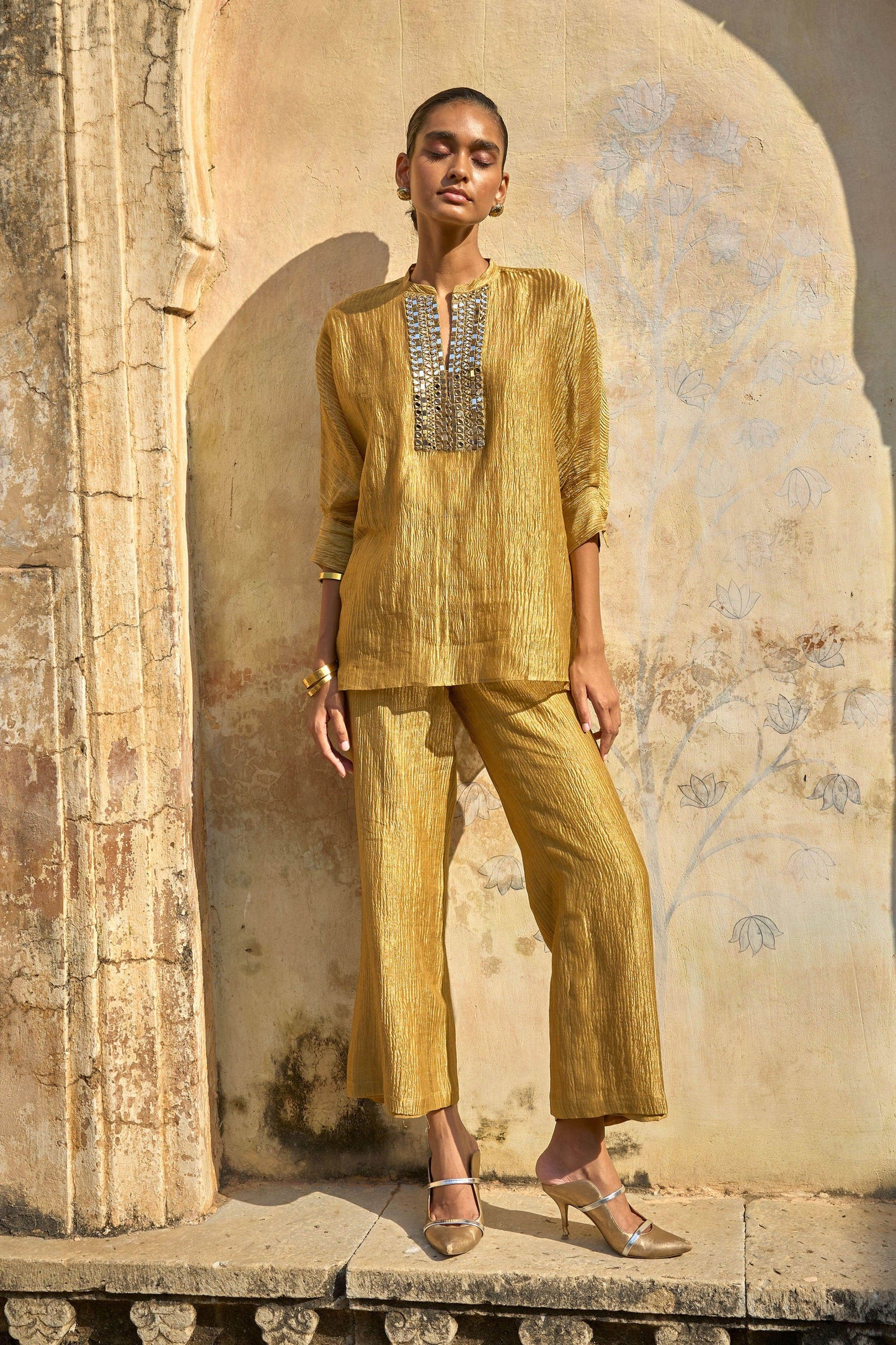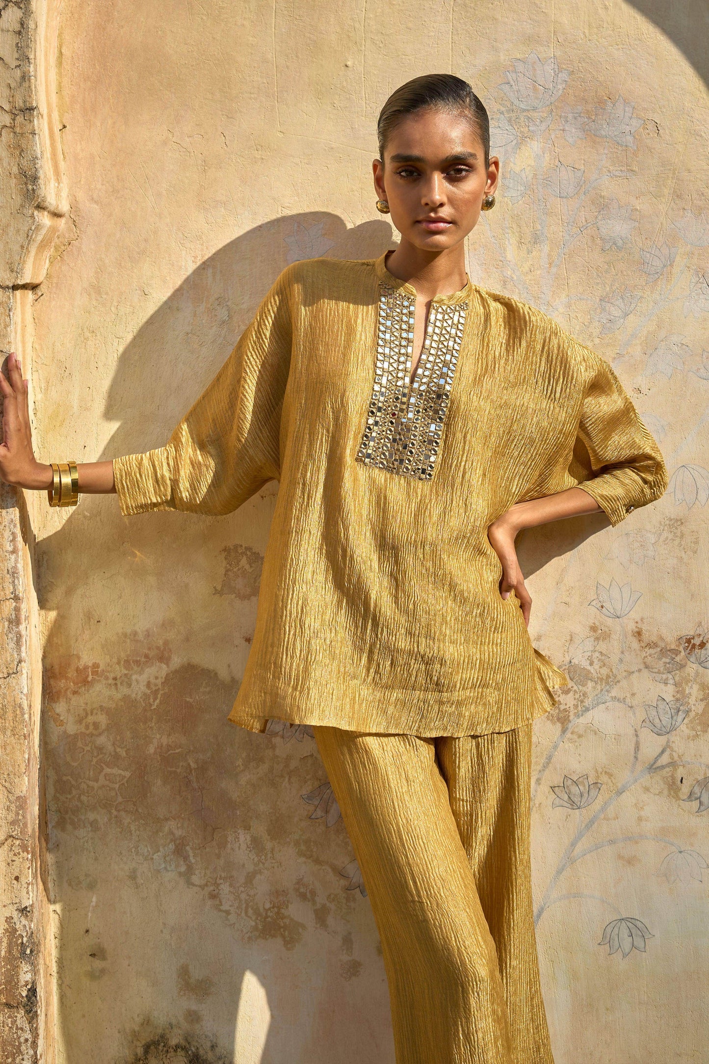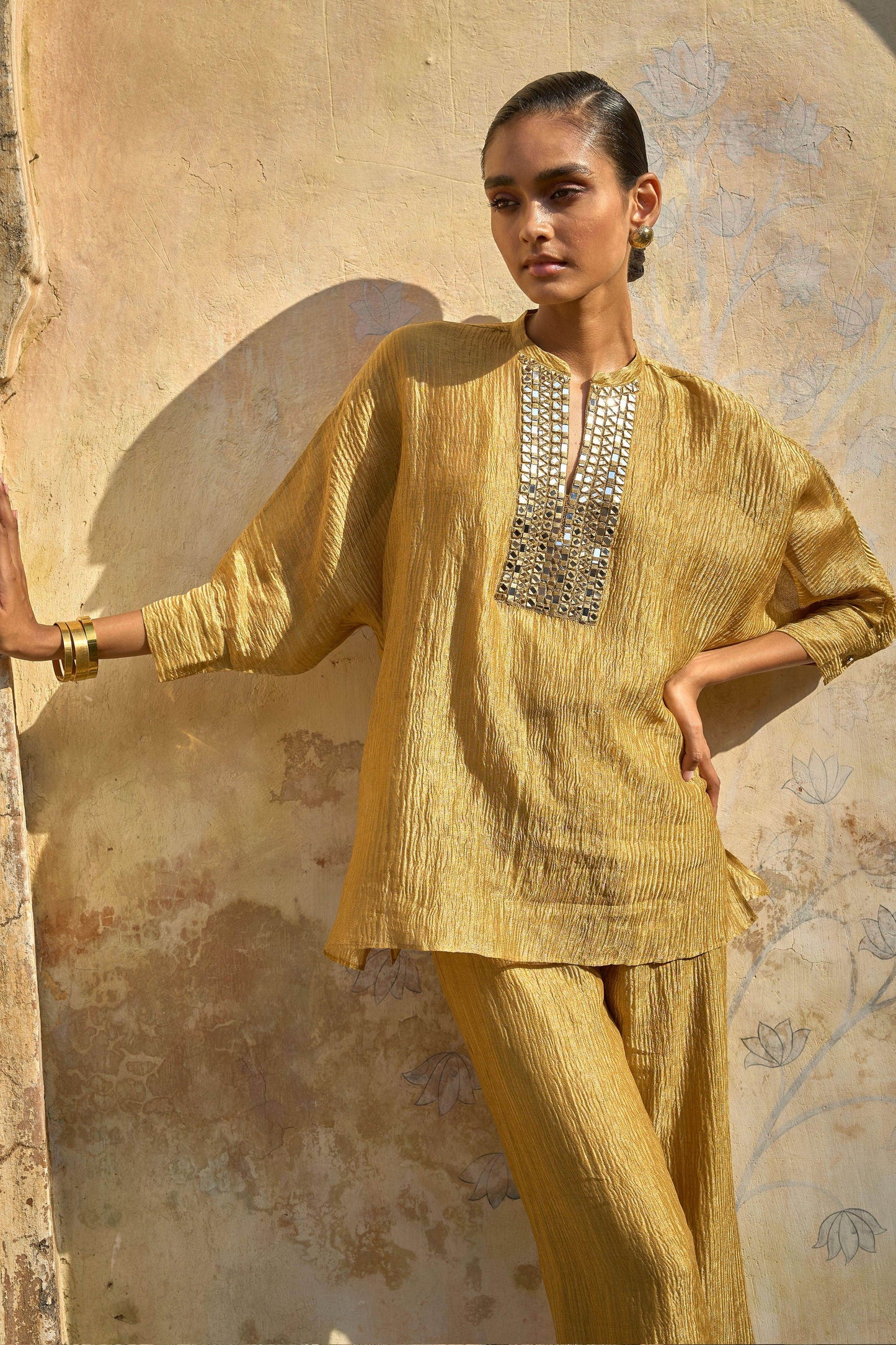 Relaxed fit popover top in soft crinkled gold tissue. Placed mirror work embroidery hand applied on the front neck. Dolman, crop sleeves. Round neck. Comes with a slip.