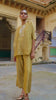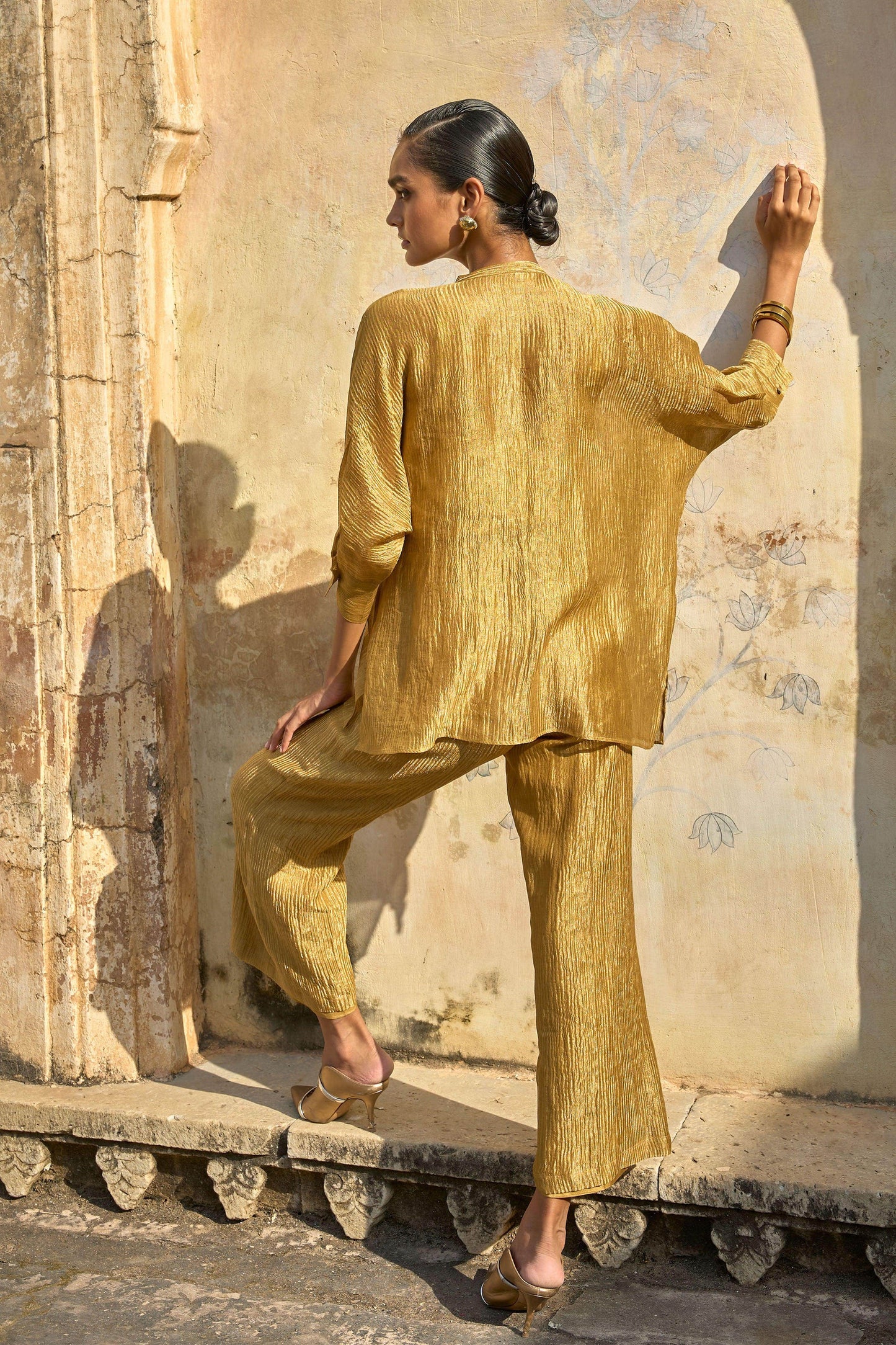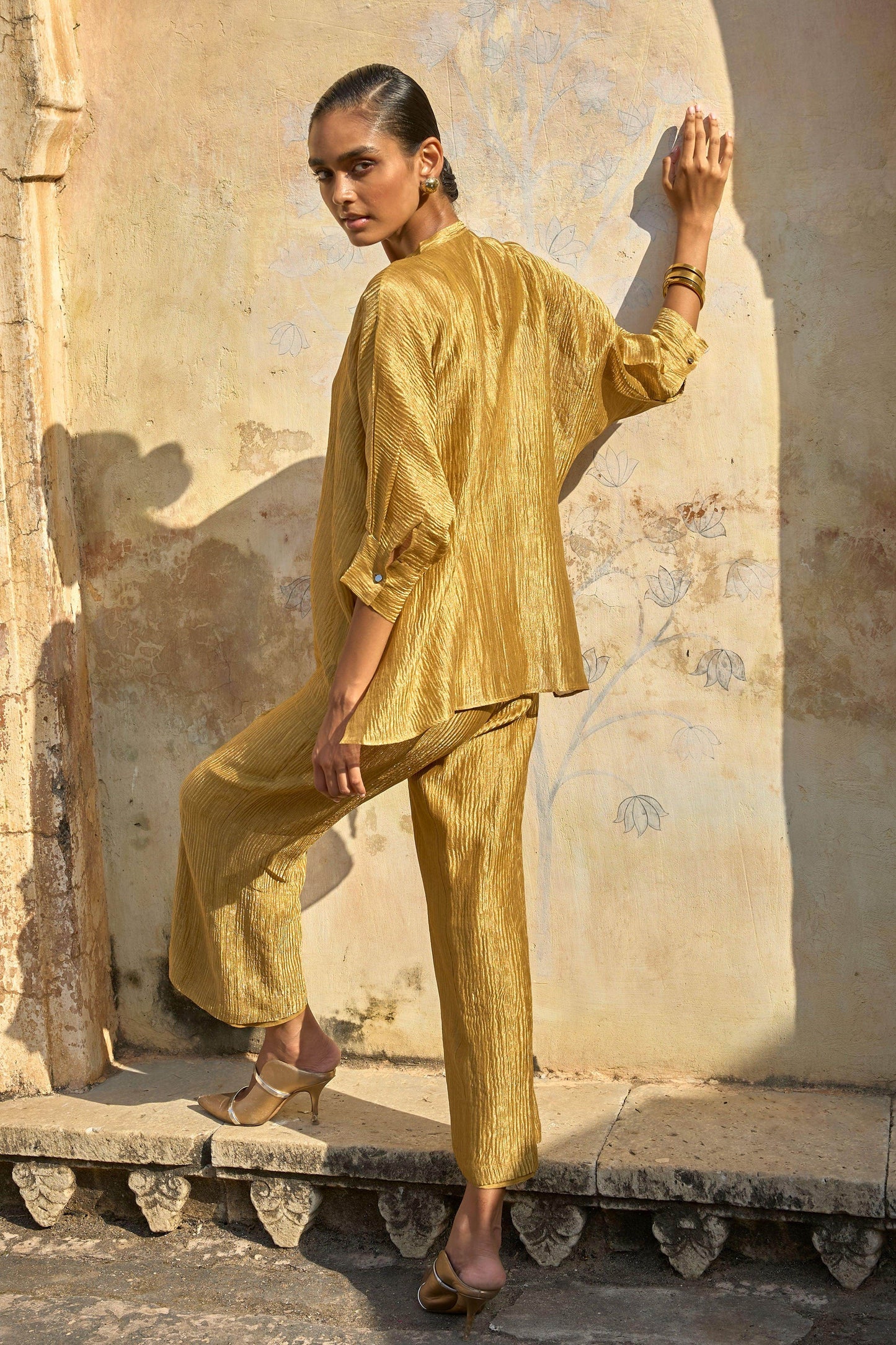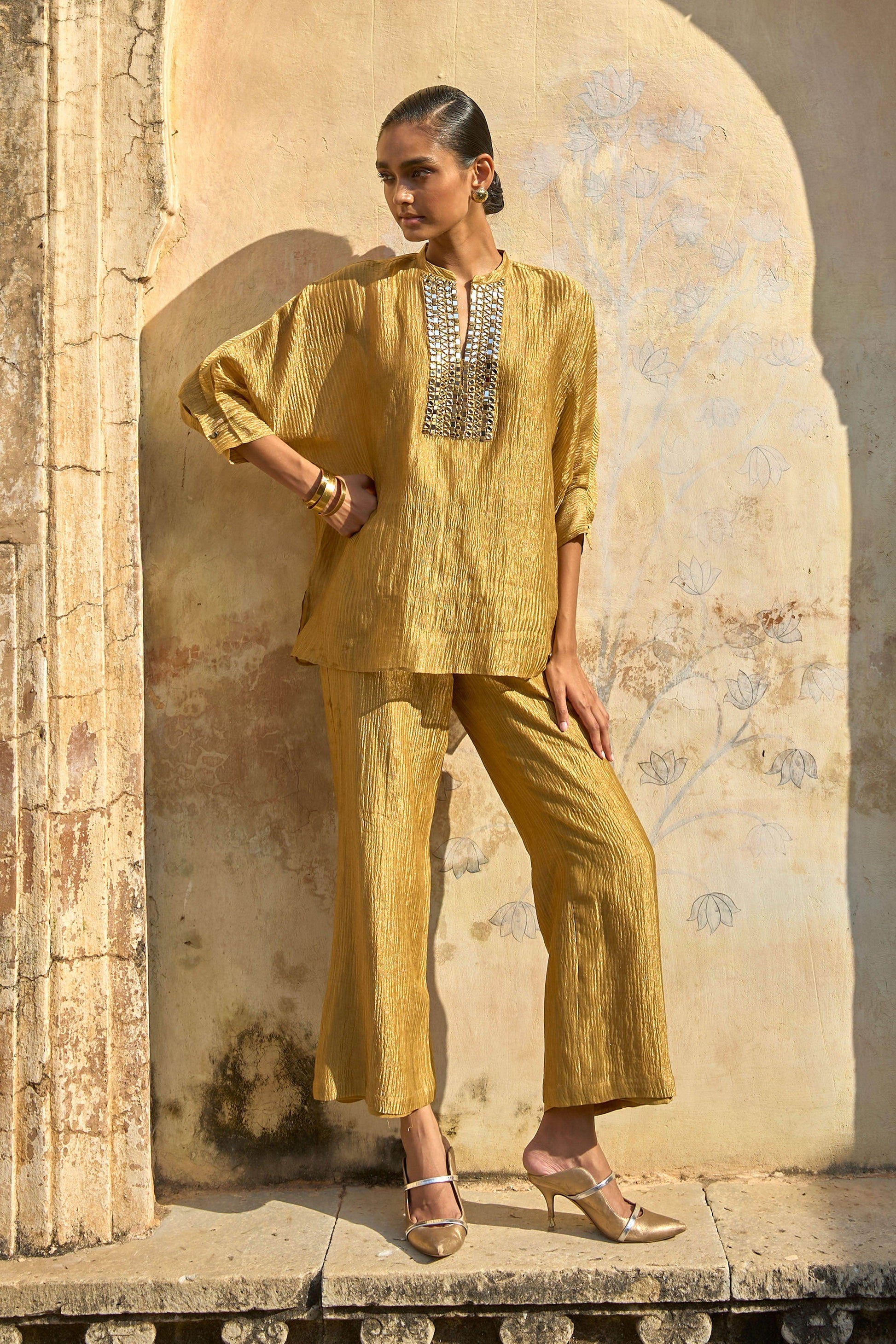Relaxed fit popover top in soft crinkled gold tissue. Placed mirror work embroidery hand applied on the front neck. Dolman, crop sleeves. Round neck. Comes with a slip.