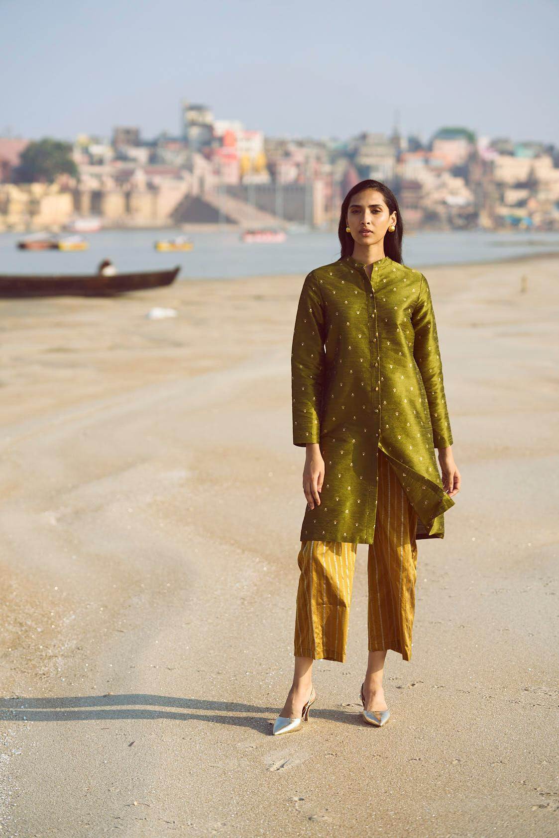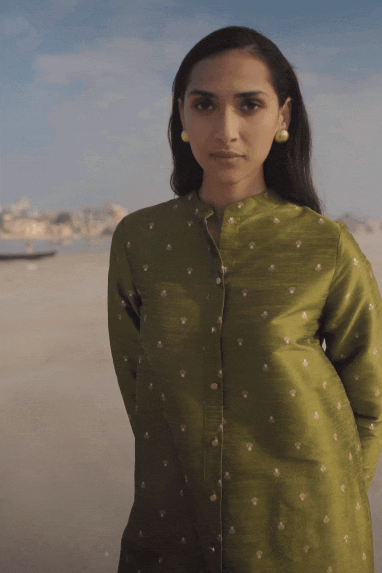 Olive green straight fit logline top. Matka inspired textured slub fabric with allover Benares inspired gold lurex brocade motif. Band collar, long sleeves. Gold Metallic button closure at the front.