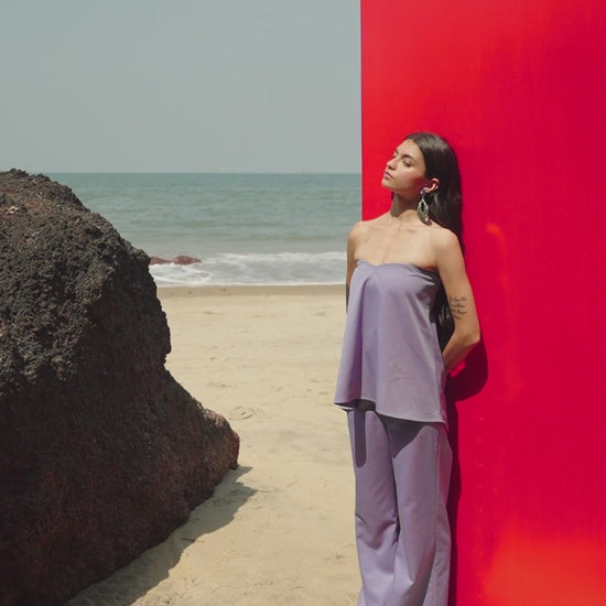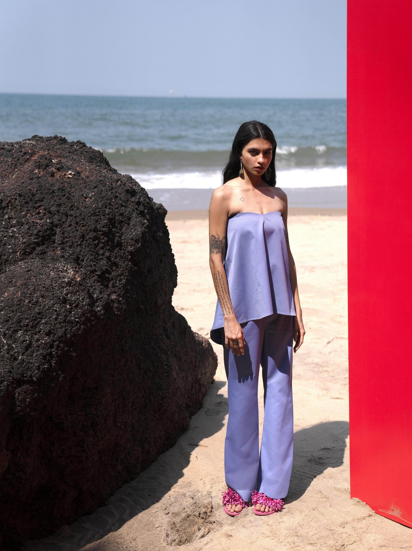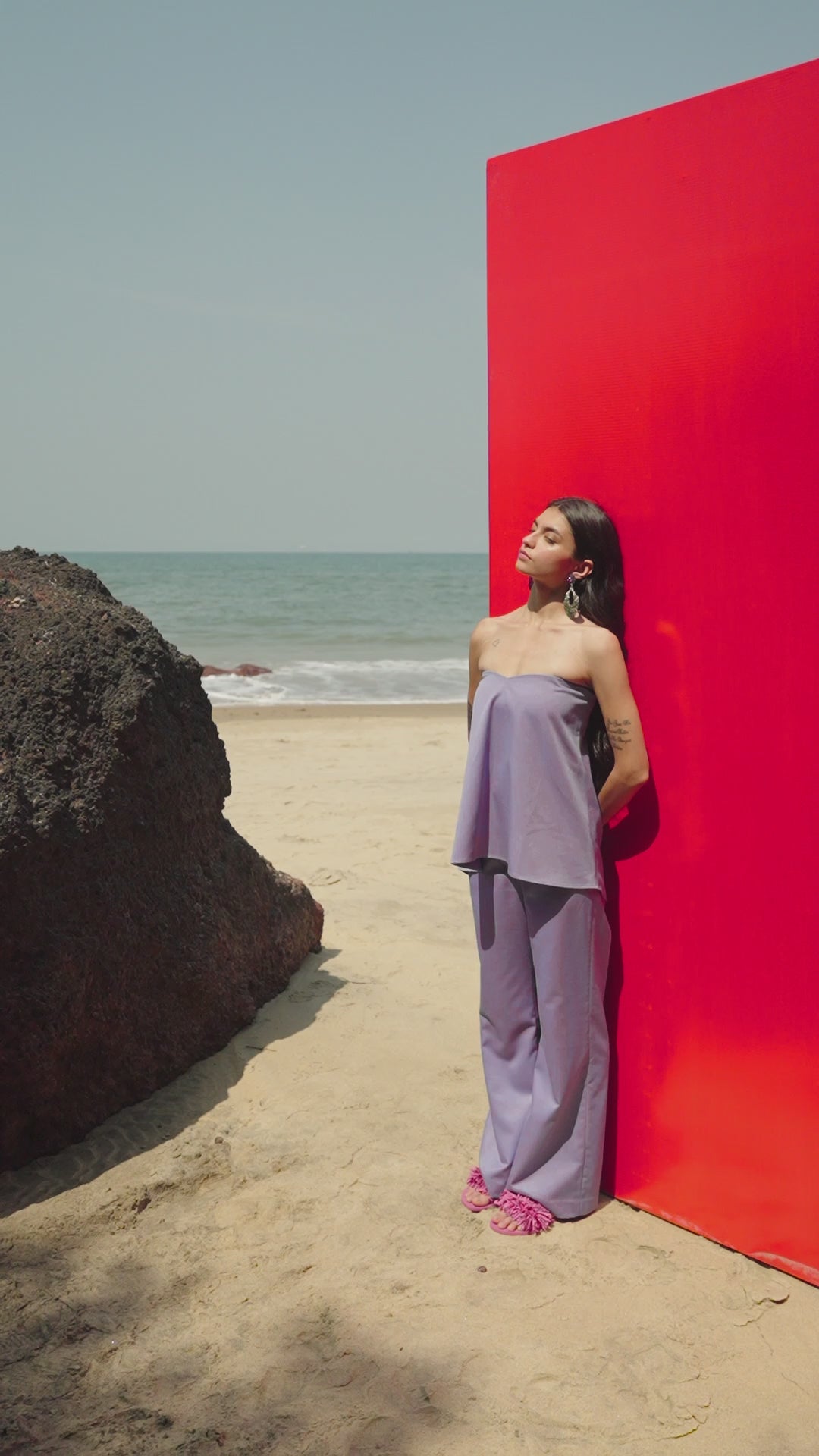 Lavender off-shoulder top and straight pant set. The top has a soft sweetheart neckline and a high-low front and back hem. Zip and hook closure in the back. Comes with detachable and adjustable straps. Paired with matching straight leg pants, semi-elasticated at the waist. Hook and zip closure at the front and pockets at the sides. Made of all weather suiting material.