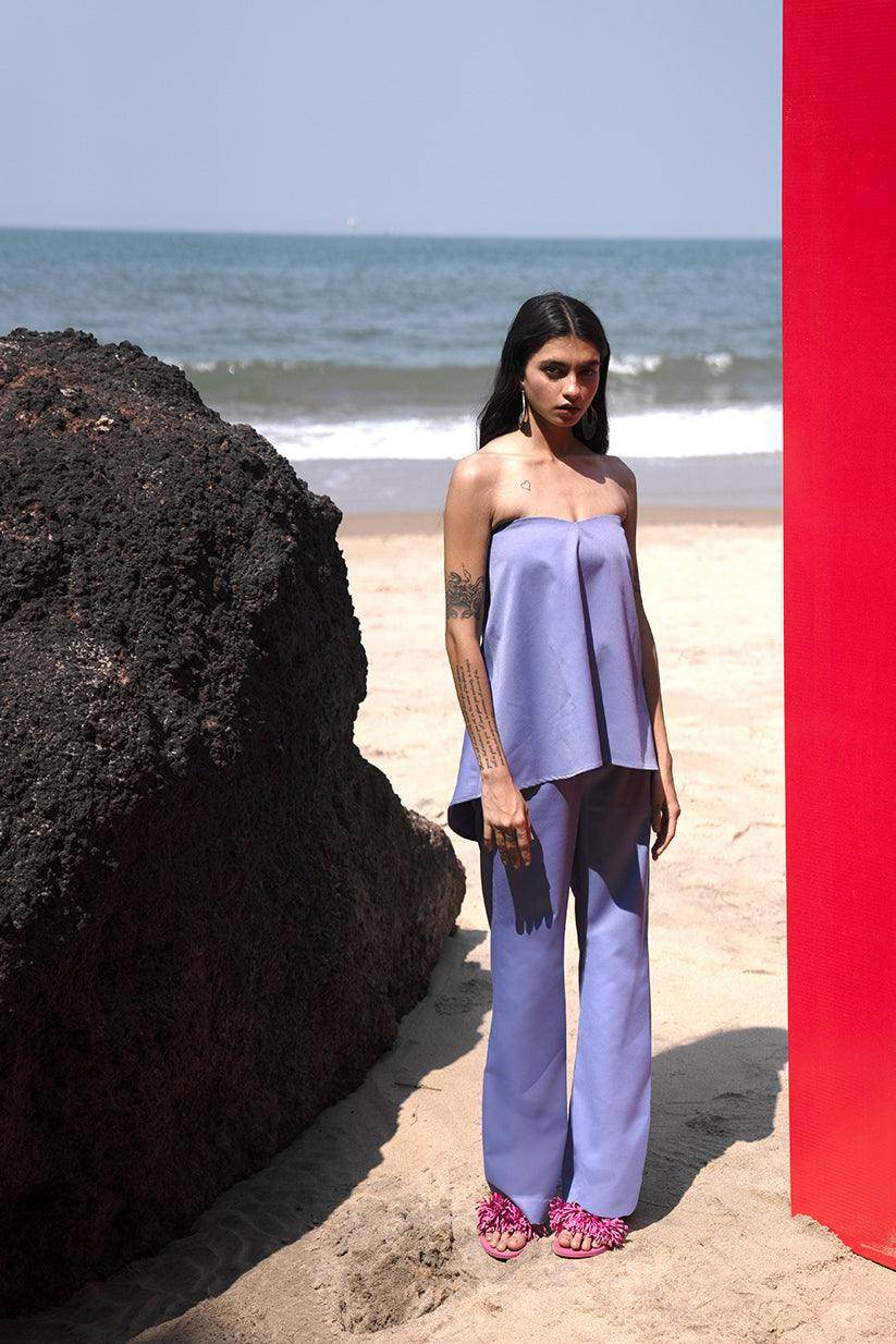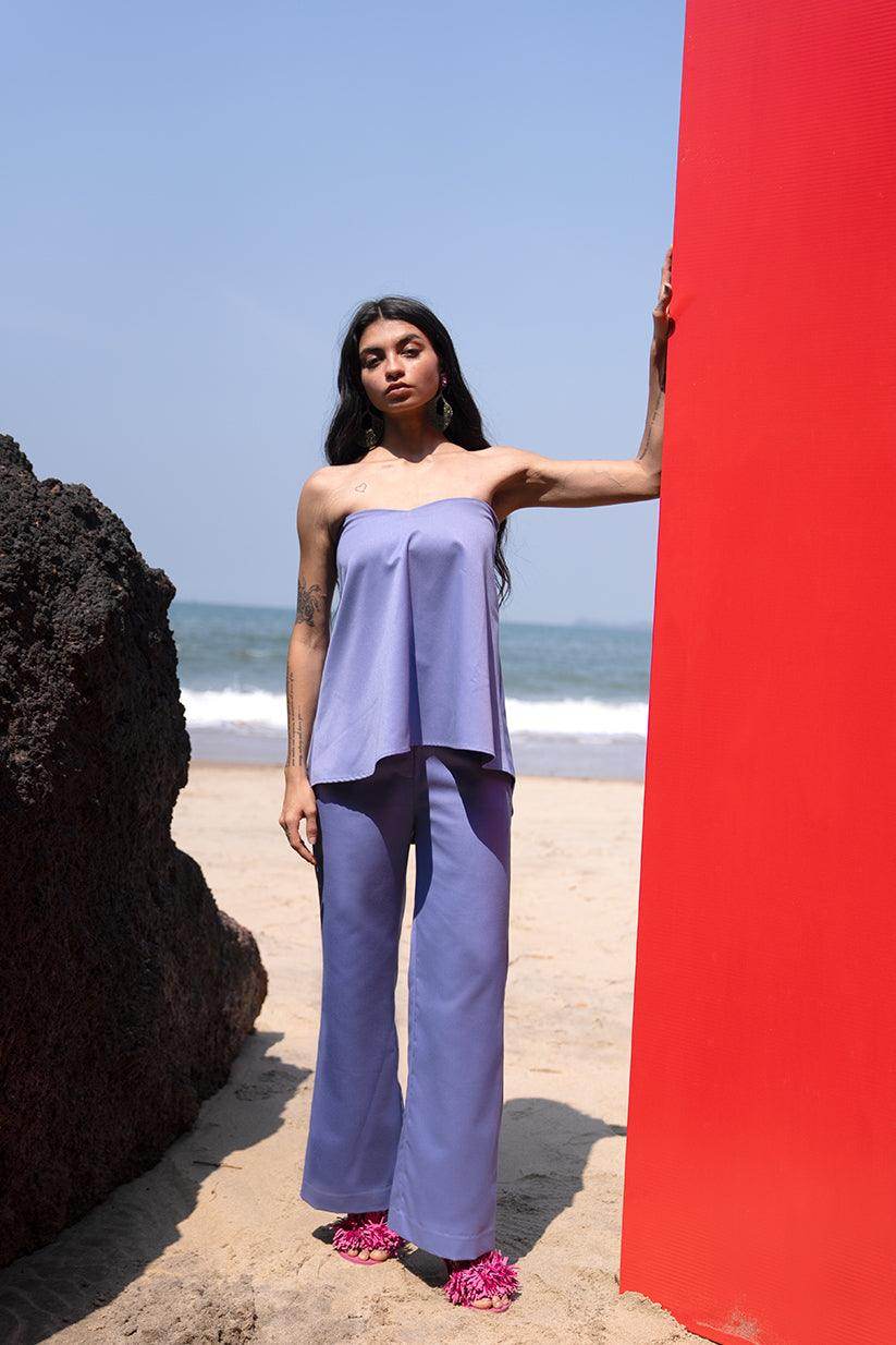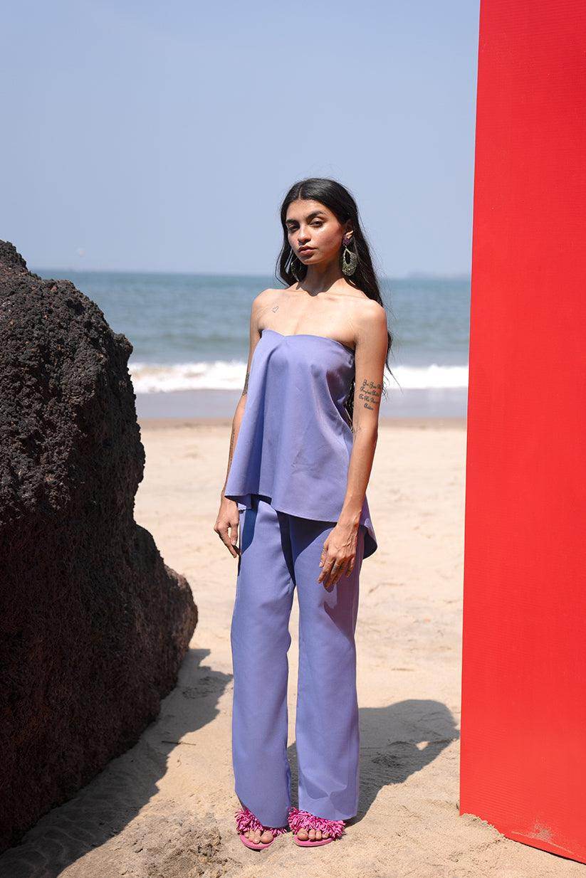 Lavender off-shoulder top and straight pant set. The top has a soft sweetheart neckline and a high-low front and back hem. Zip and hook closure in the back. Comes with detachable and adjustable straps. Paired with matching straight leg pants, semi-elasticated at the waist. Hook and zip closure at the front and pockets at the sides. Made of all weather suiting material.