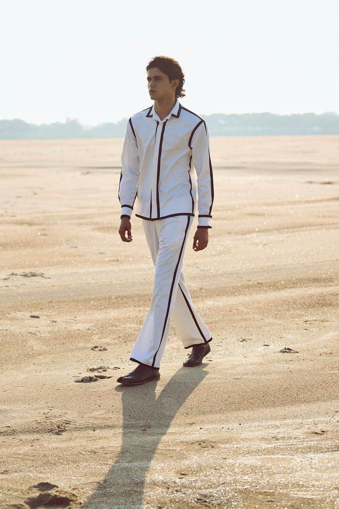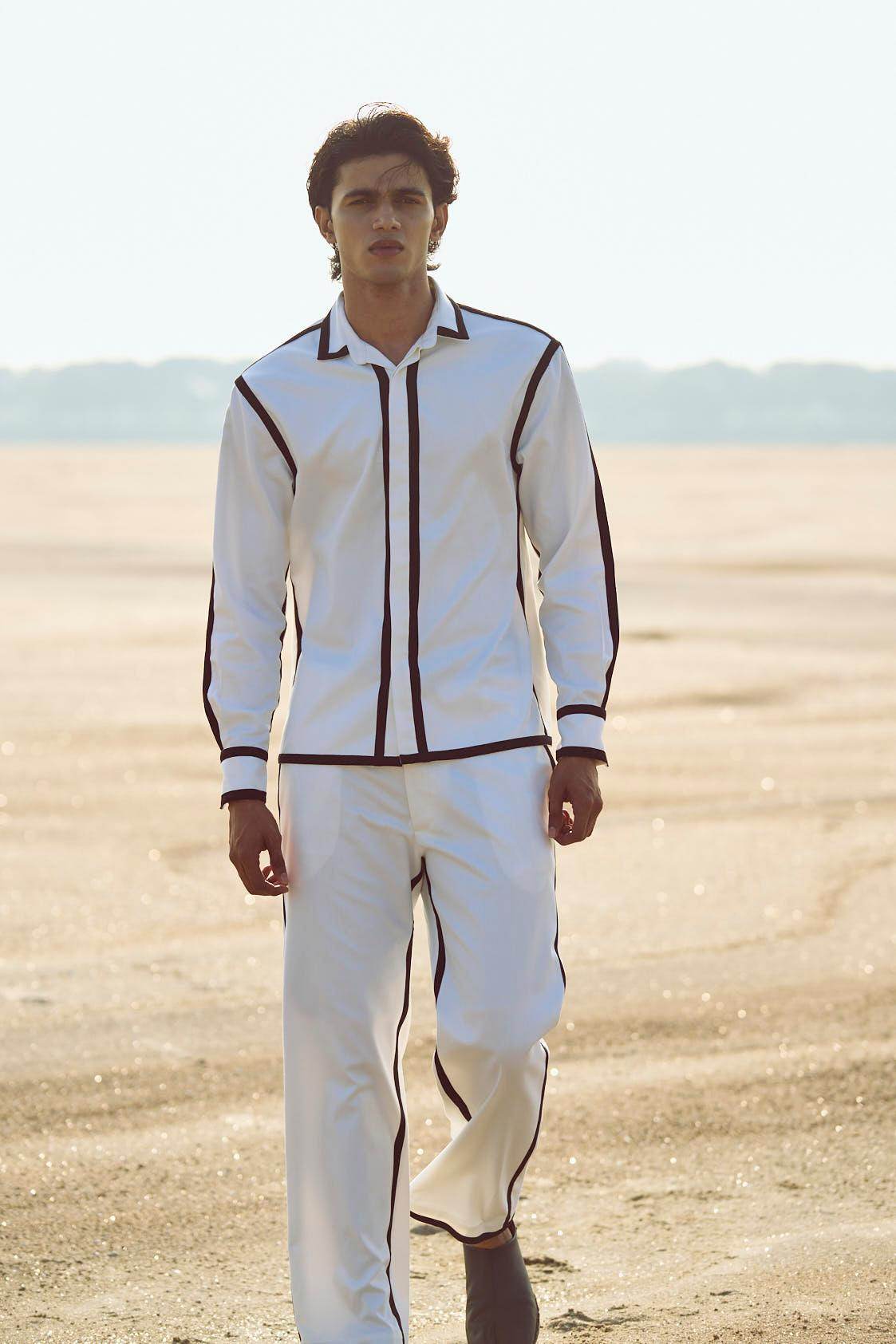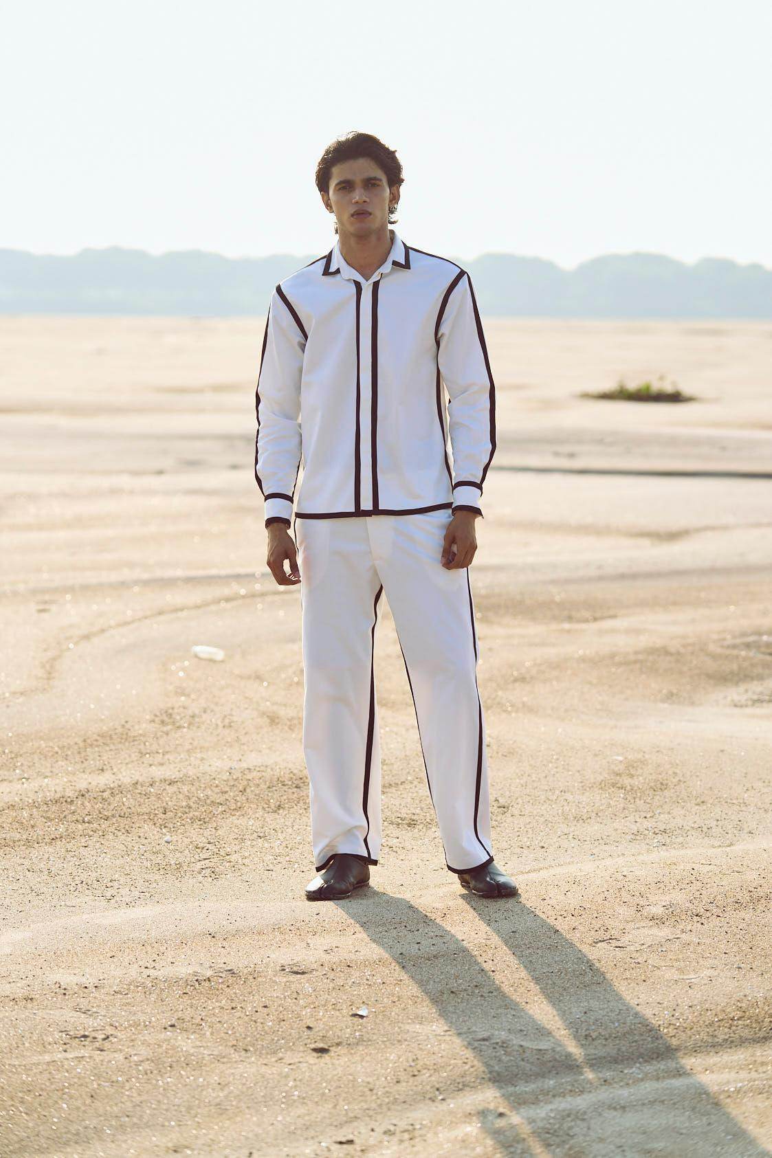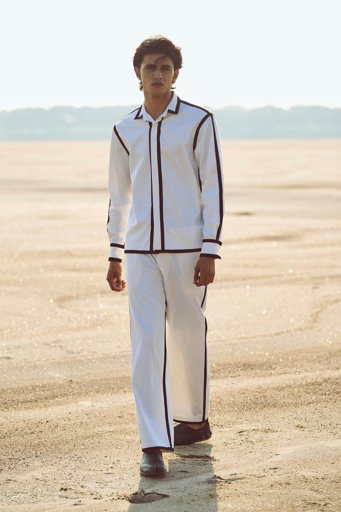 White regular fit shirt in all weather suting material. Contrast black stripes outlining the front, back,shoulder, sleeves and collar of the shirt. Concealed placket. Full sleeves.