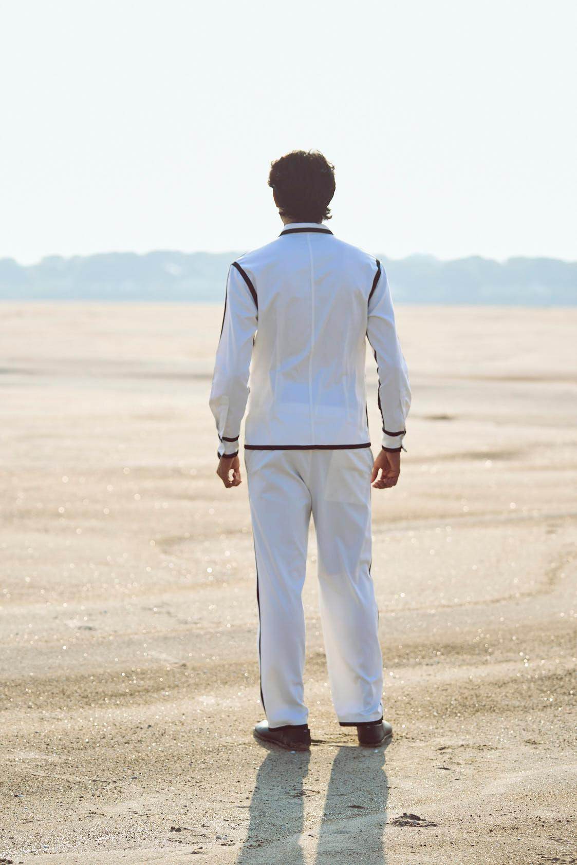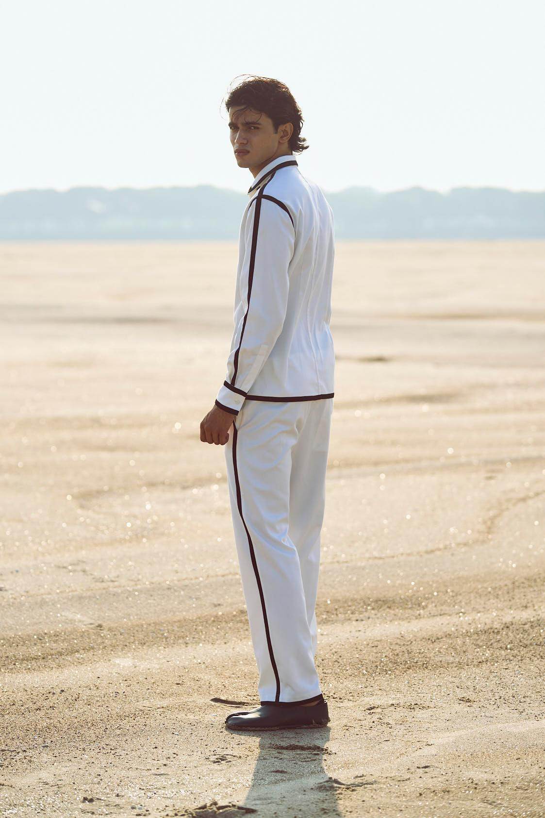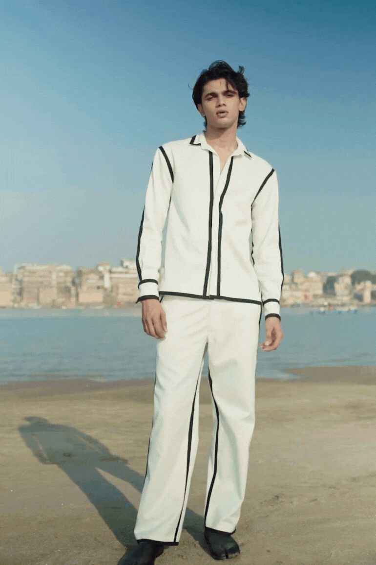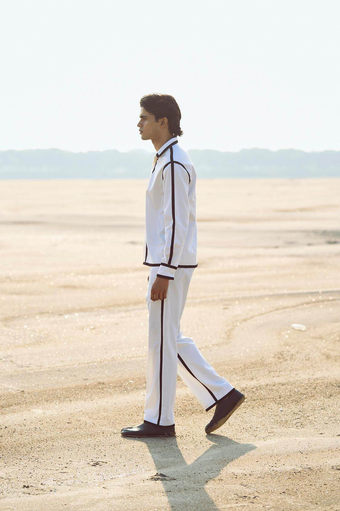 White regular fit shirt in all weather suting material. Contrast black stripes outlining the front, back,shoulder, sleeves and collar of the shirt. Concealed placket. Full sleeves.