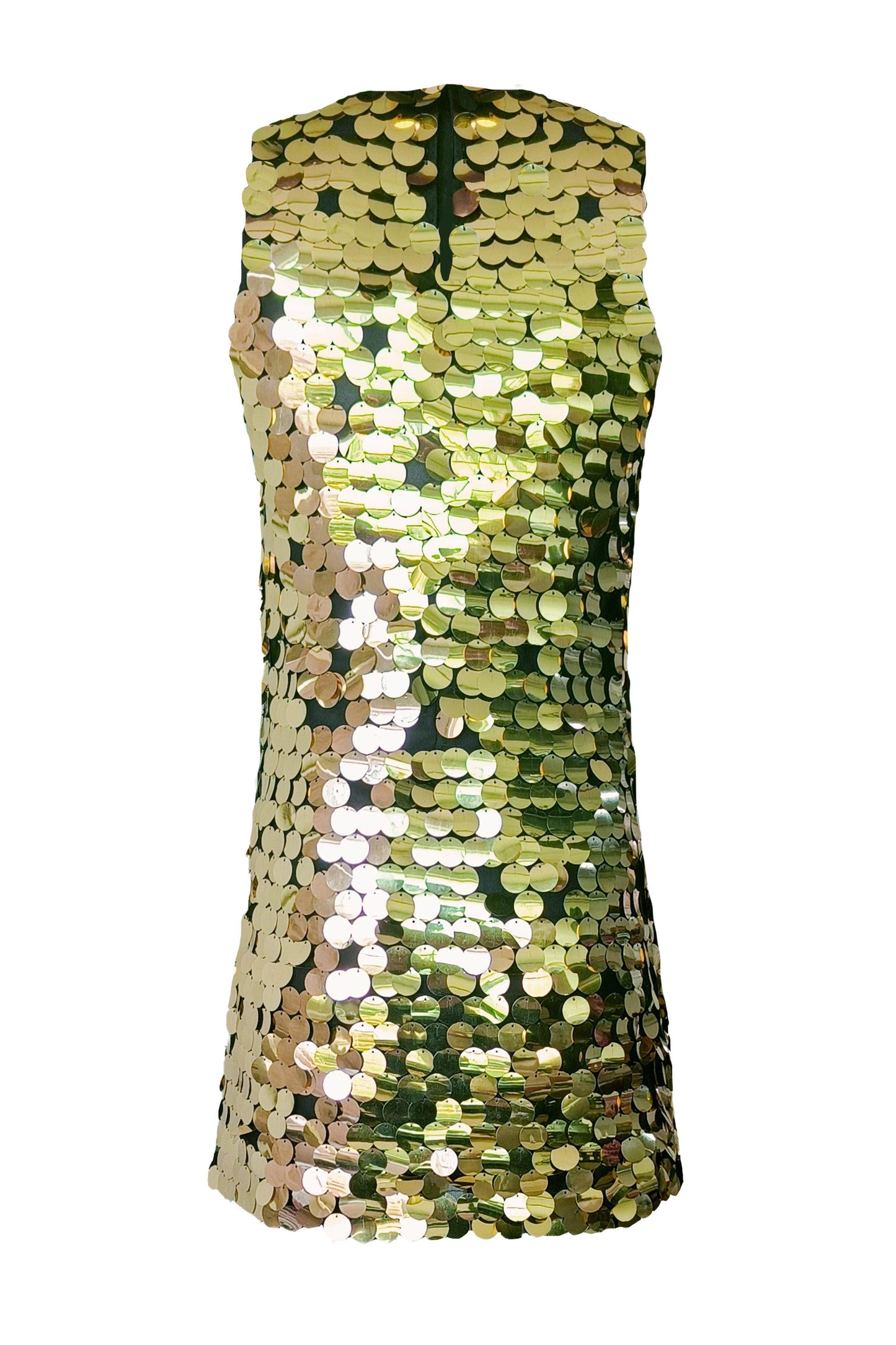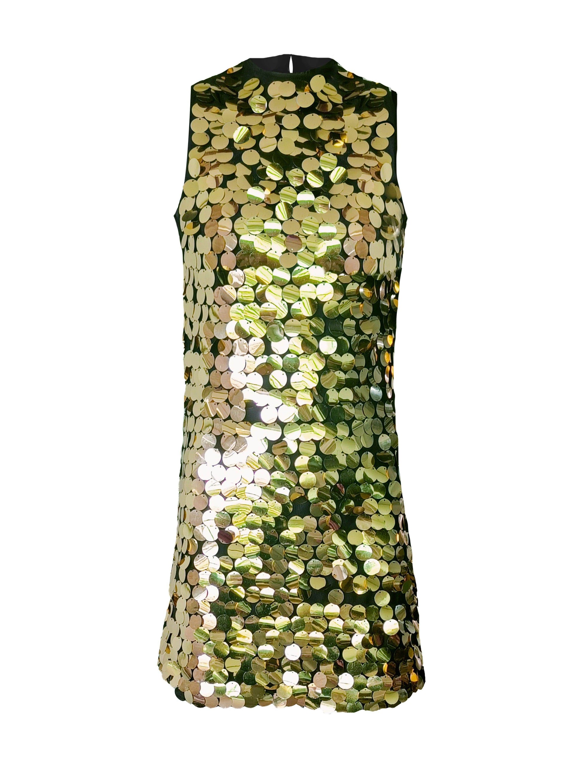 Gold paillette sleeveless mini dress with a high neck detail. Keyhole with button closure at the back. The garment is fully lined. Paired with gold paillette leg warmers with stretch knitted base.