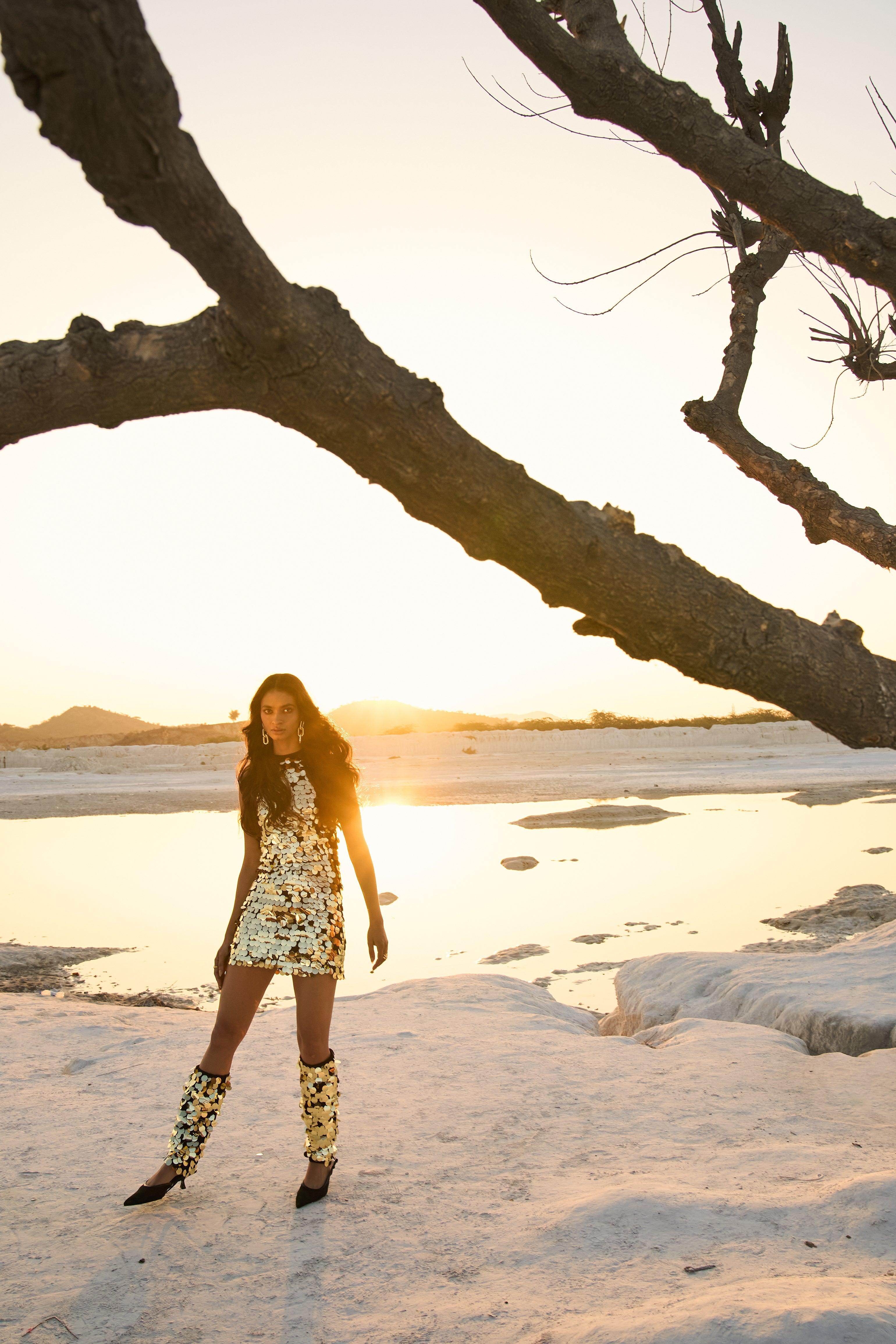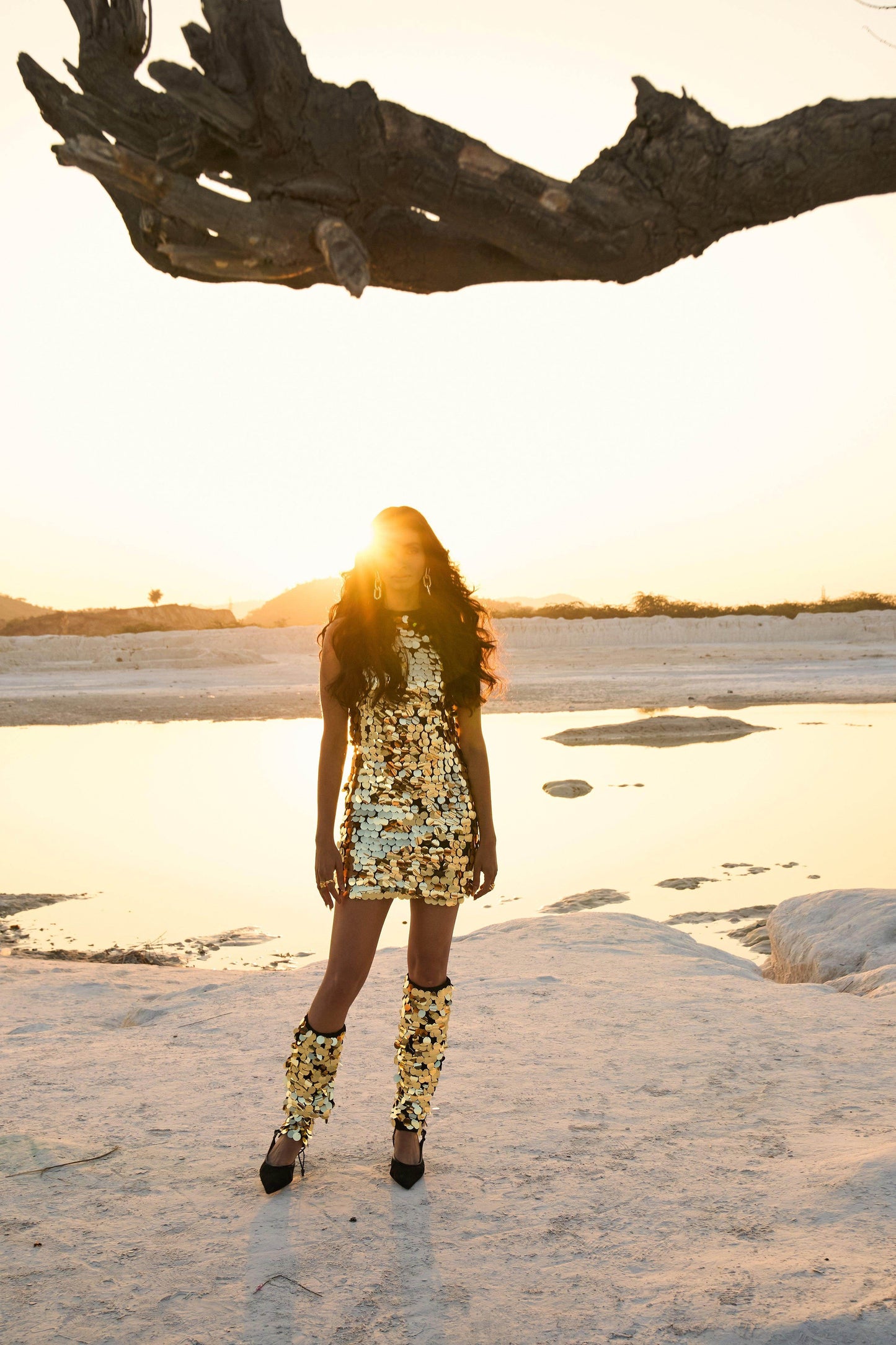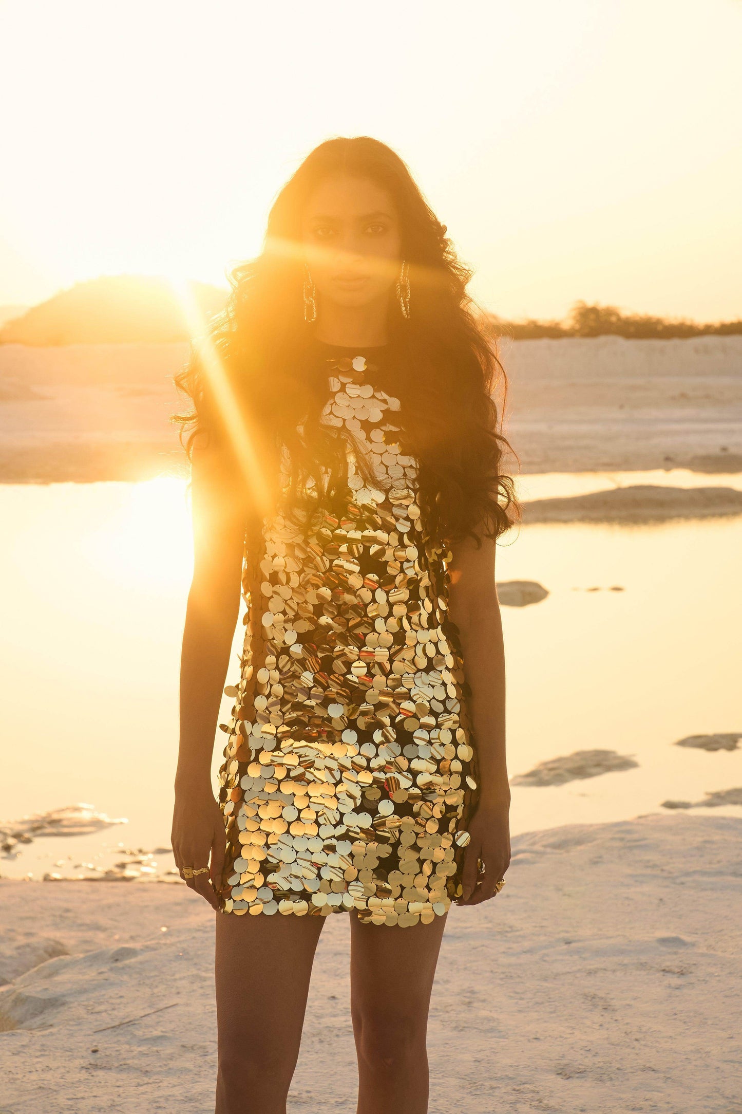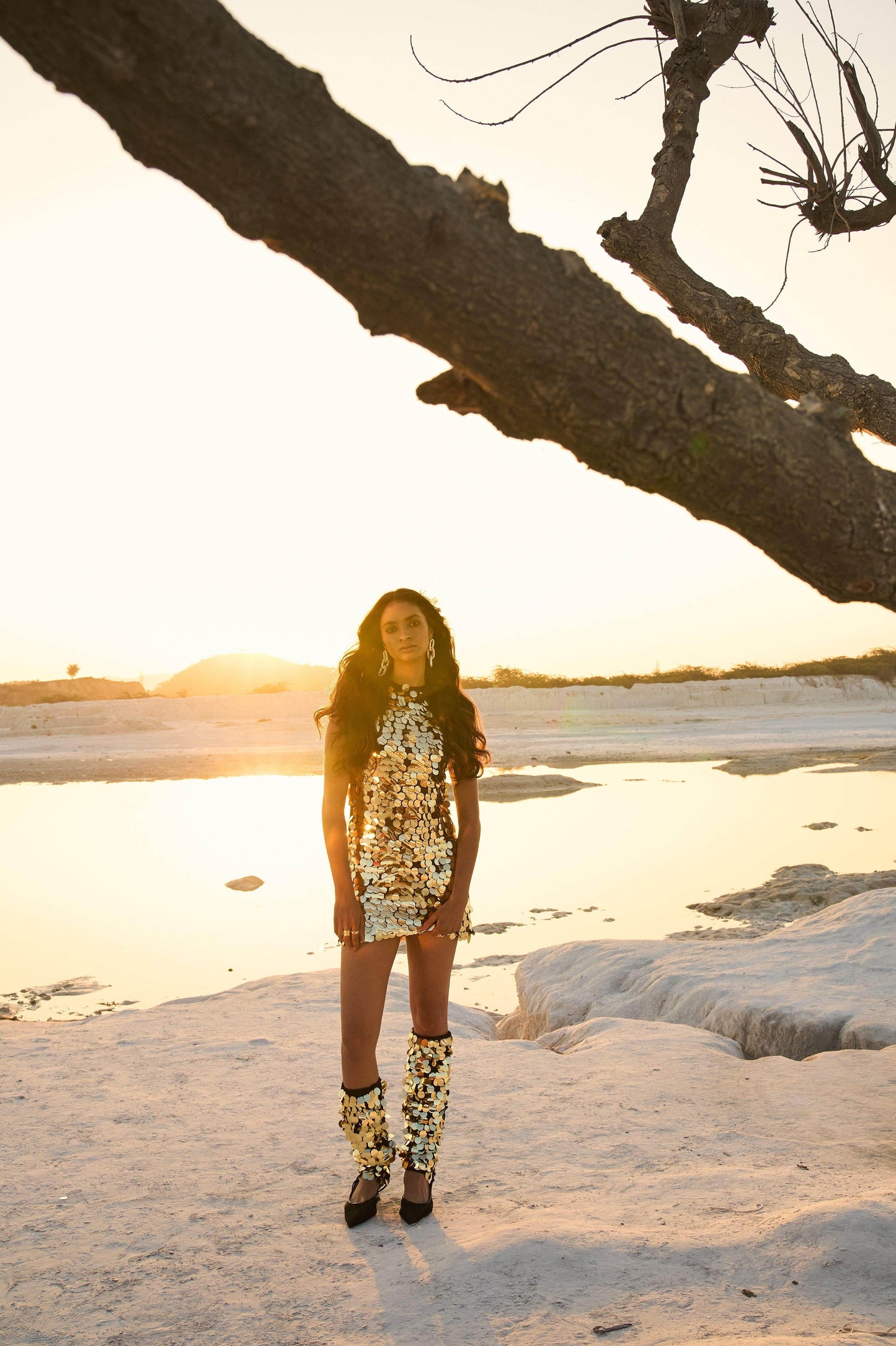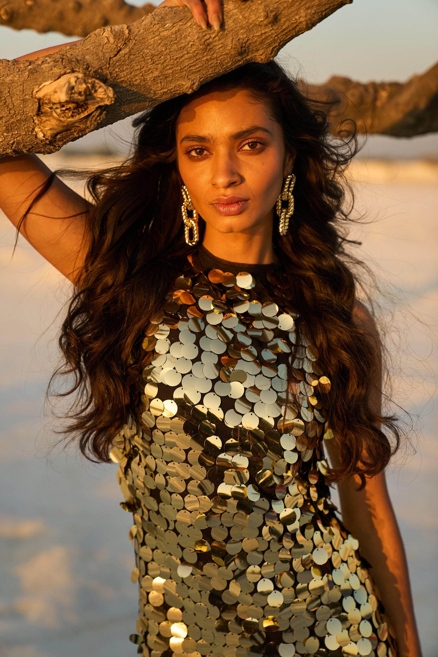 Gold paillette sleeveless mini dress with a high neck detail. Keyhole with button closure at the back. The garment is fully lined. Paired with gold paillette leg warmers with stretch knitted base.