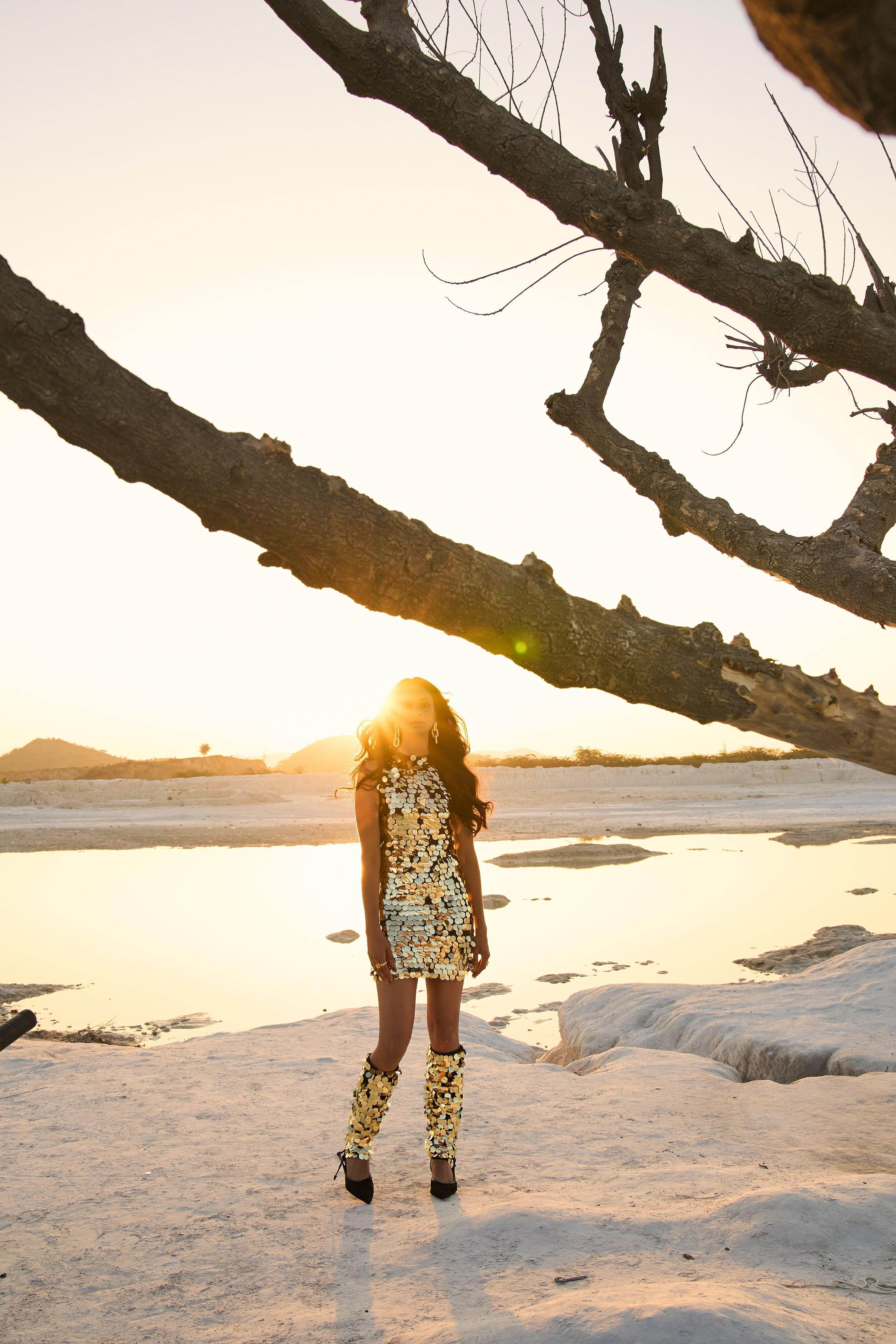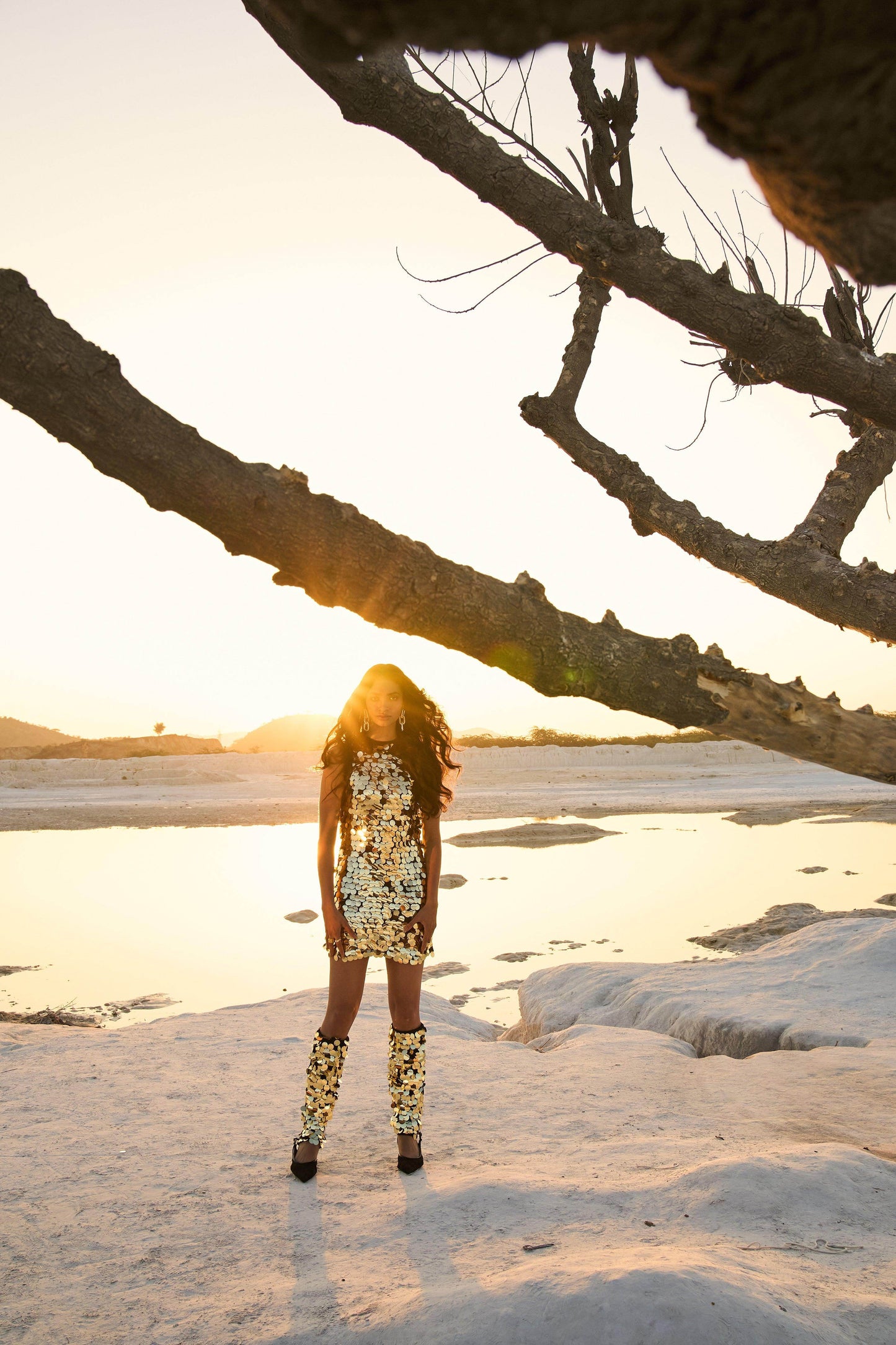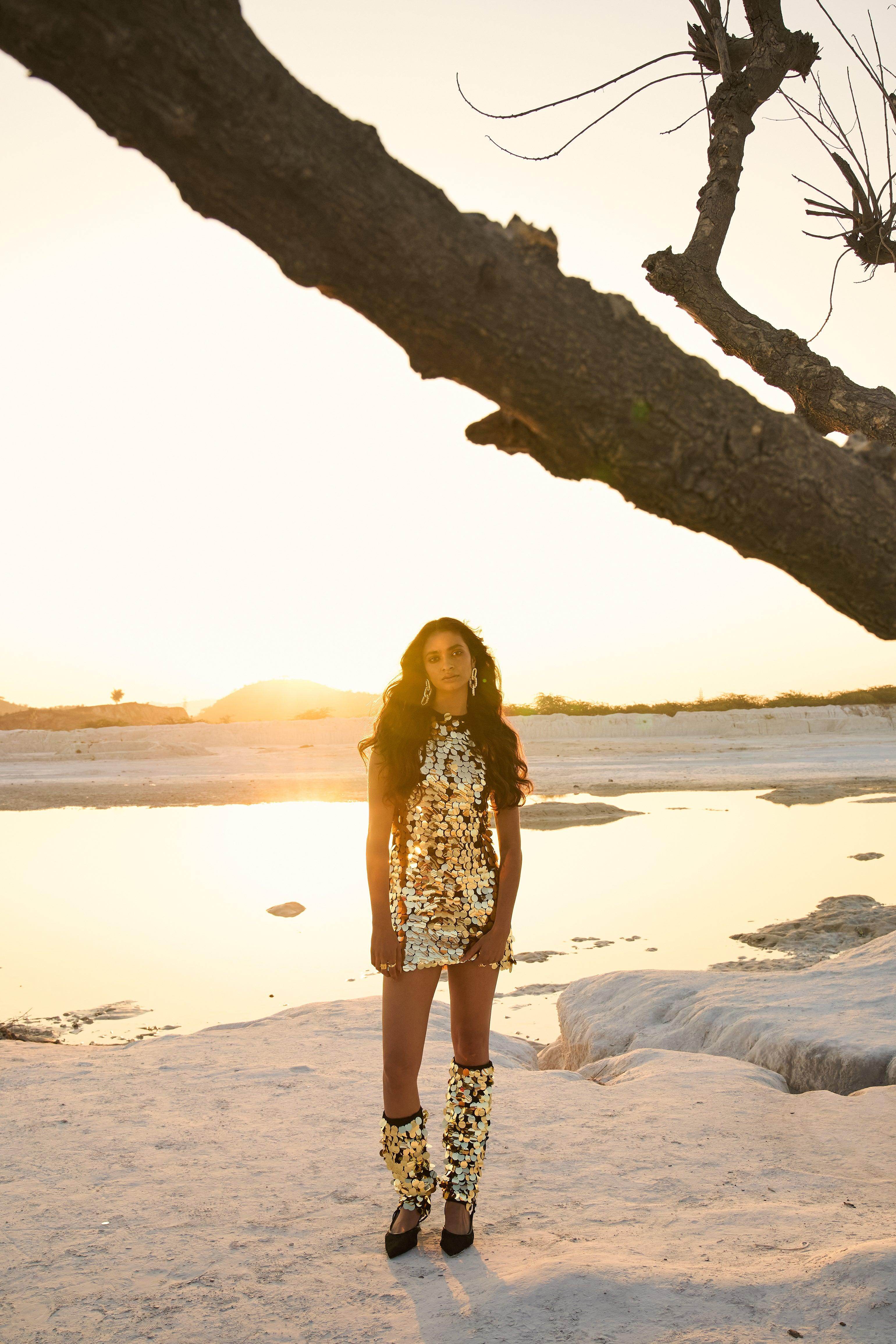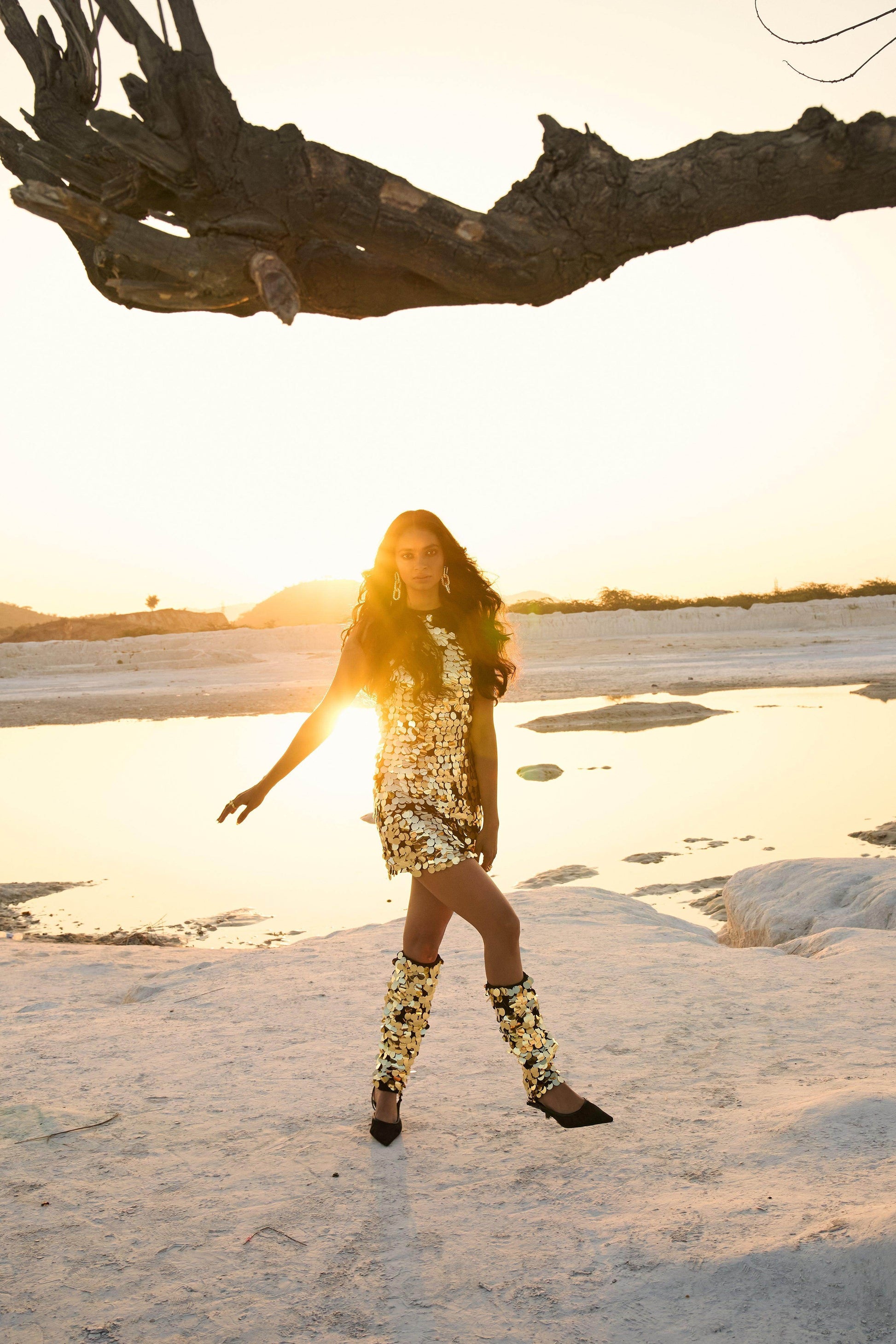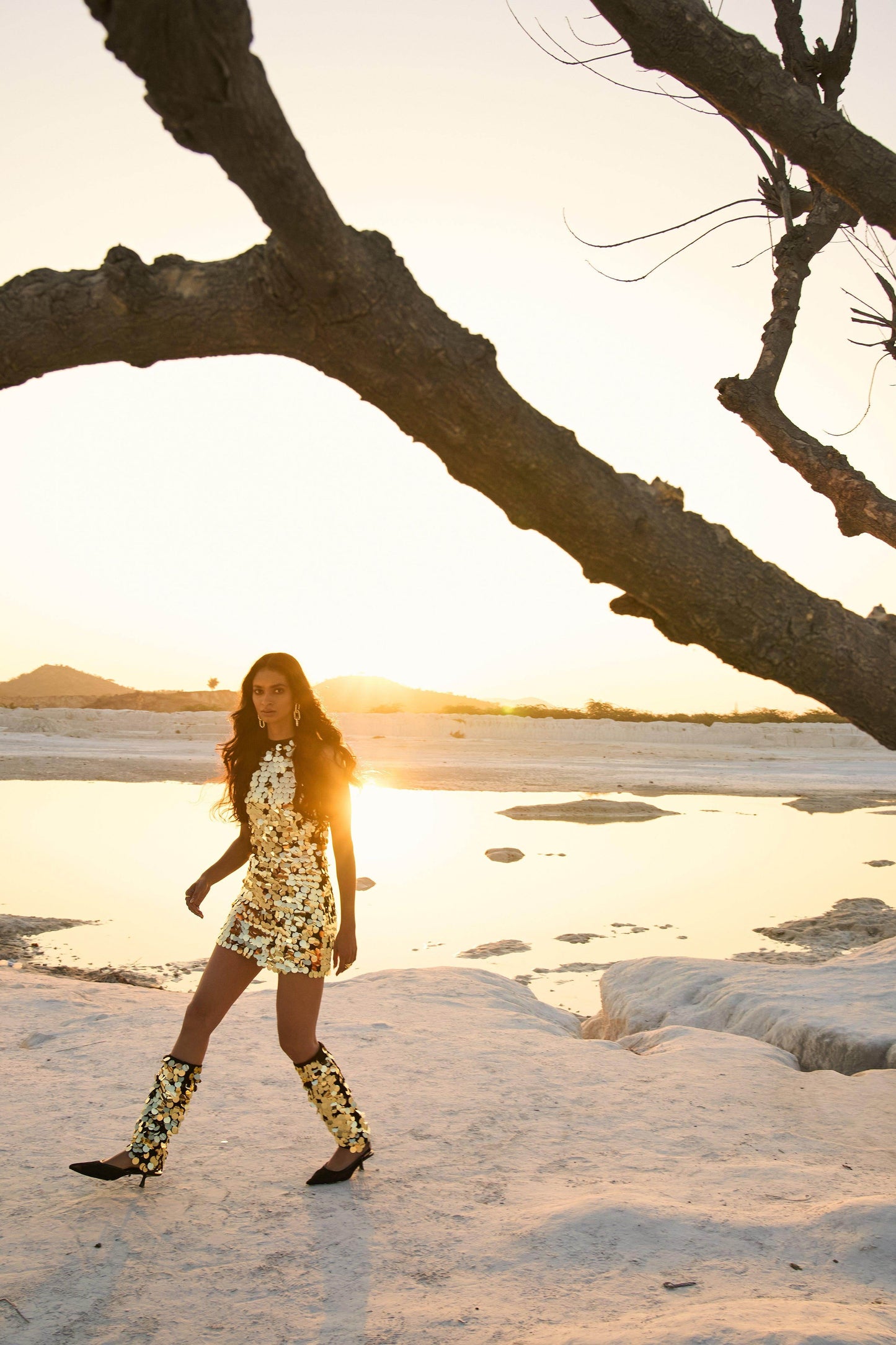 Gold paillette sleeveless mini dress with a high neck detail. Keyhole with button closure at the back. The garment is fully lined. Paired with gold paillette leg warmers with stretch knitted base.