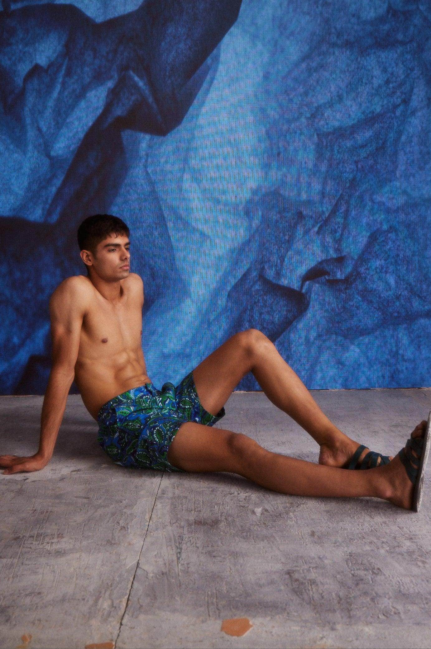 Allover paisley printed shorts set in tones of blue and green. Half sleeve shirt with concealed button placket. Paired with matching shorts. Snap metal button closure at the front, zip fly. Elasticated at the waist. Pockets on the sides and back.