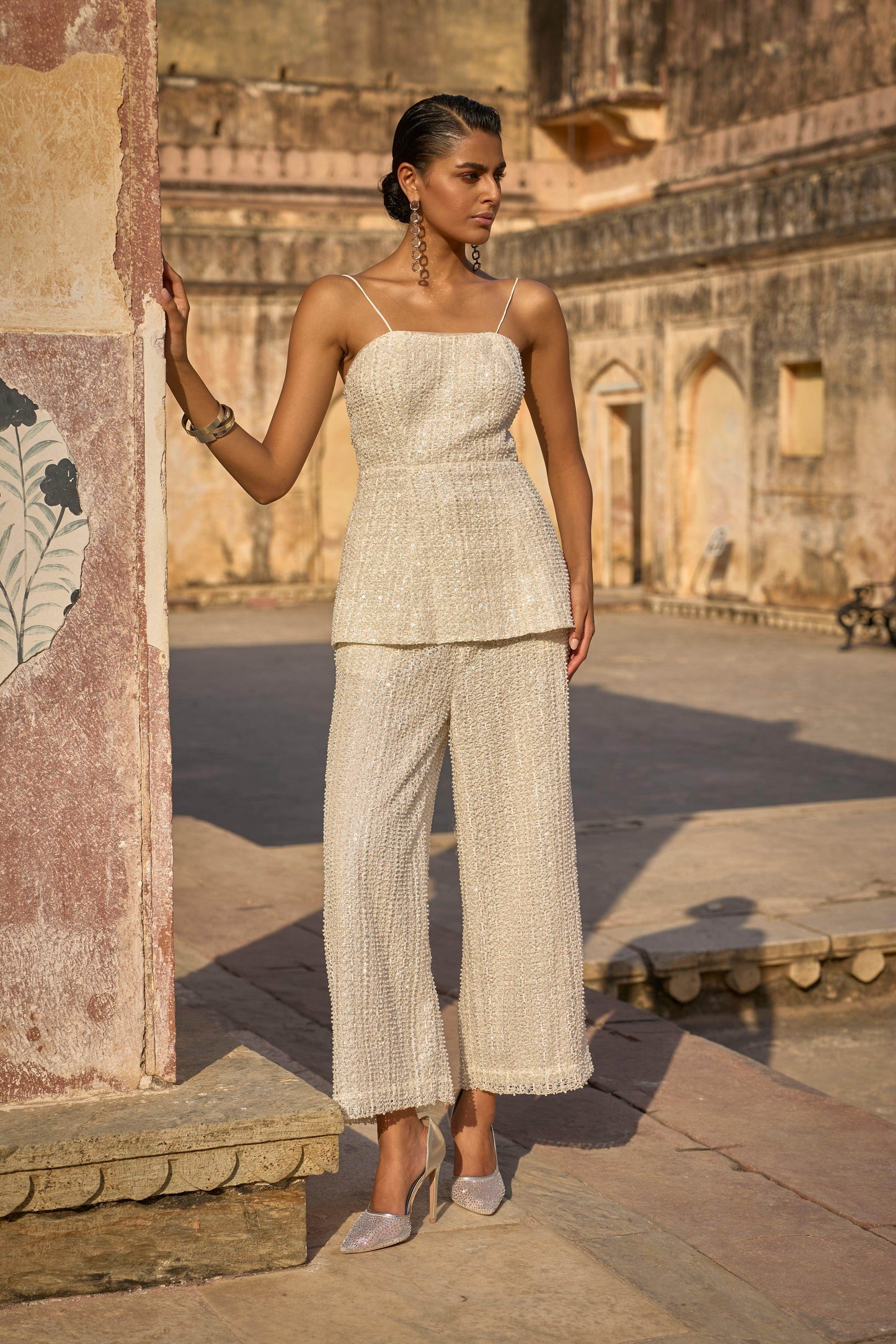 Ivory top with pearl, sequin and bead embroidery placed on a foiled patterned mesh. Corset-inspired peplum style off-shoulder top with a sweetheart neckline comes with detachable straps. Removable pad pockets in the front, full zip closure at the back. The garment is fully lined. Paired with matching wide-legged pants. Semi-elasticated at the waist and has pockets on the side. Hook-eye and zip closure at the front. The garment is fully lined.