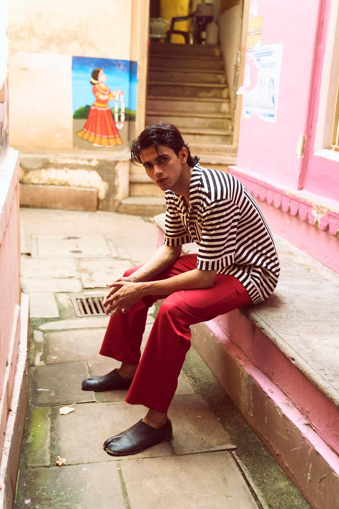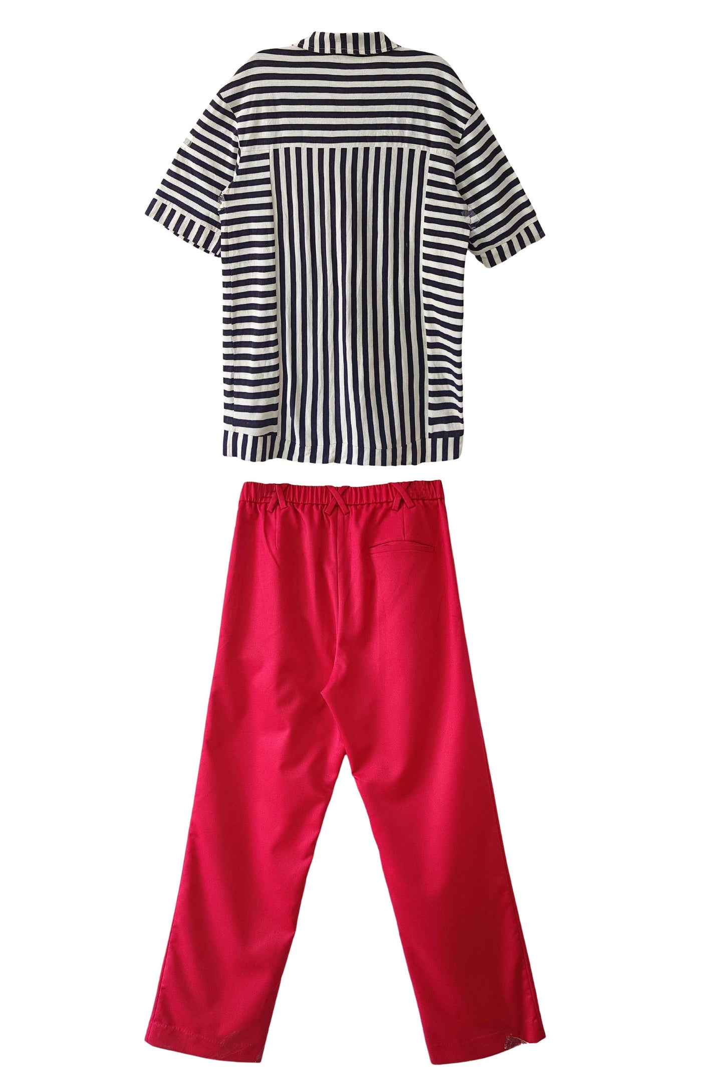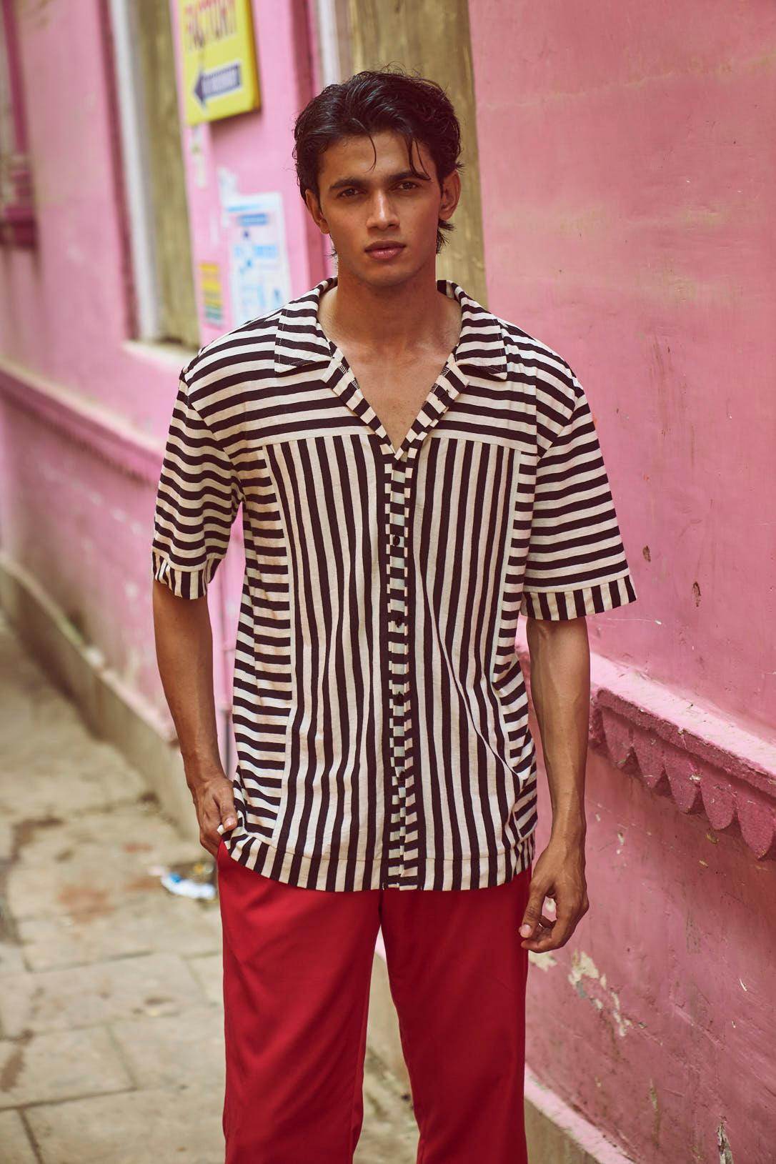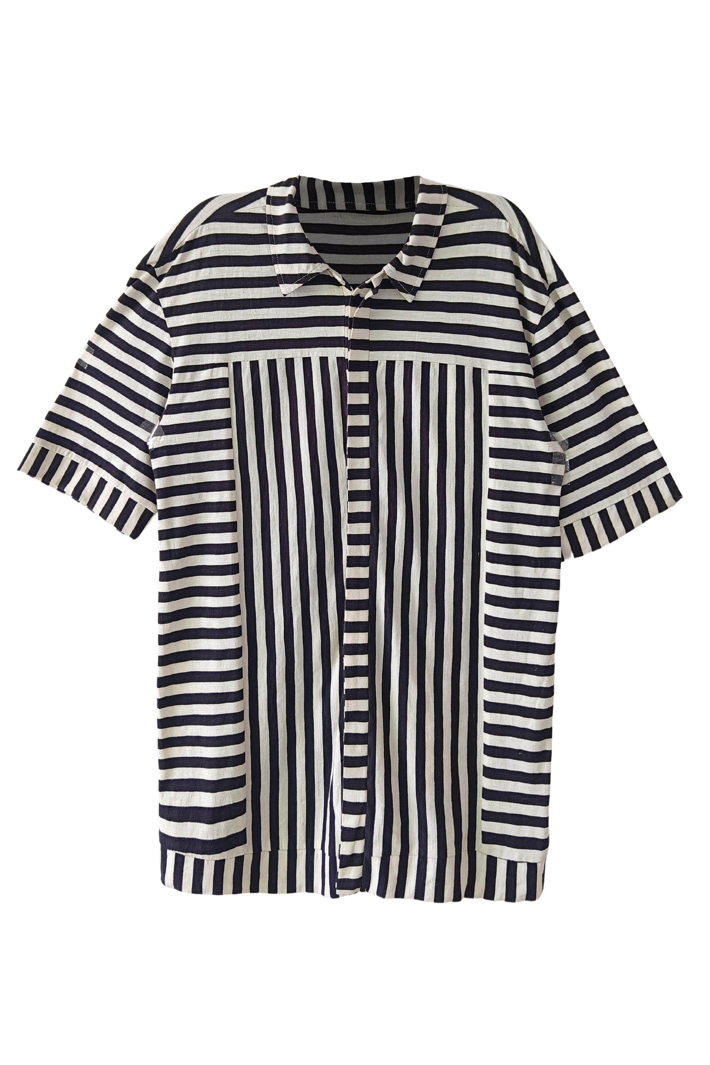 Black and white stripe short-sleeve shirt in knitted fabric. Placement stripes in horizontal and vertical patterns. Concealed placket, half sleeves. Regular fit.